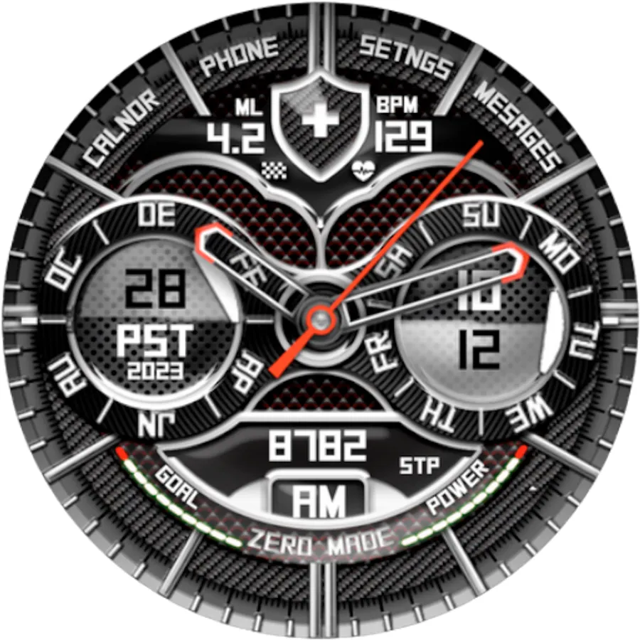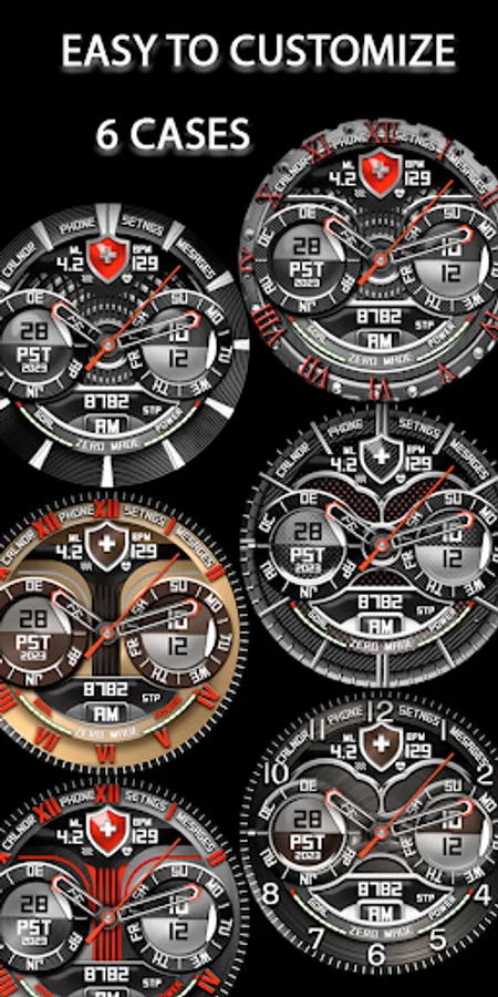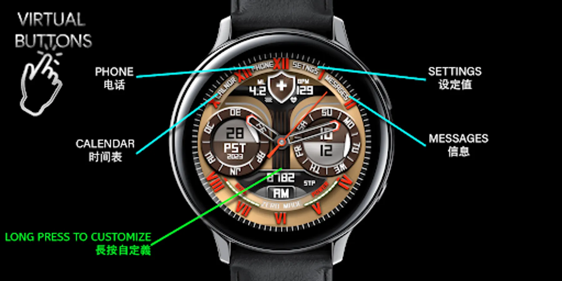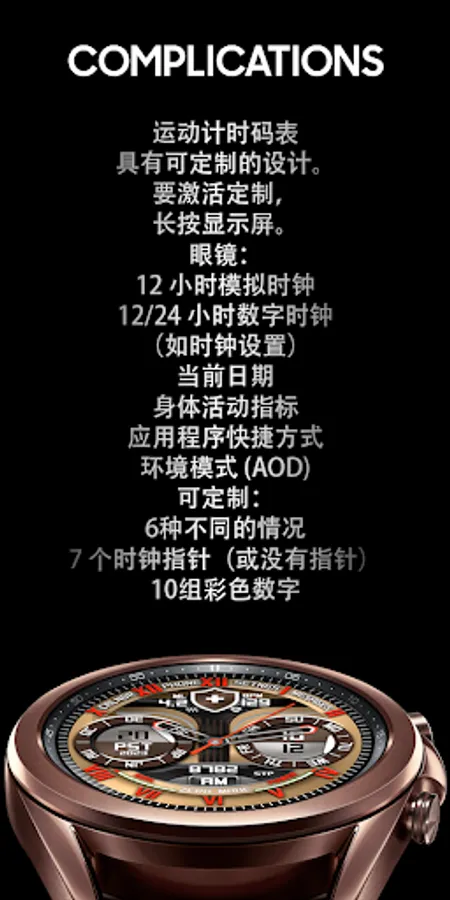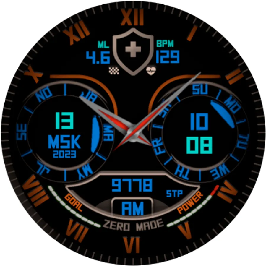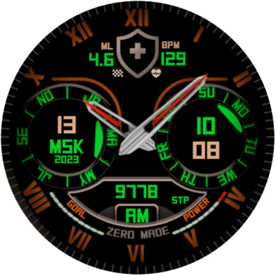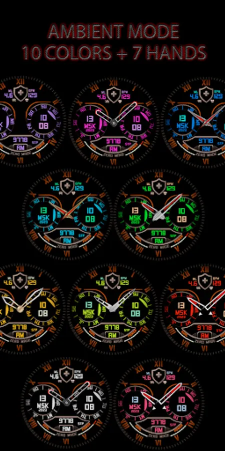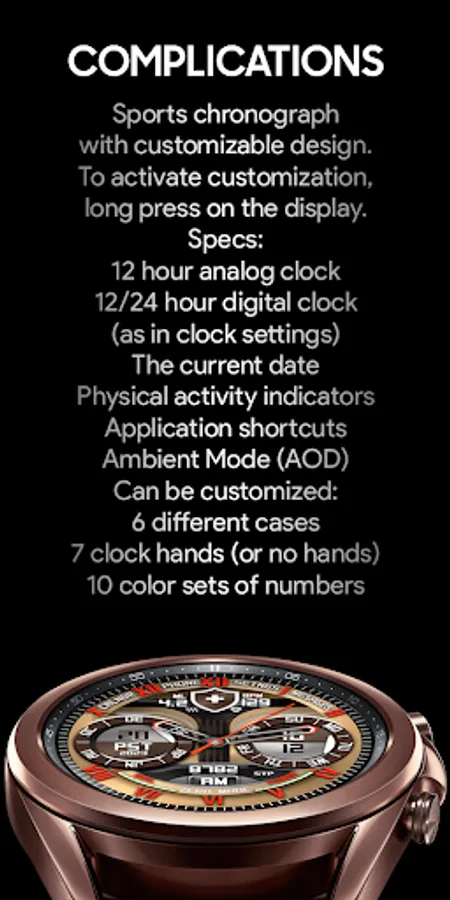 To activate the setting, press and hold your finger on the display. In the menu that appears, you can select for the Normal mode: chronograph case, set of hands, color scheme of numbers (common for the Normal mode and AOD mode), for the AOD mode, you can select a set of watch hands.