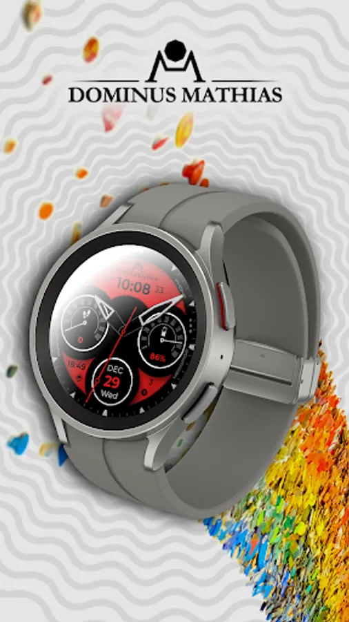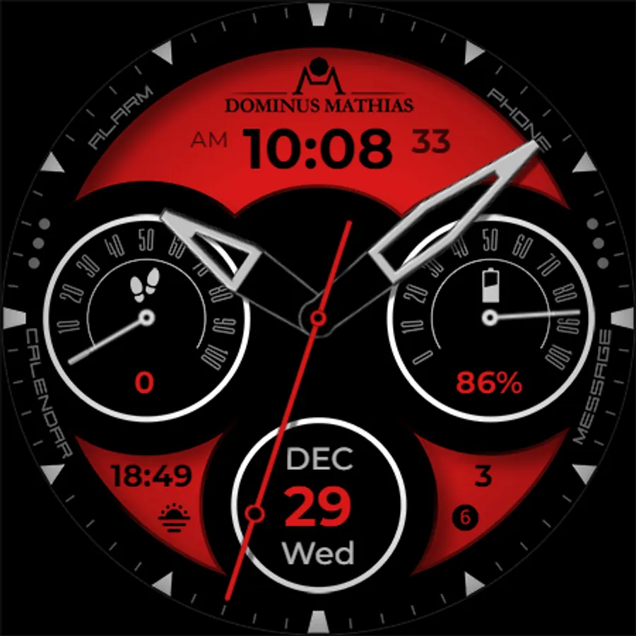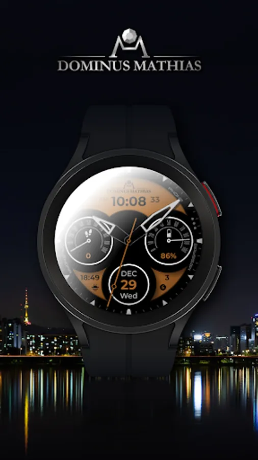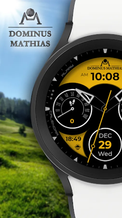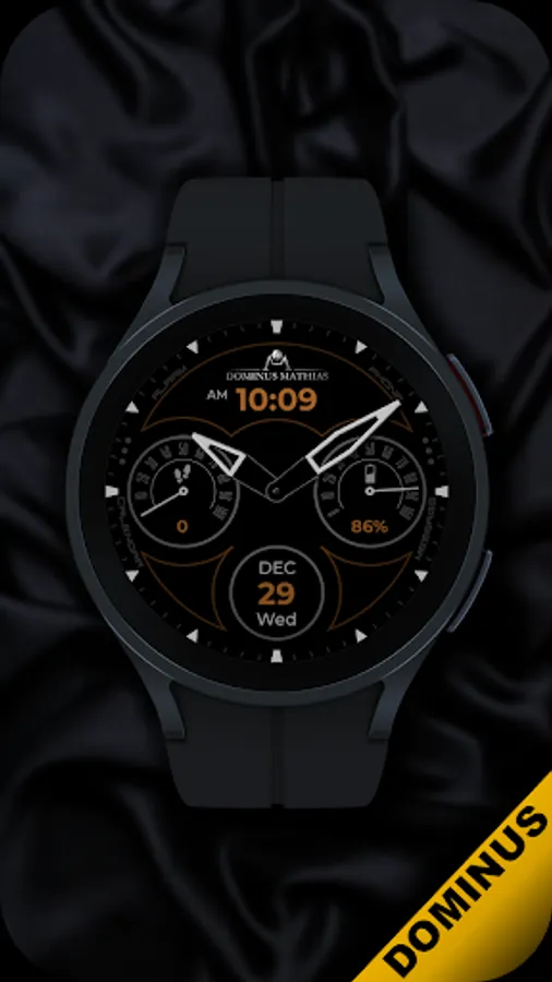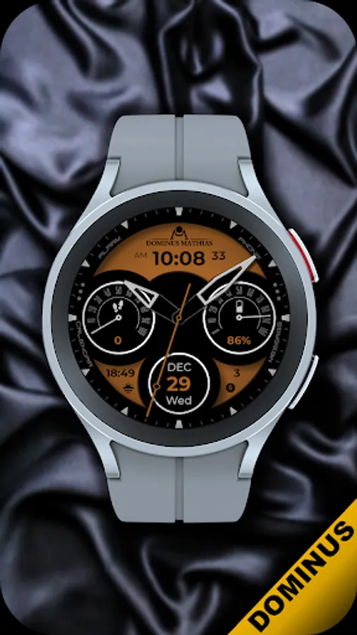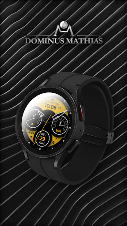 Unique designed watch face from Dominus Mathias. Enjoy the real power of this premium model. It contains all the most relevant complications as a time, date, health & fitness data.