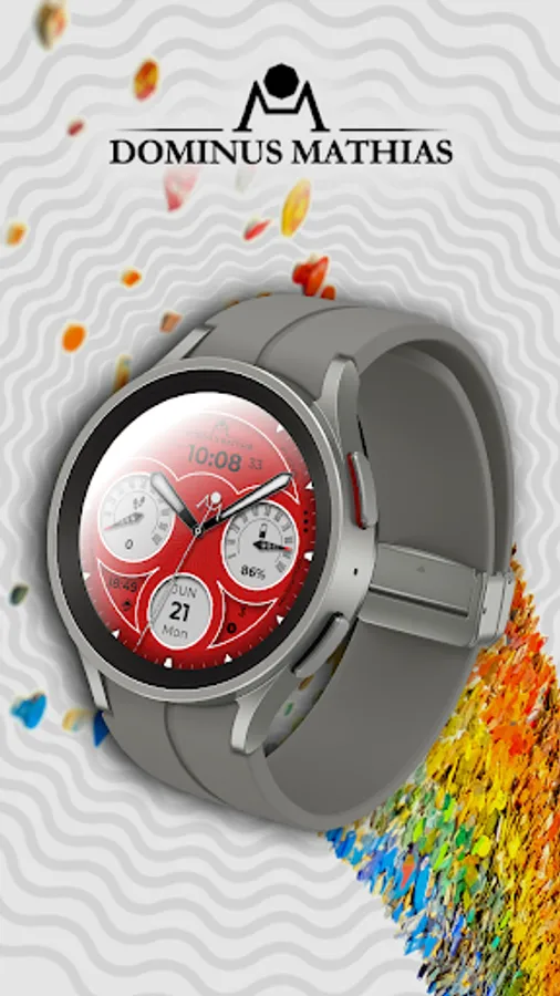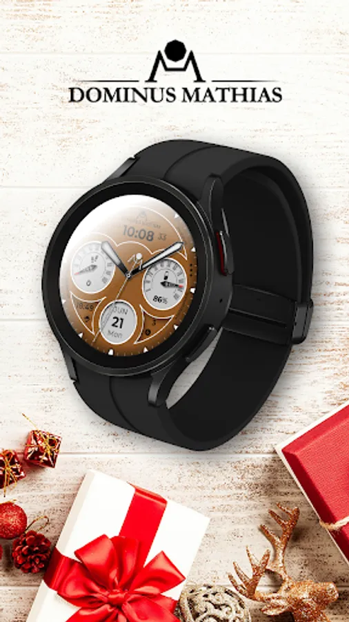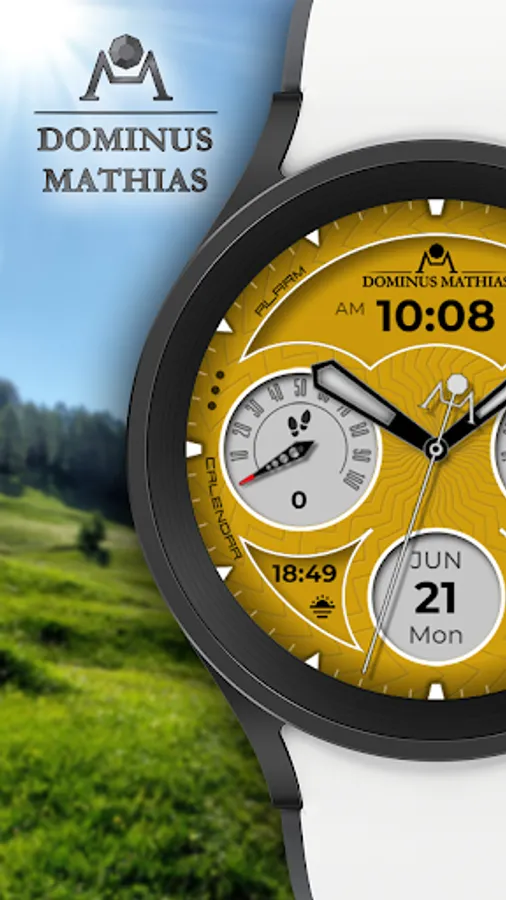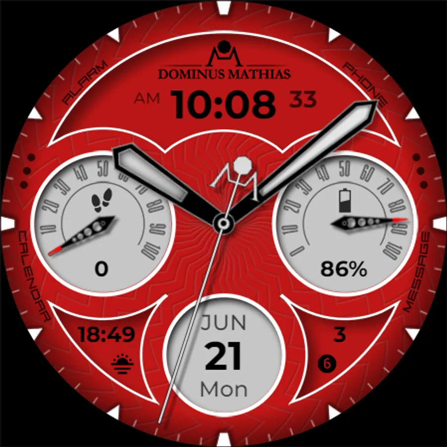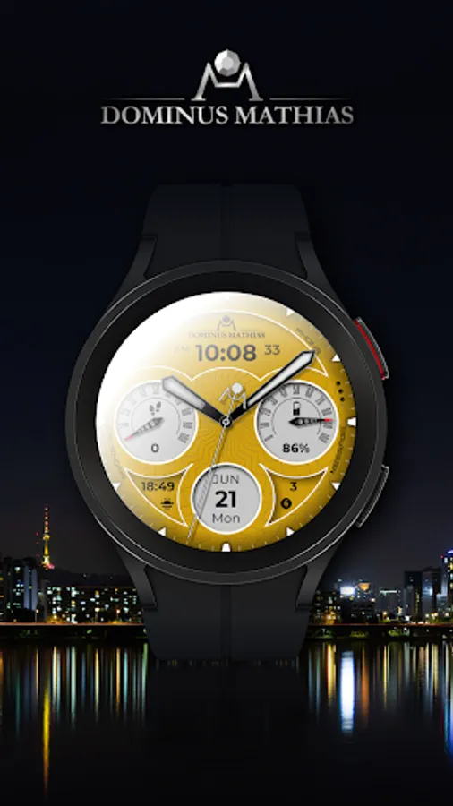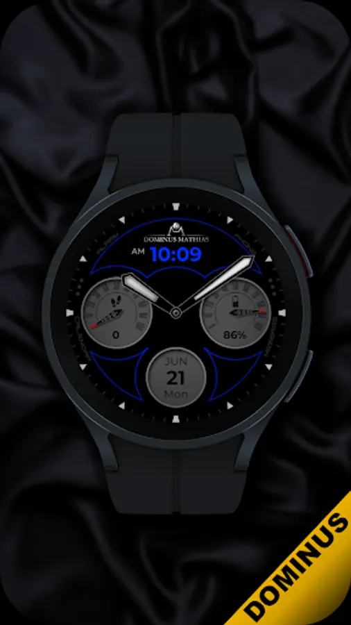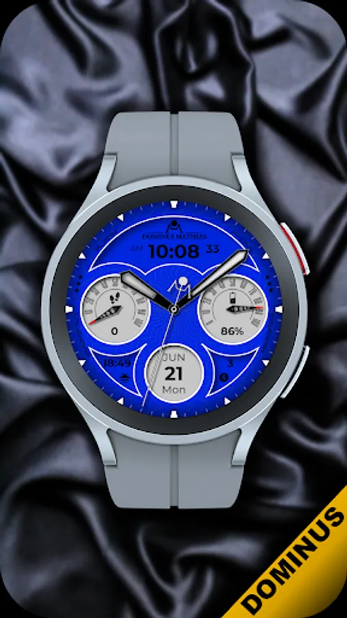 Unique designed watch face from Dominus Mathias. Enjoy the real power of this premium model. It contains all the most relevant complications as a time, date, health & fitness data.