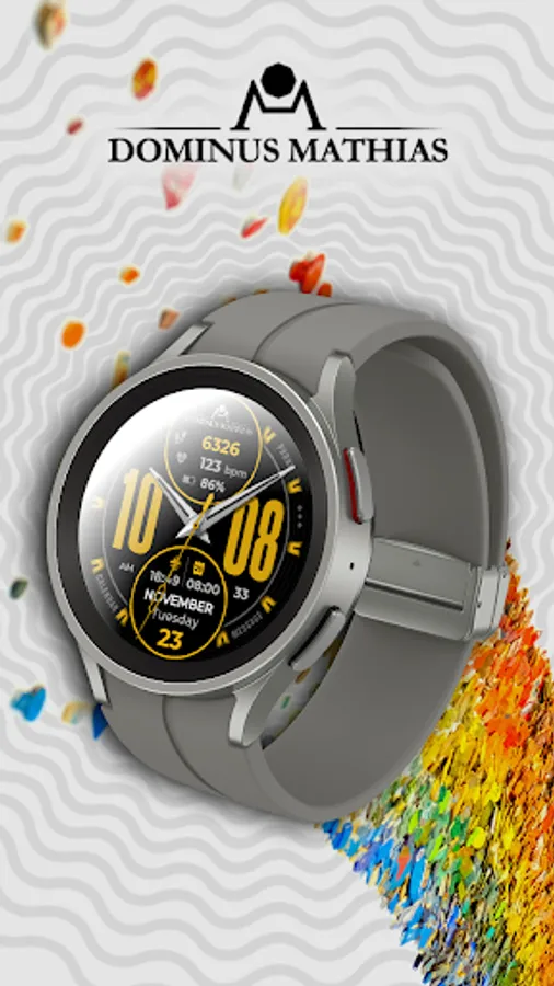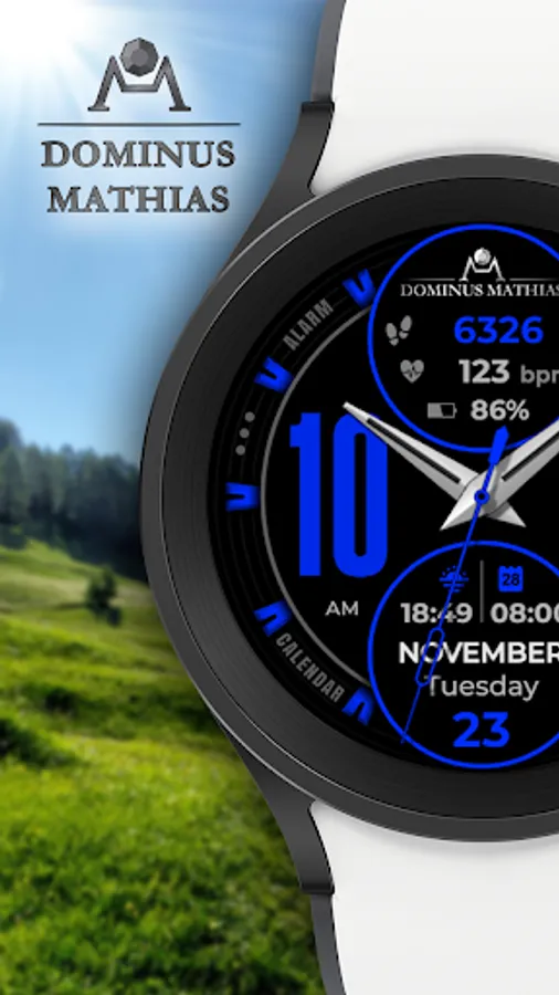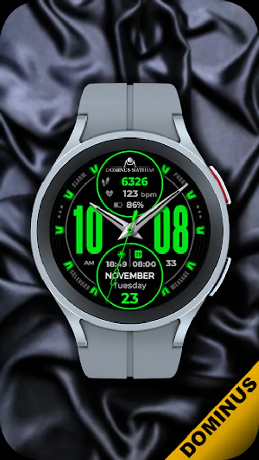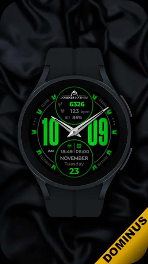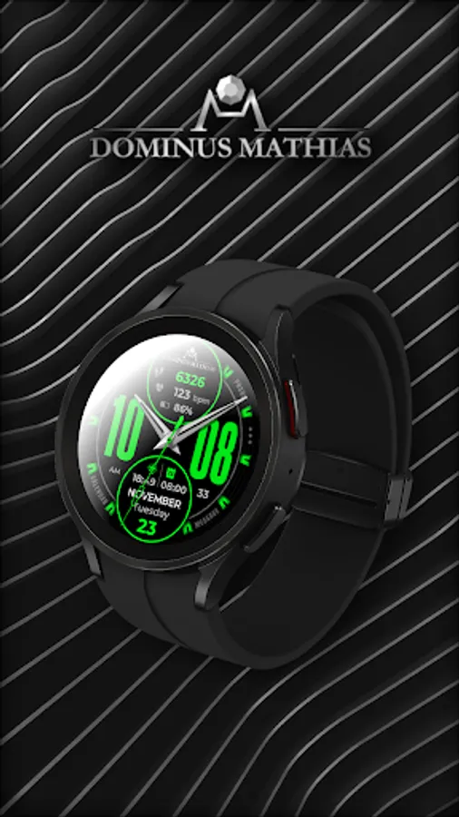 Unique designed watch face from Dominus Mathias. Enjoy the real power of this premium model. It contains all the most relevant complications as a time, date, health & fitness data.