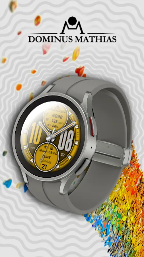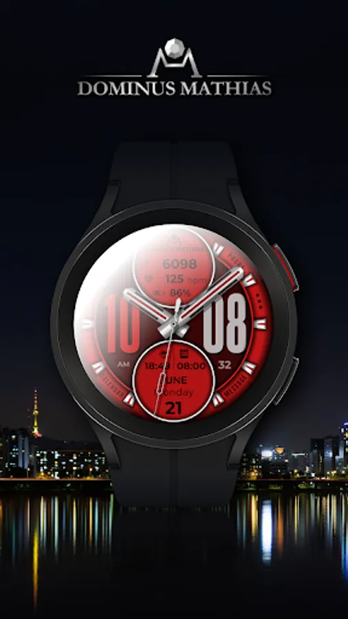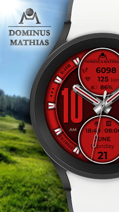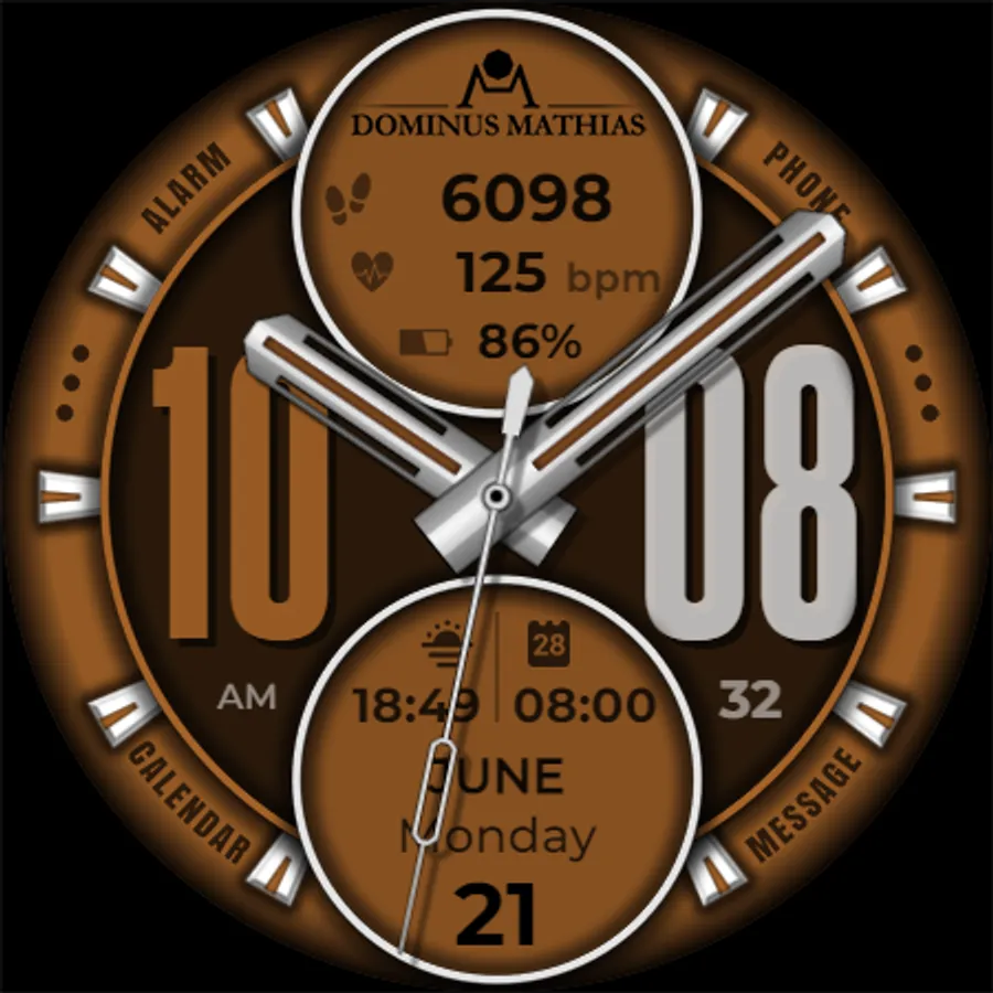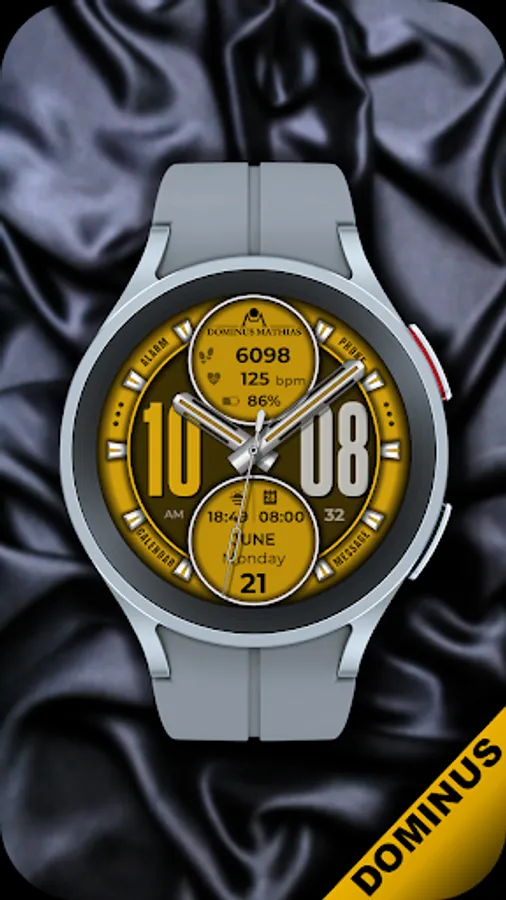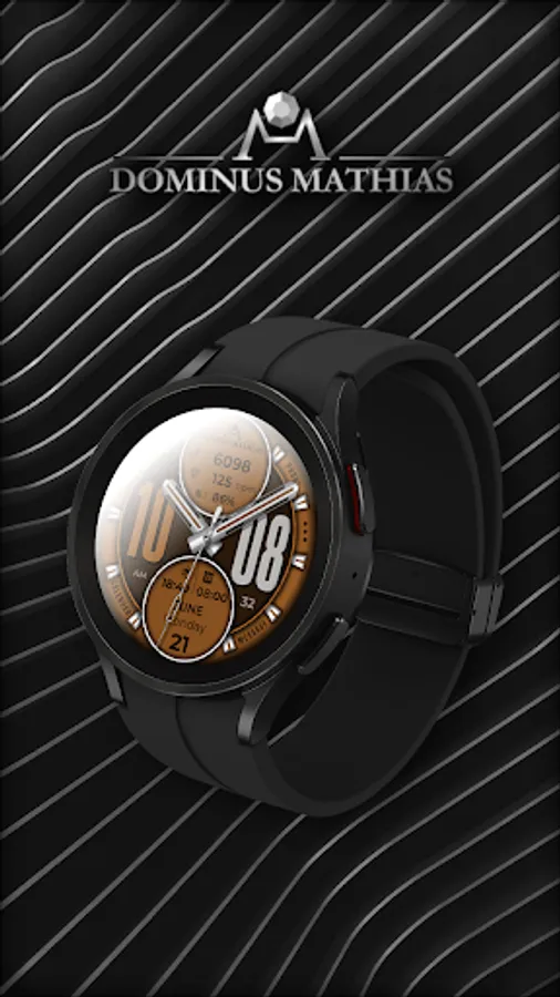 Unique designed watch face from Dominus Mathias. Enjoy the real power of this premium model. It contains all the most relevant complications as a time, date, health & fitness data.