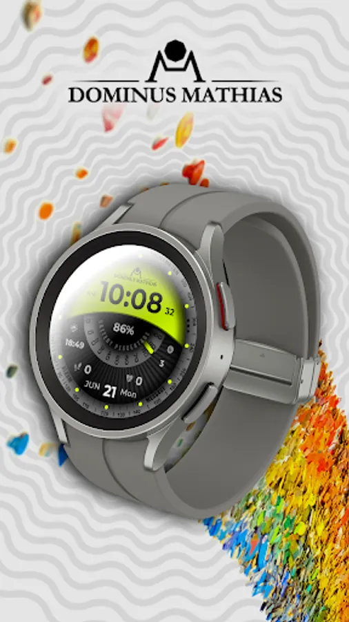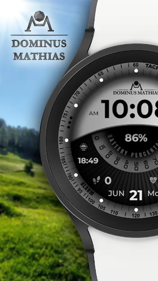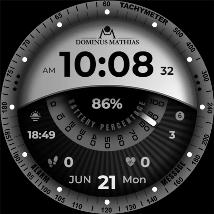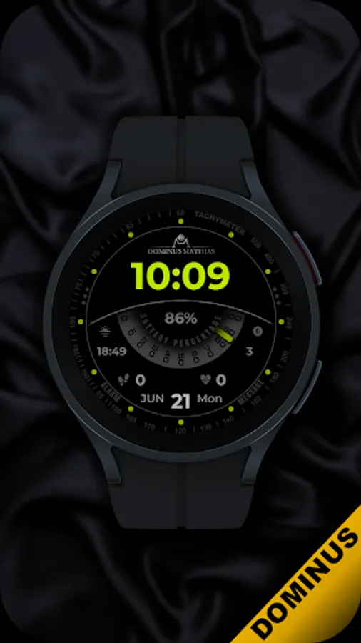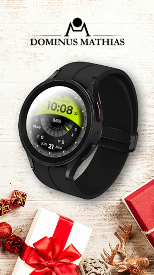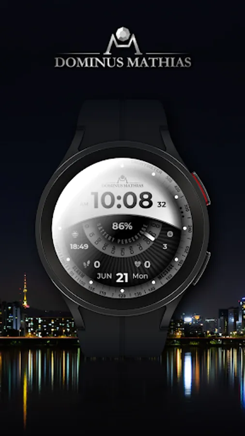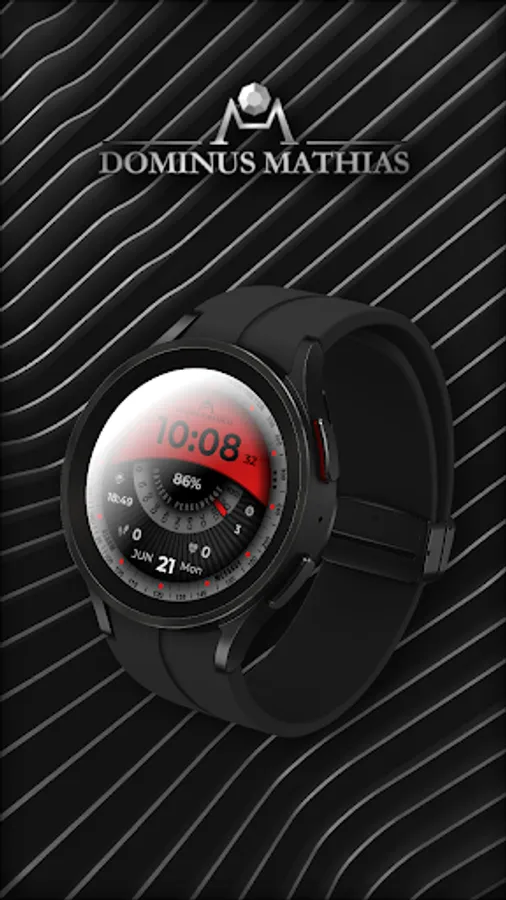 Unique designed watch face from Dominus Mathias. Enjoy the real power of this premium model. It contains all the most relevant complications as a time, date, health & fitness data.
