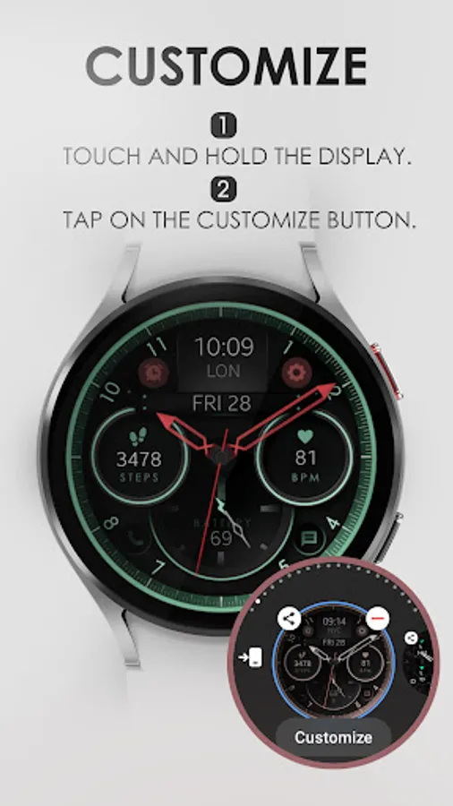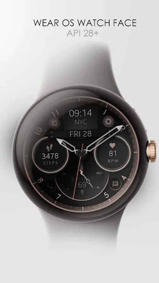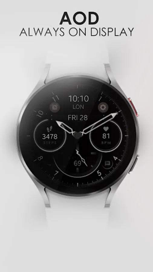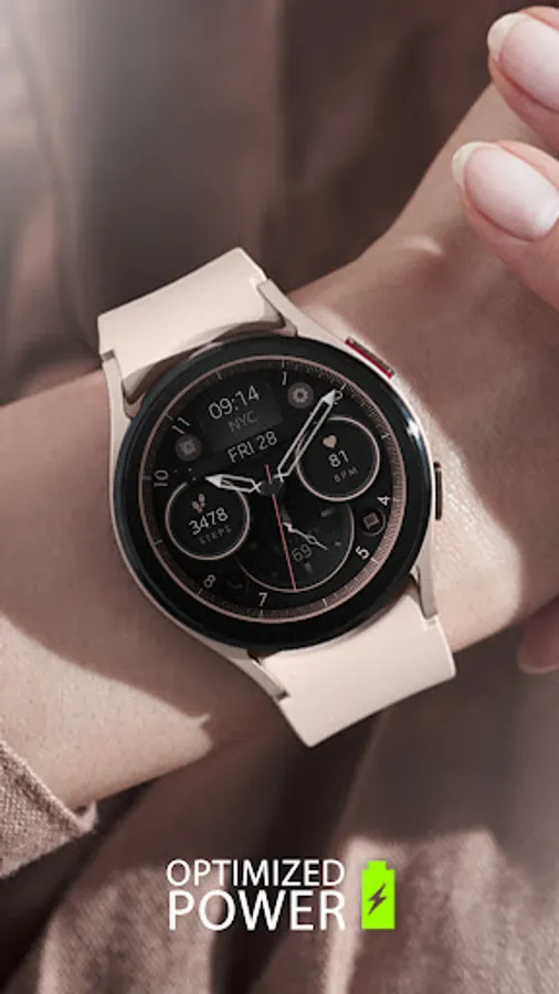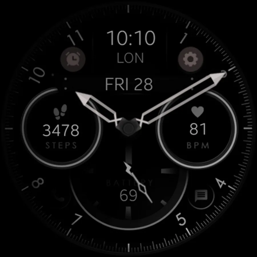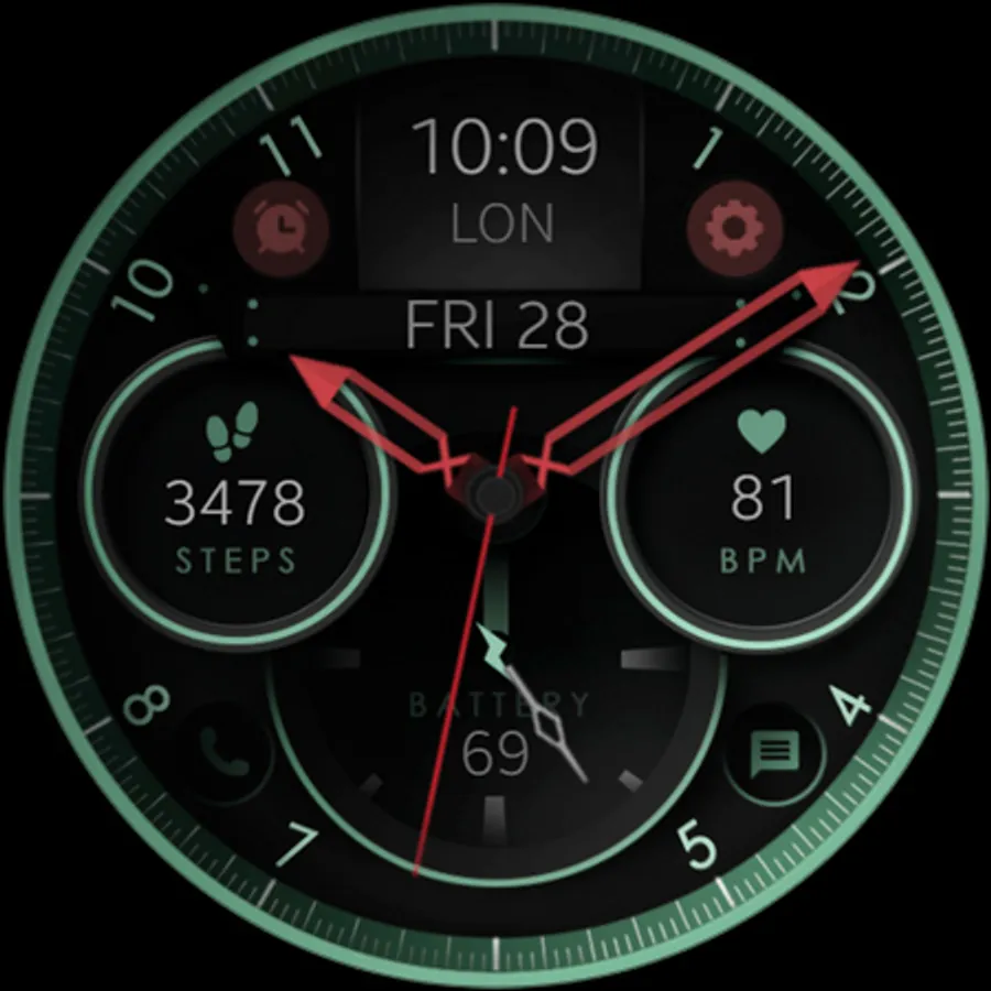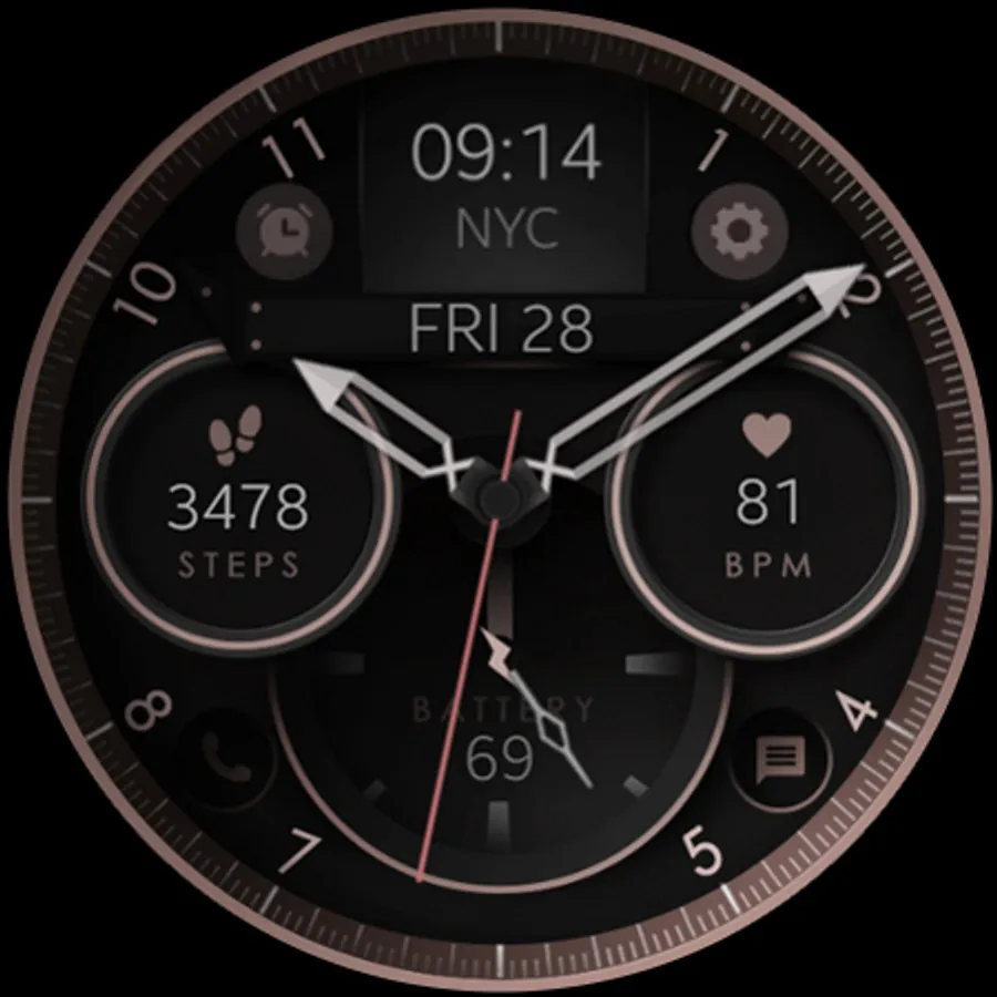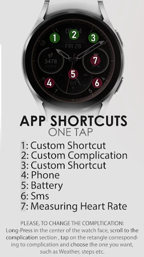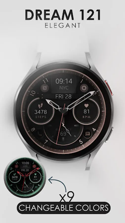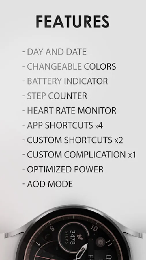 Elegant, sporty watch face with changeable colors, custom shortcuts and other functions.