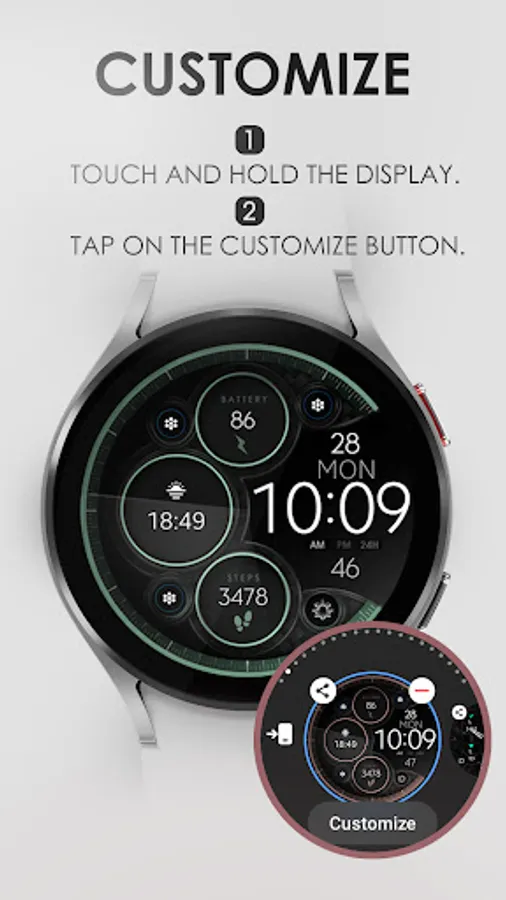 To customize your watch face, simply touch and hold the display, then tap on the Customize button. To add the weather complication, long press the center of the watch face, tap the Customize button, scroll to Complications, and tap the rectangle on the left, then tap Weather. Make sure to enable all permissions in the Settings -> Applications menu.