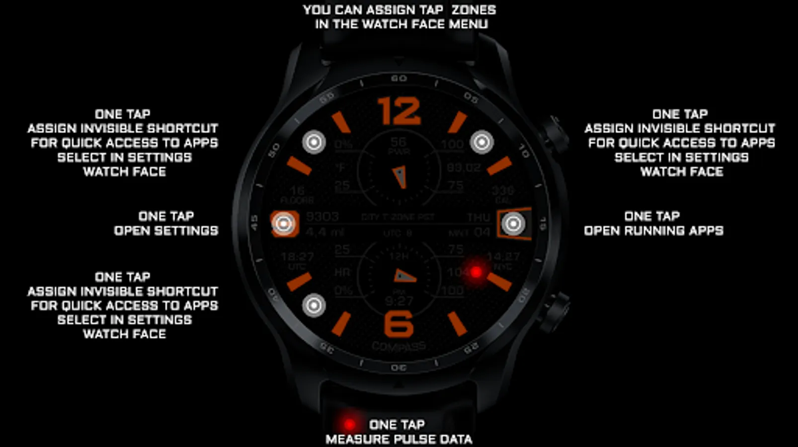 In the watch face available sports data, complications(data), visible & invisible shortcuts for quick access to apps.