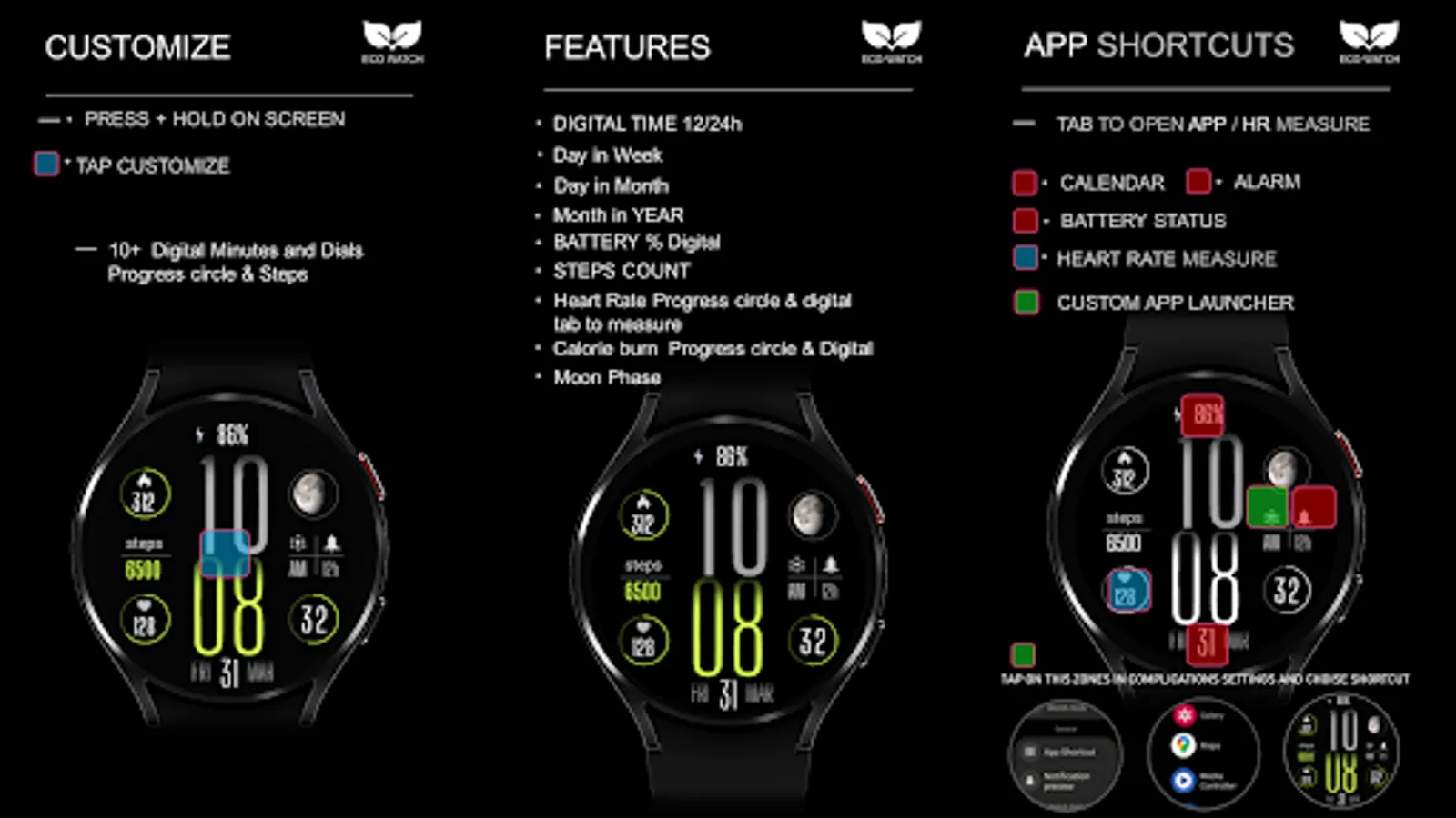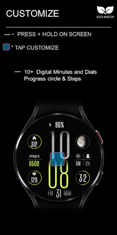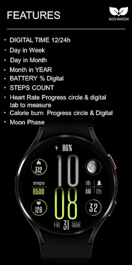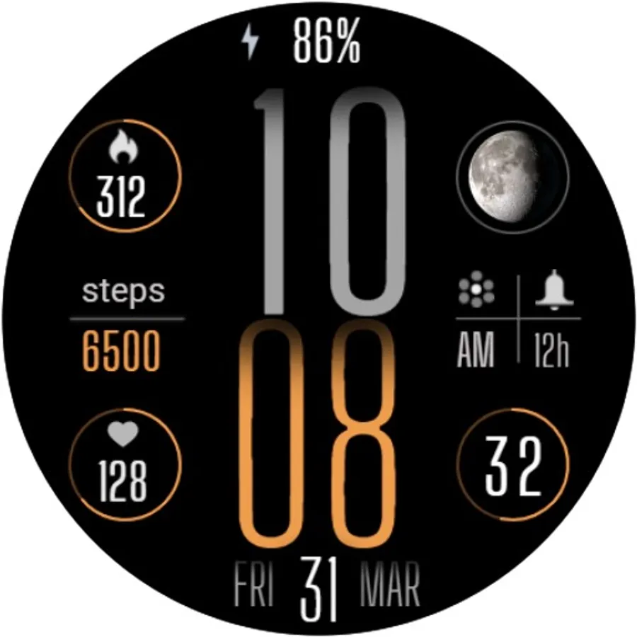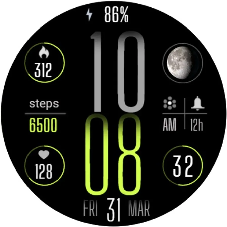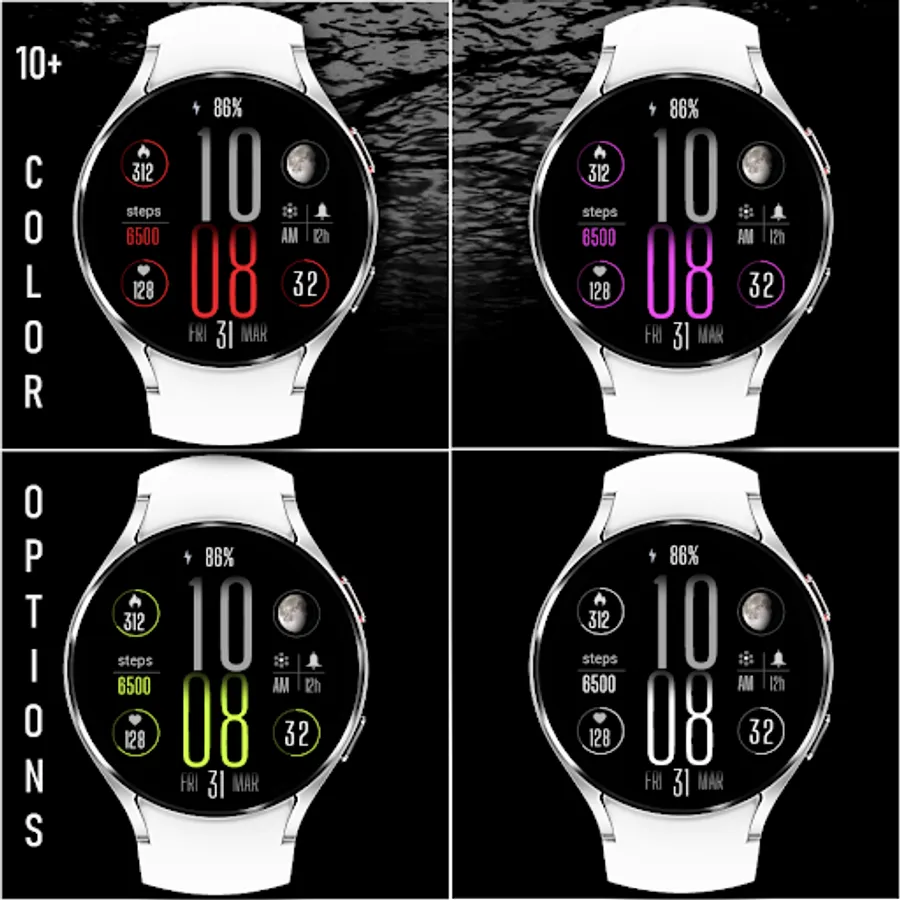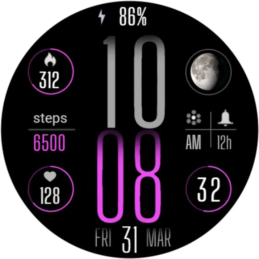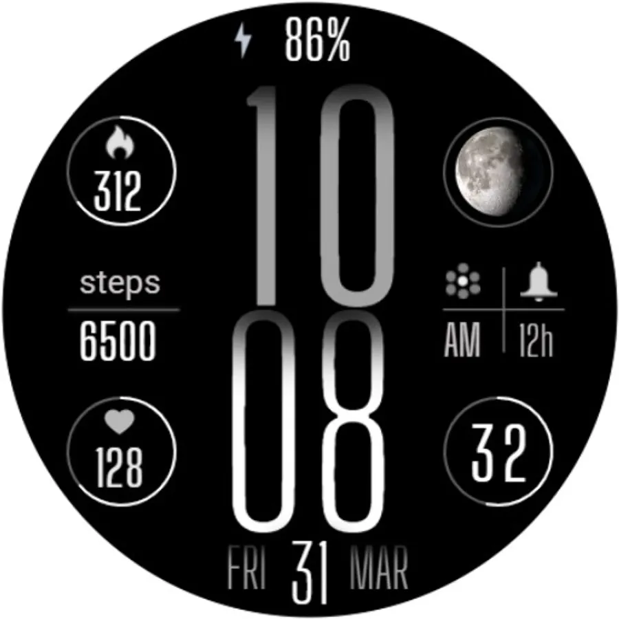 Minimal Simple & Battery Friendly Modern Digital Watch face. Sport & Health info.. This watch face is for all Digital fans who love a clean and elegant look. Very unique design and many functionalities as Digital time (with 3D shadow of time) Date info, battery percentage and Health info - steps Count, heart rate measure, Calorie burn, Moon phase