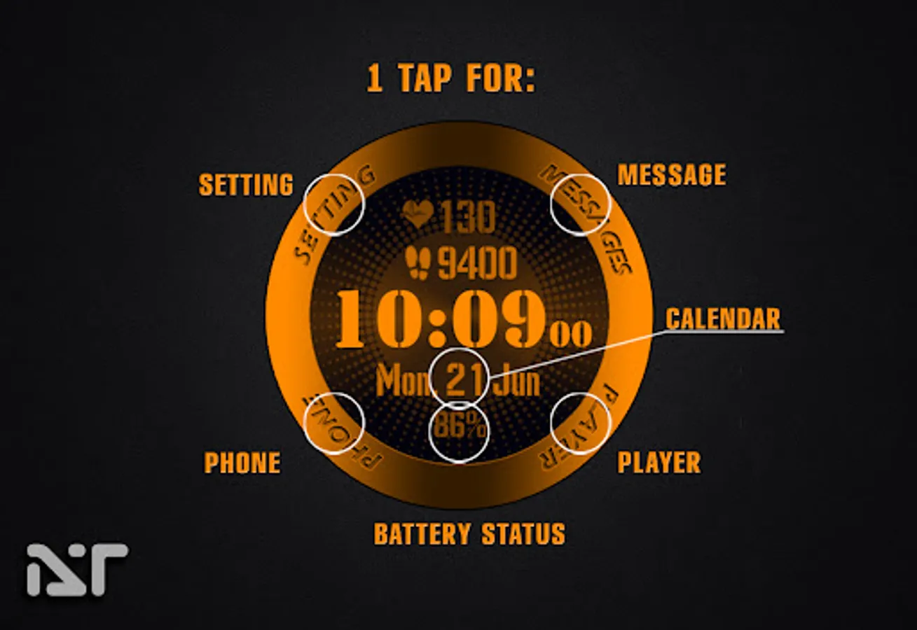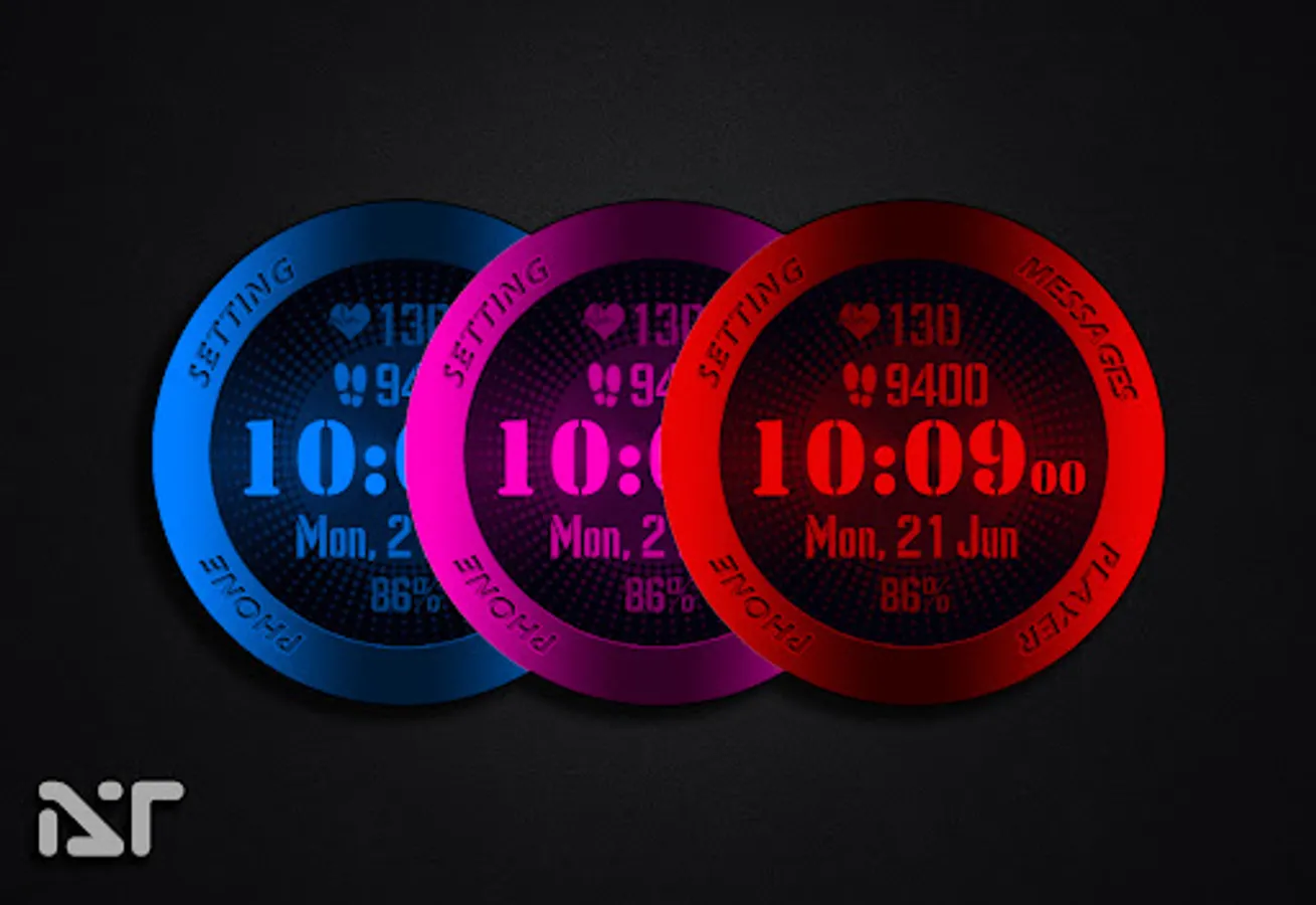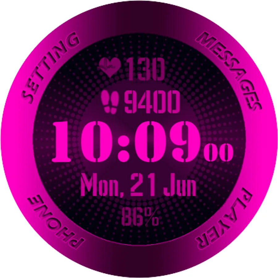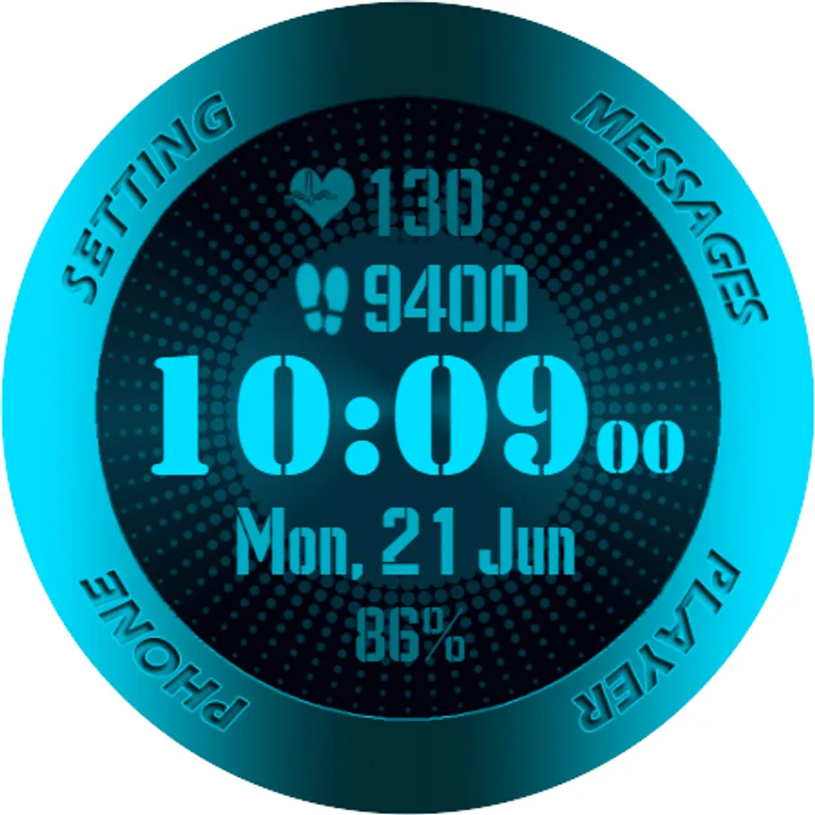 -Показ уровня заряда батареи, текущей даты, месяца, дня недели, количества пройденных шагов и величину пульса на главном экране
