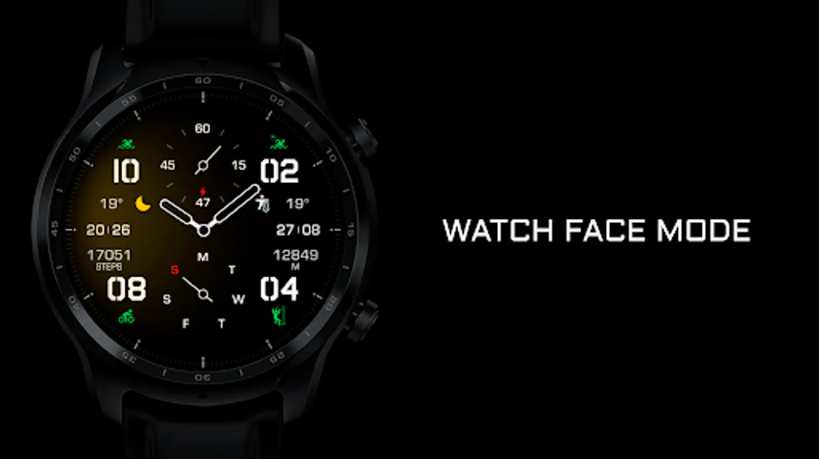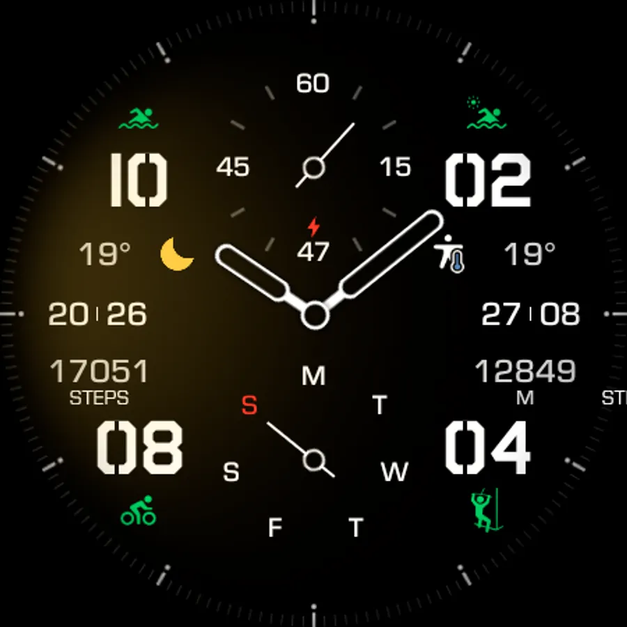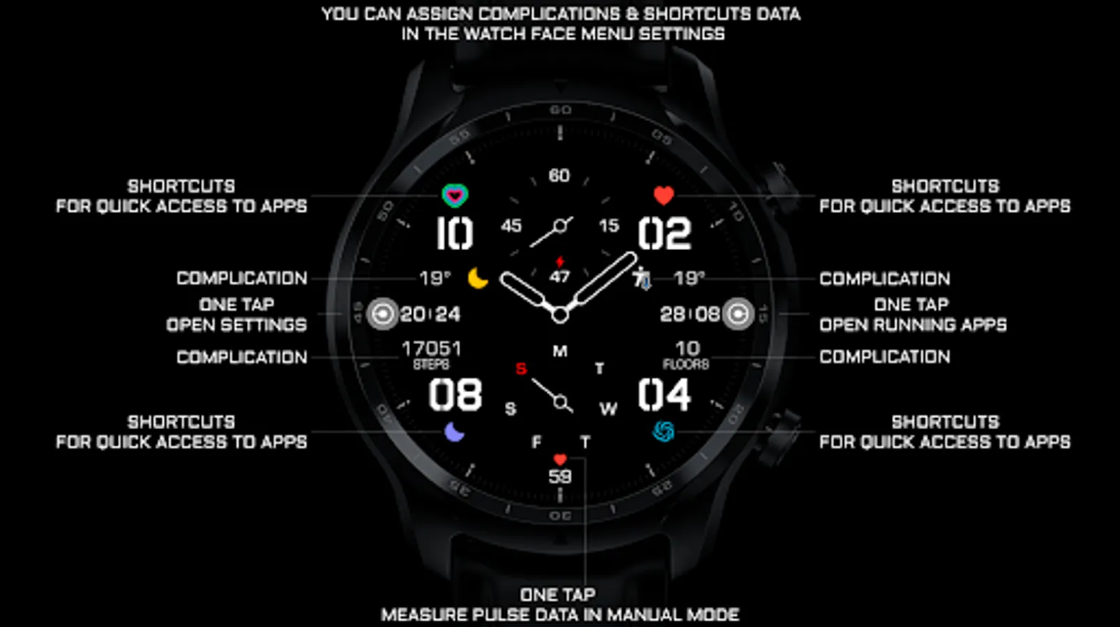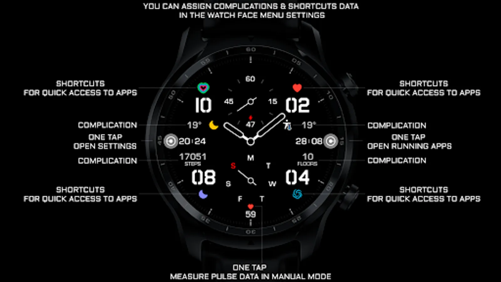 In the watch face available sports data, complications(data), visible shortcuts for quick access to apps.