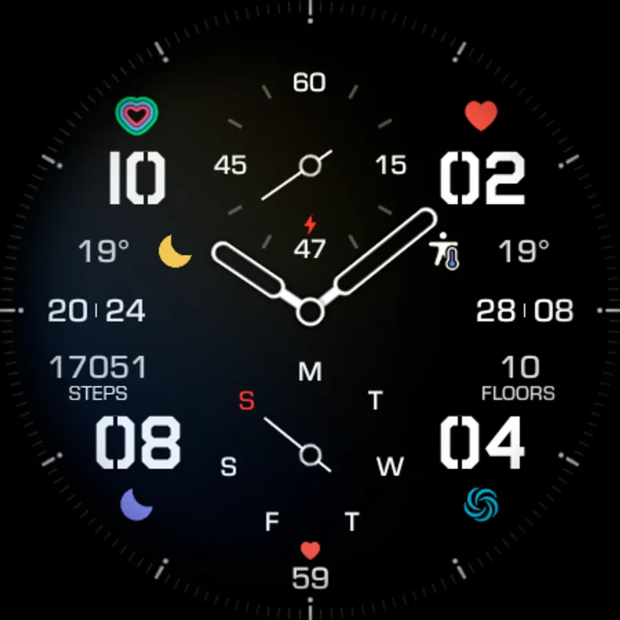 In the watch face settings you can change complications place, theme colors, show/hide info and some graphic elements.