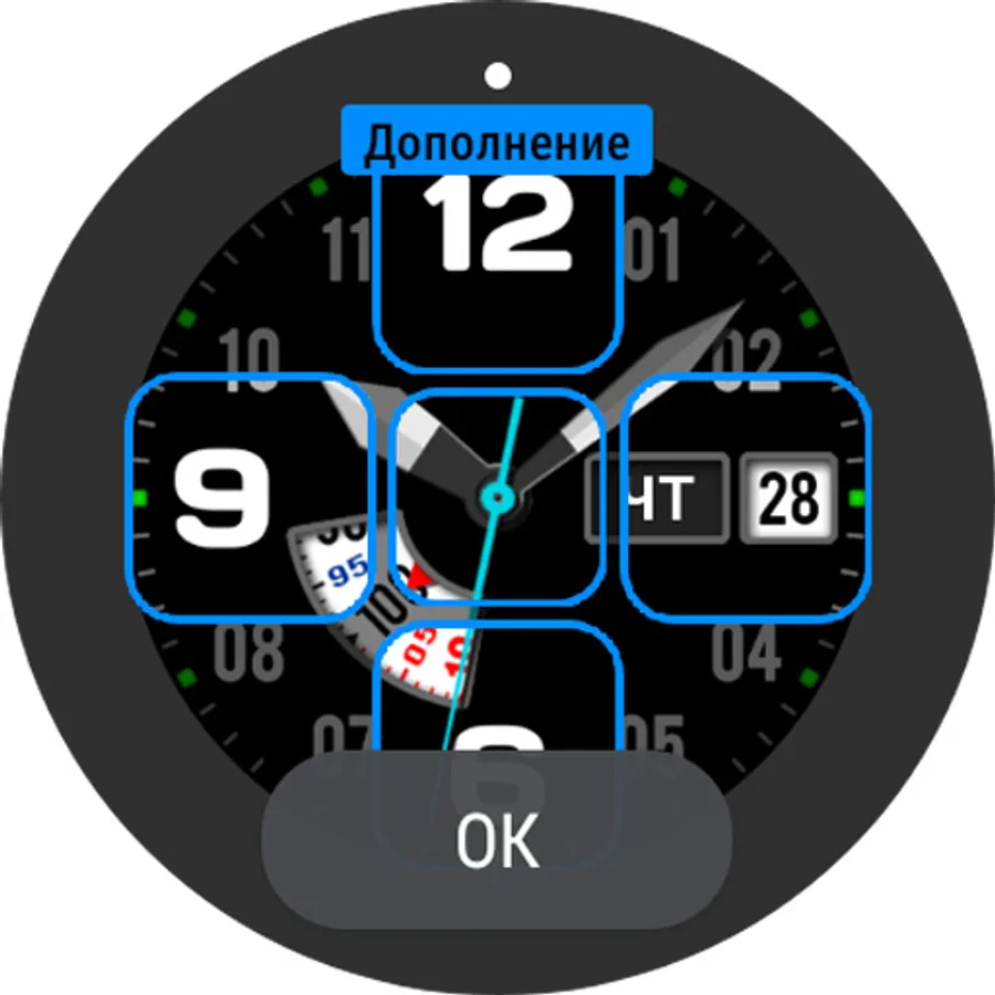 - 5 tap zones that you can customize as you wish to quickly launch applications. To go to the settings, press and hold your finger on the watch face - the settings menu will open