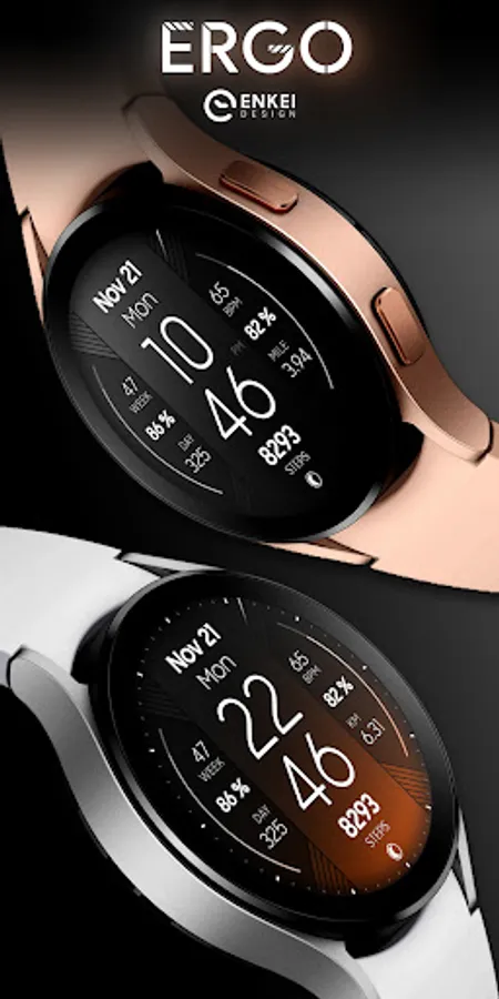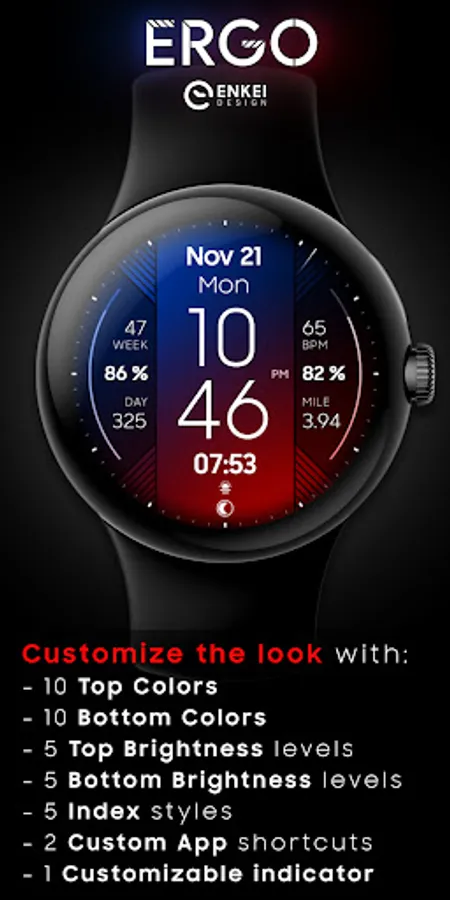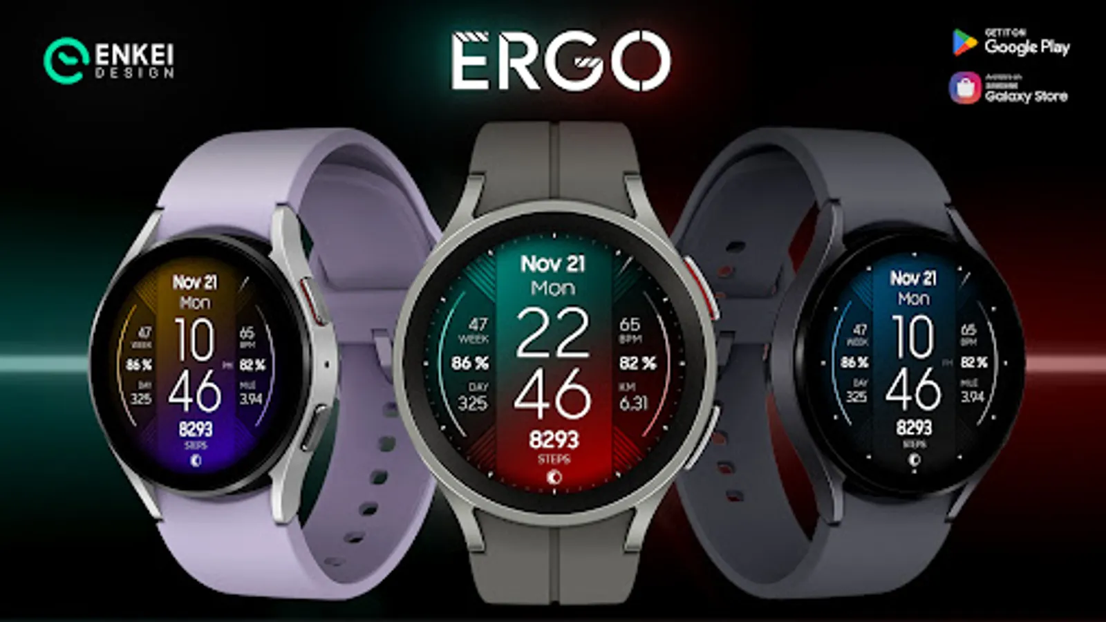 ERGO - Unique modern digital watch face, offering a wide range of color customization with beautiful gradients which meet in the middle and create some gorgeously unique color combinations!