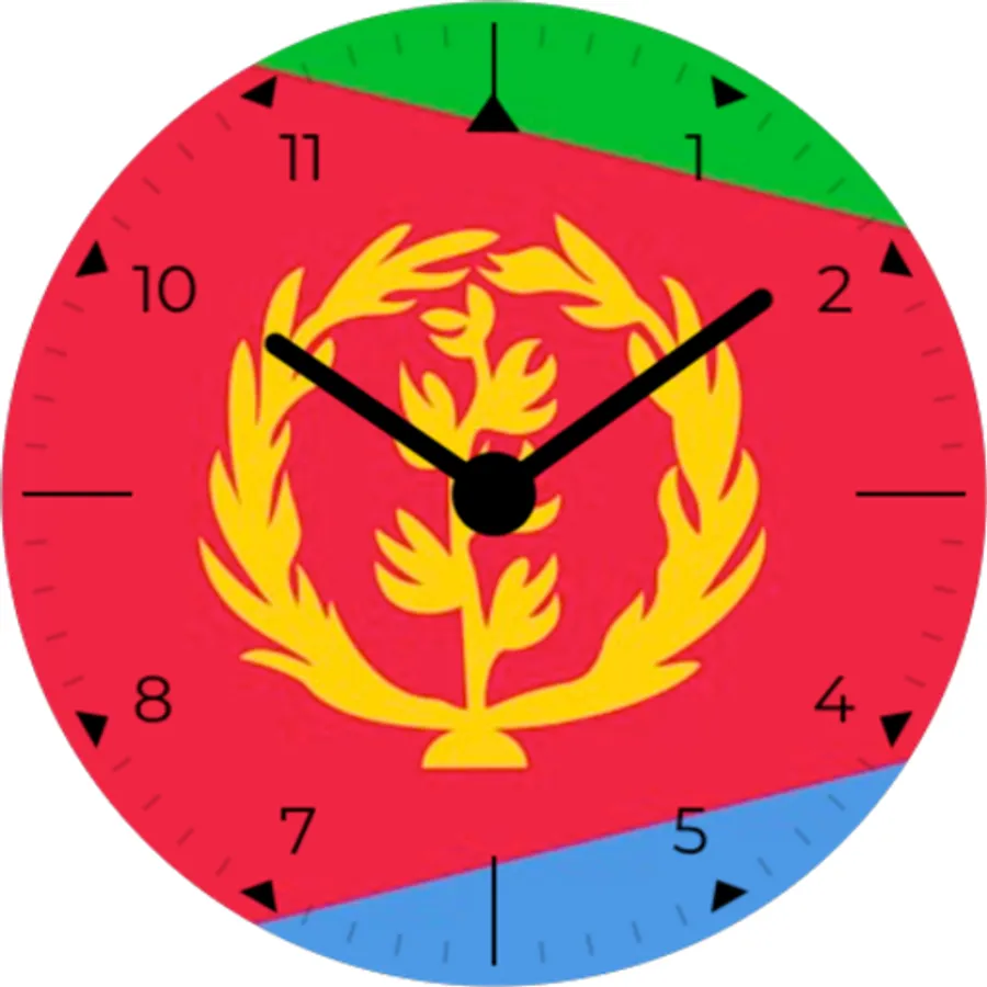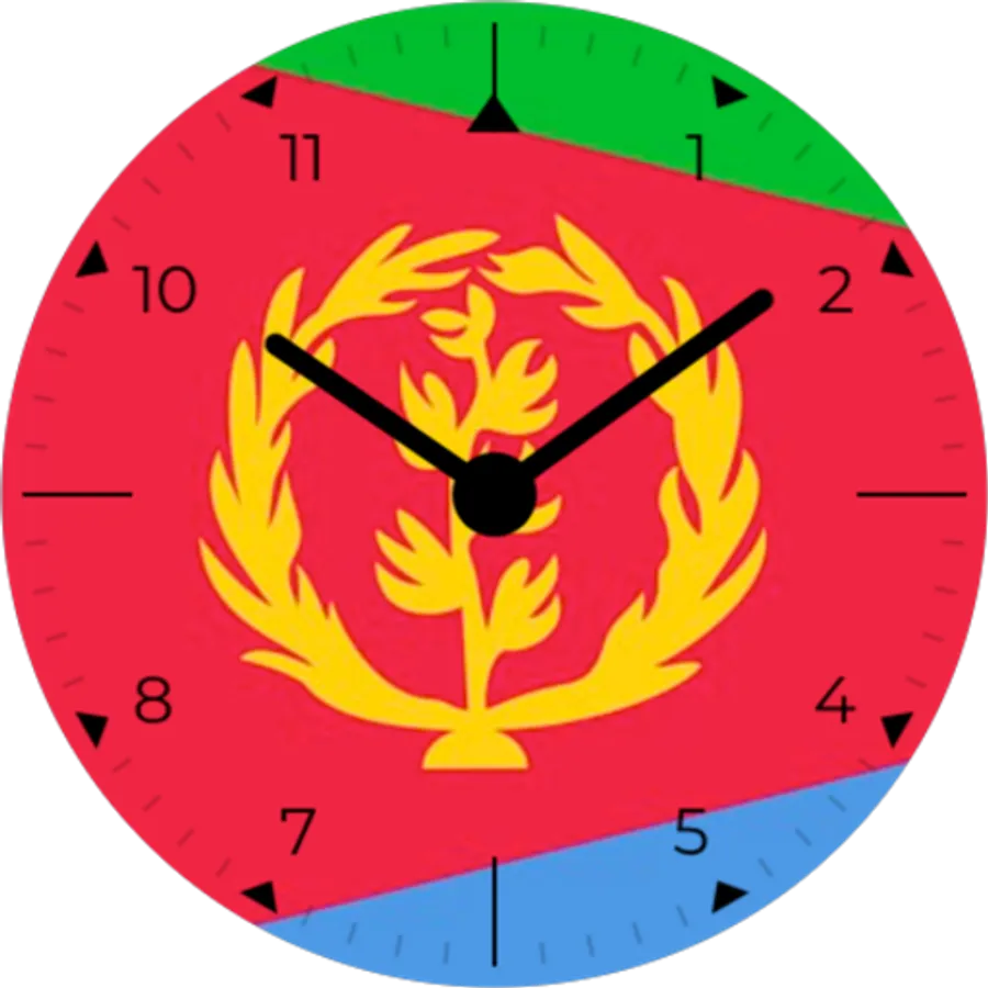 Analog watch face with Eritrea flag in background. Show the pride in your nation with a sleek, modern watch face with your countries national flag. Always on display simple white on black for longer battery life.