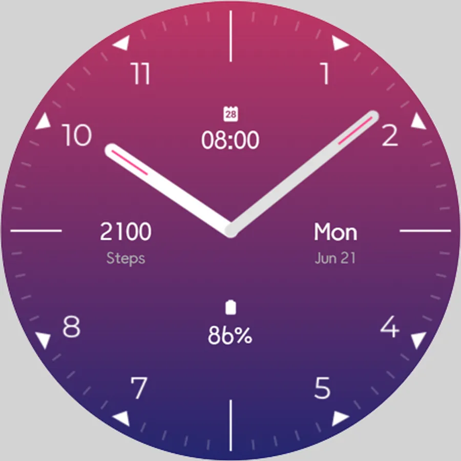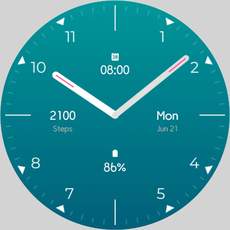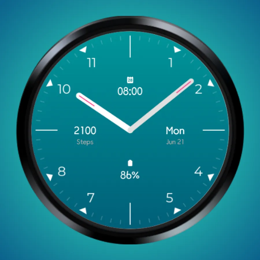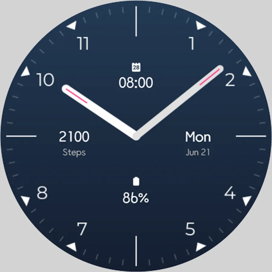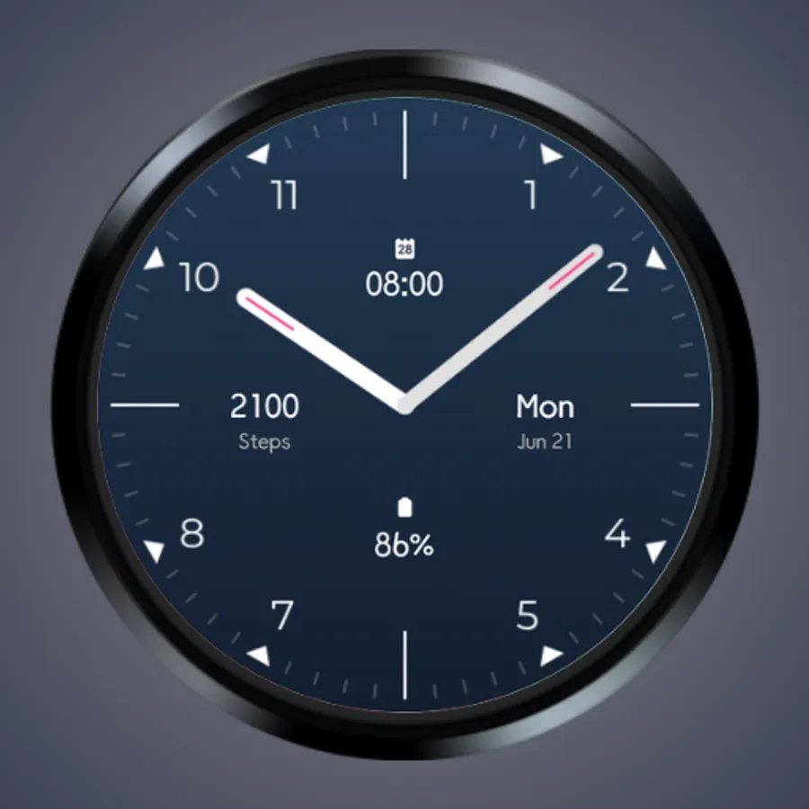 Essential Analog Watch Face for Wear OS with step count, day month date, next event and battery percentage. Simple and efficient analog watch face.