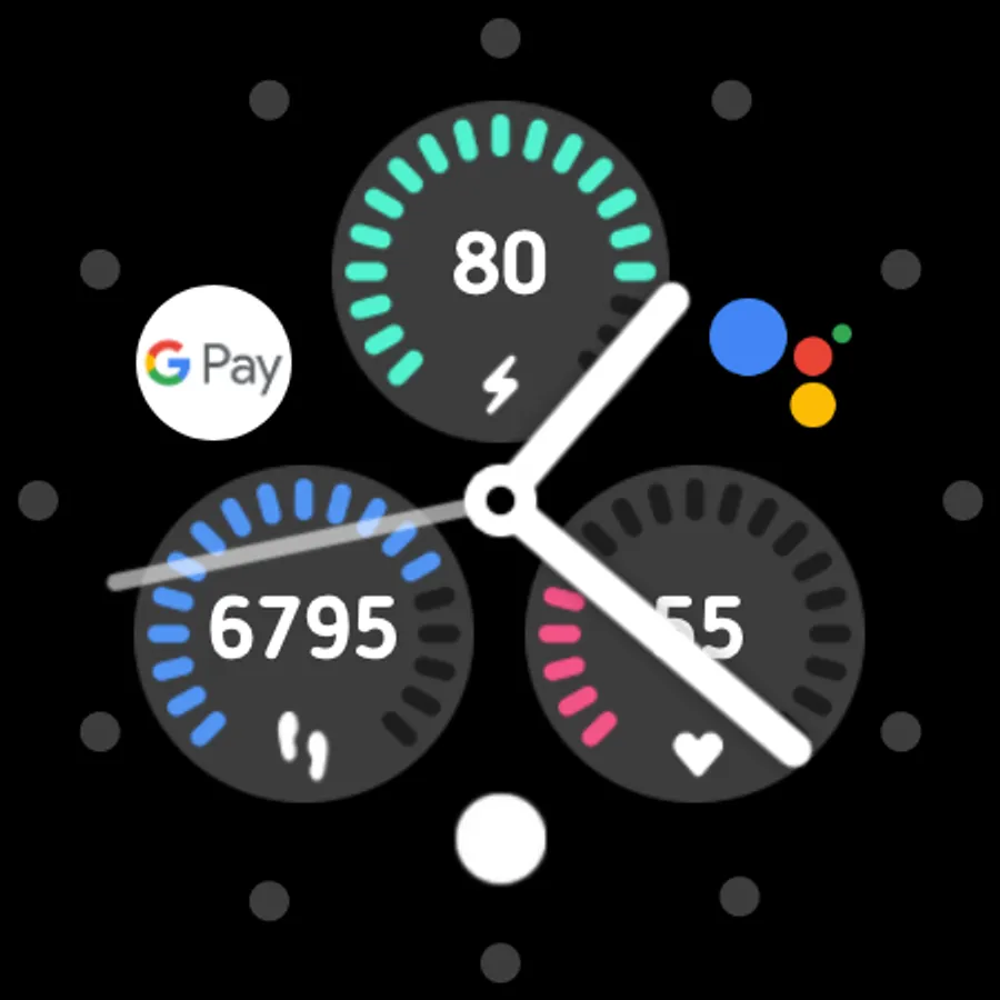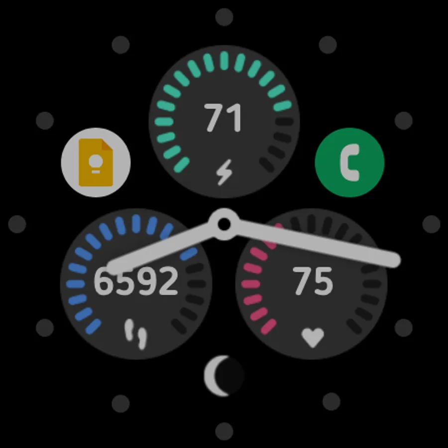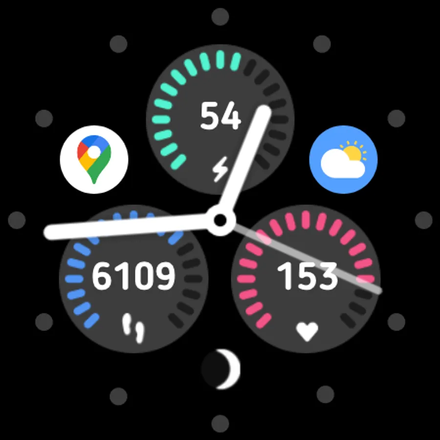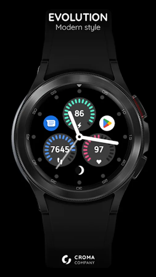 Evolution is an analog watch face that displays steps, battery, and heart rate both as a numeric value and as a range. At the bottom, there is the current moon phase. In the upper part there are two custom shortcuts with icon. Over the steps indicator is placed a third custom shortcut. One tap on the battery and the battery status will open. The heart rate indicator updates itself every 10 minutes and it can be triggered manually a tap.