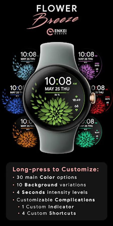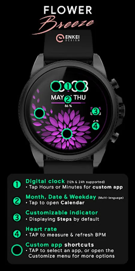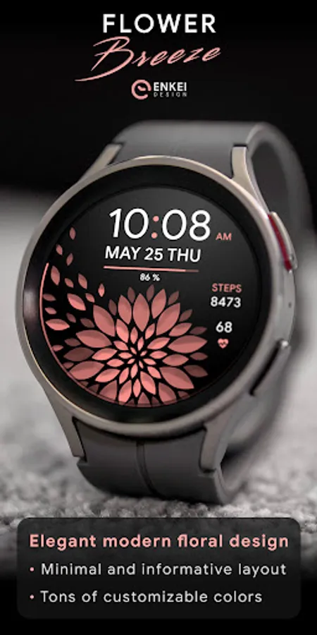 Flower Breeze is a beautiful and elegant digital watch face, made for the ladies!