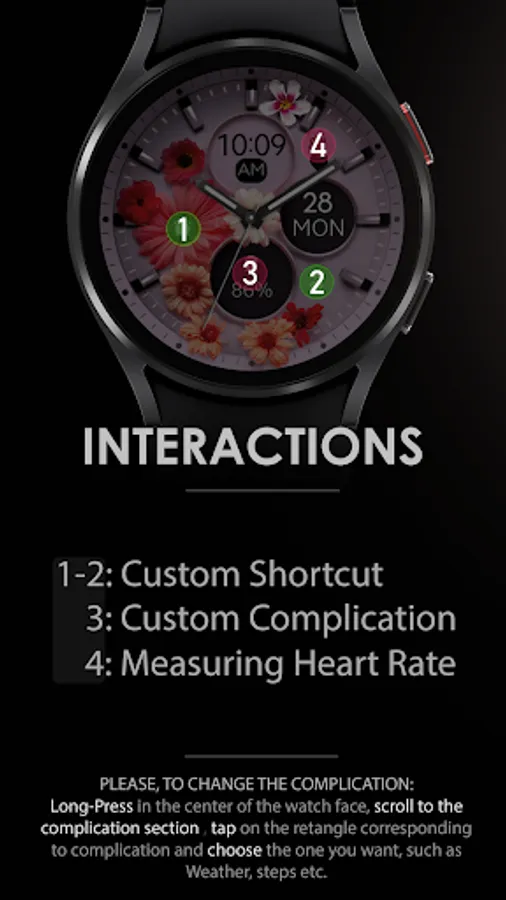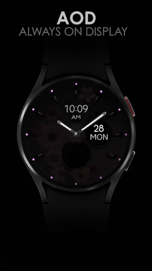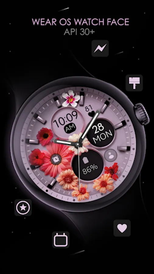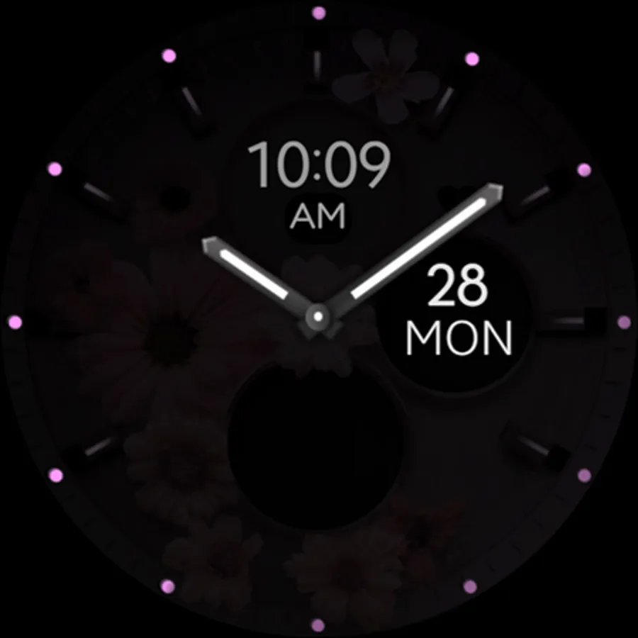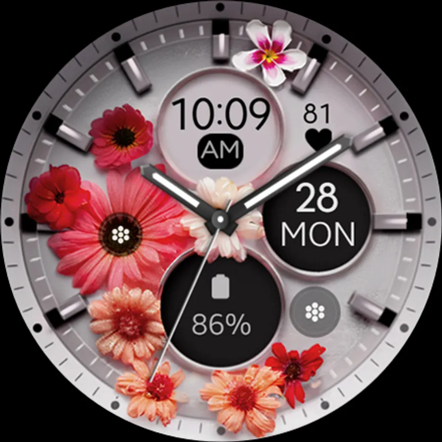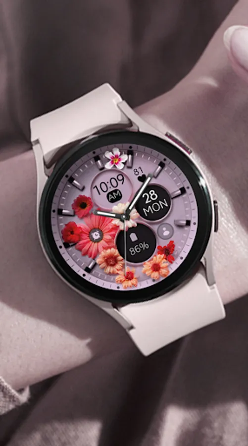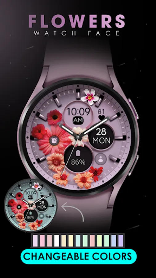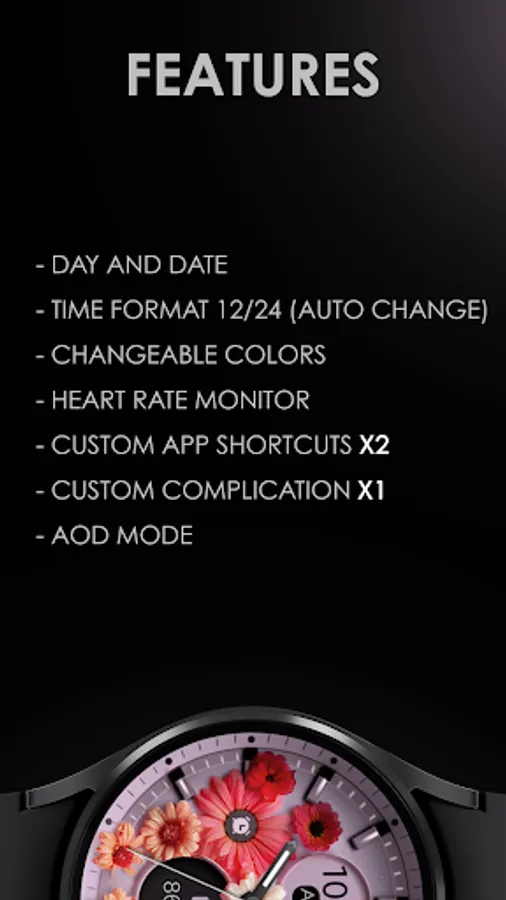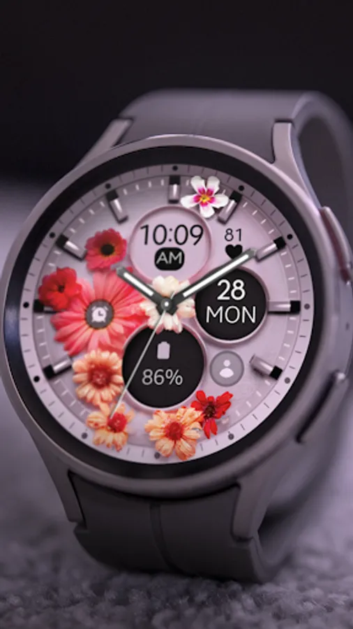 Flowers Purple a modern and stylish analog watch face for Wear OS devices. It features a delicate floral design in red, white, and orange against a pastel purple background. The color of the background can be customized to match your style. The watch face also has two app shortcuts and one custom complication, which can be used to display your favorite information. With Flowers purple, you can add a touch of elegance to your smartwatch while staying connected to the information that matters most to you.