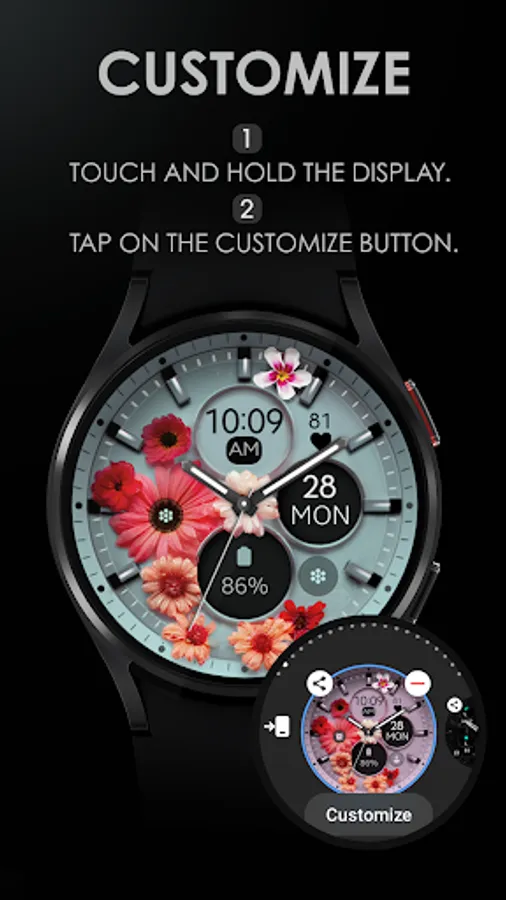 - To customize your watch face, simply touch and hold the display, then tap on the Customize button.