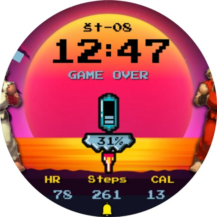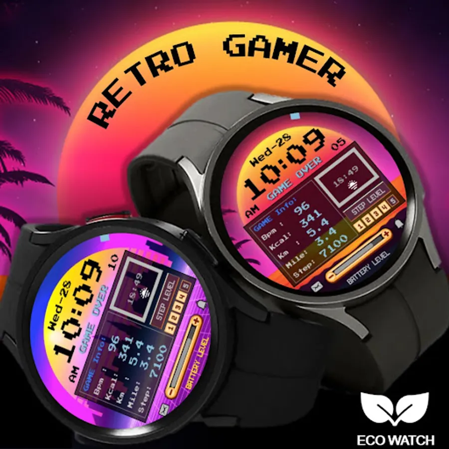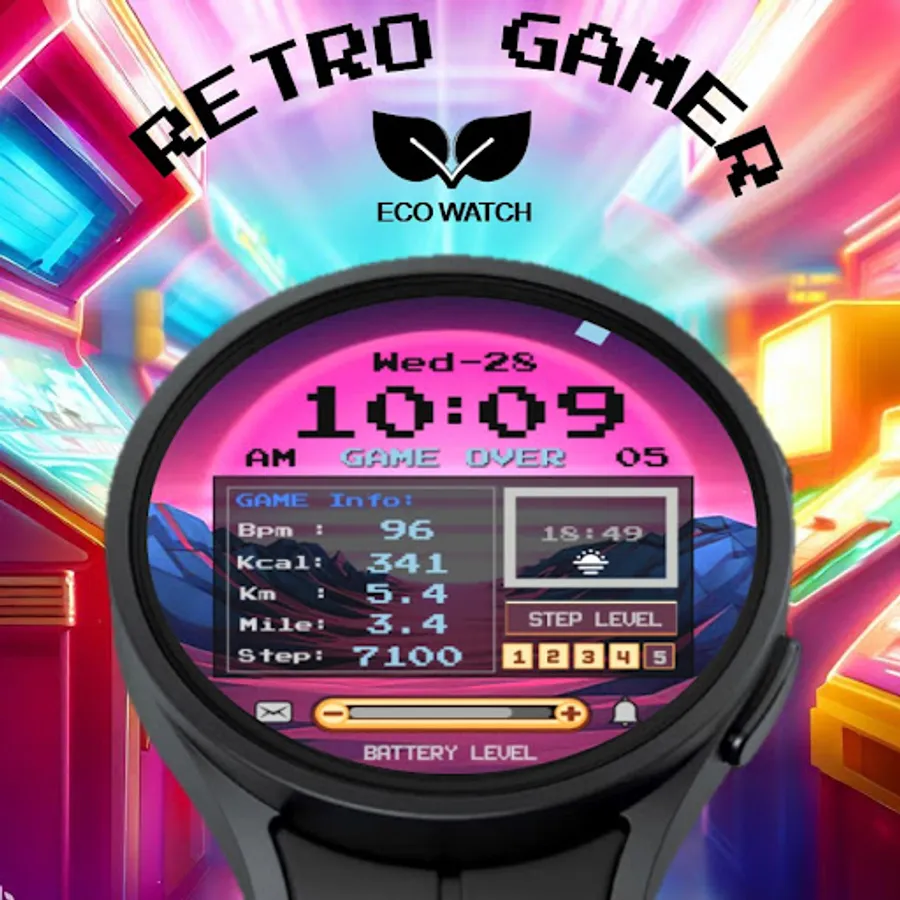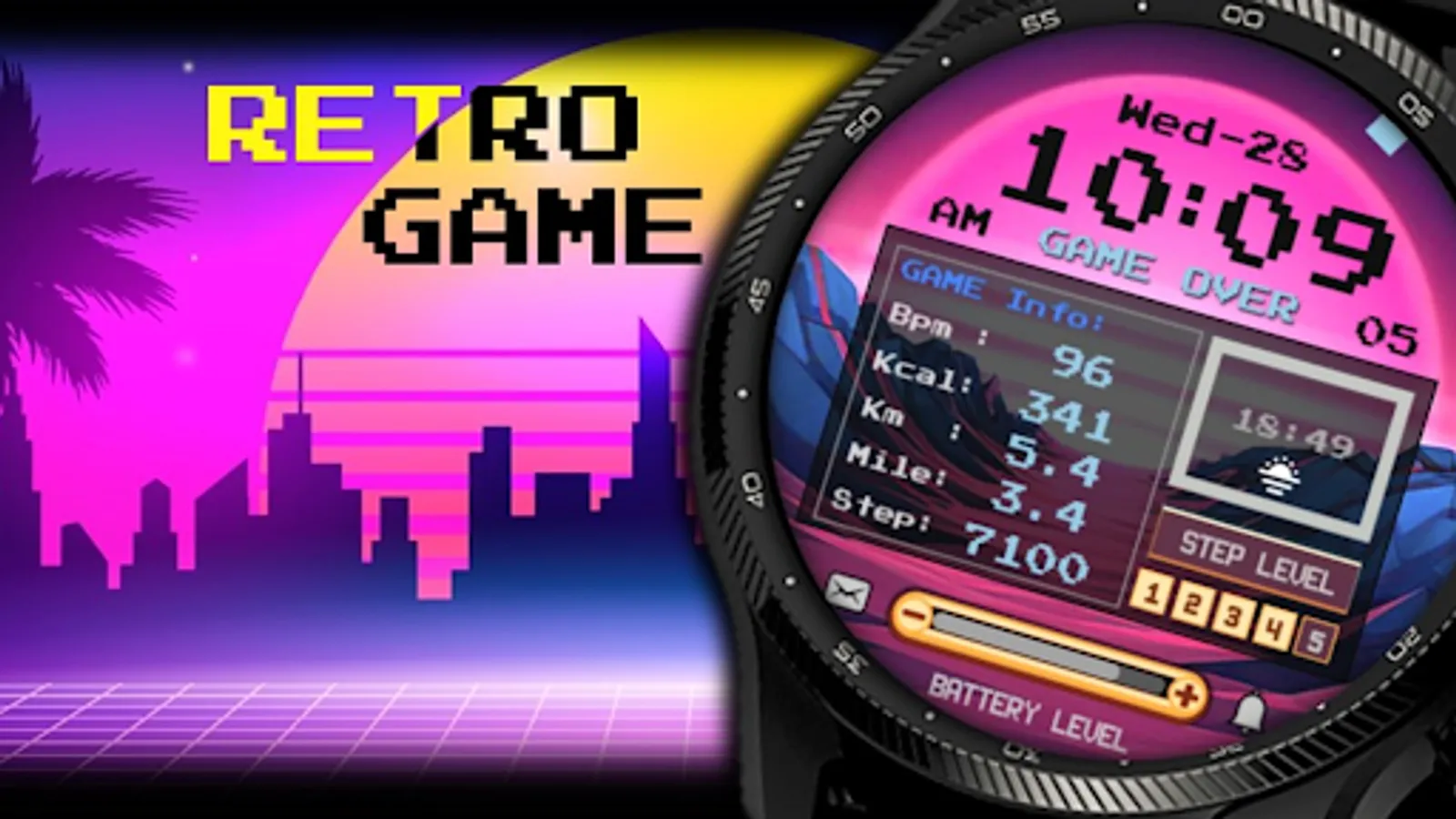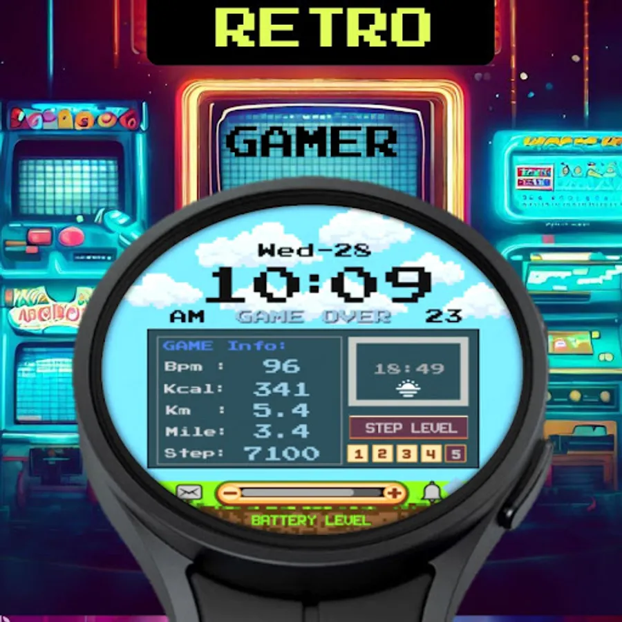 ⌚︎ This beautiful Game Themed animated watch-face contains 6 Retro Game backgrounds and all the information you need for daily use. Digital time, Date information & Health information (Battery, Heart rate, Calorie burn Distance measure in KM and Mile & Steps count.) plus 1 Custom Complication.