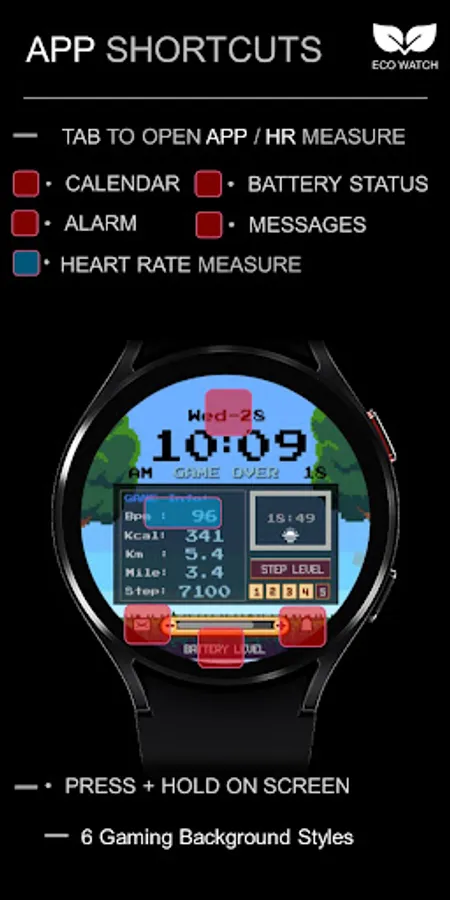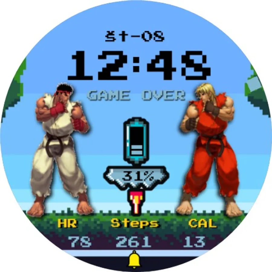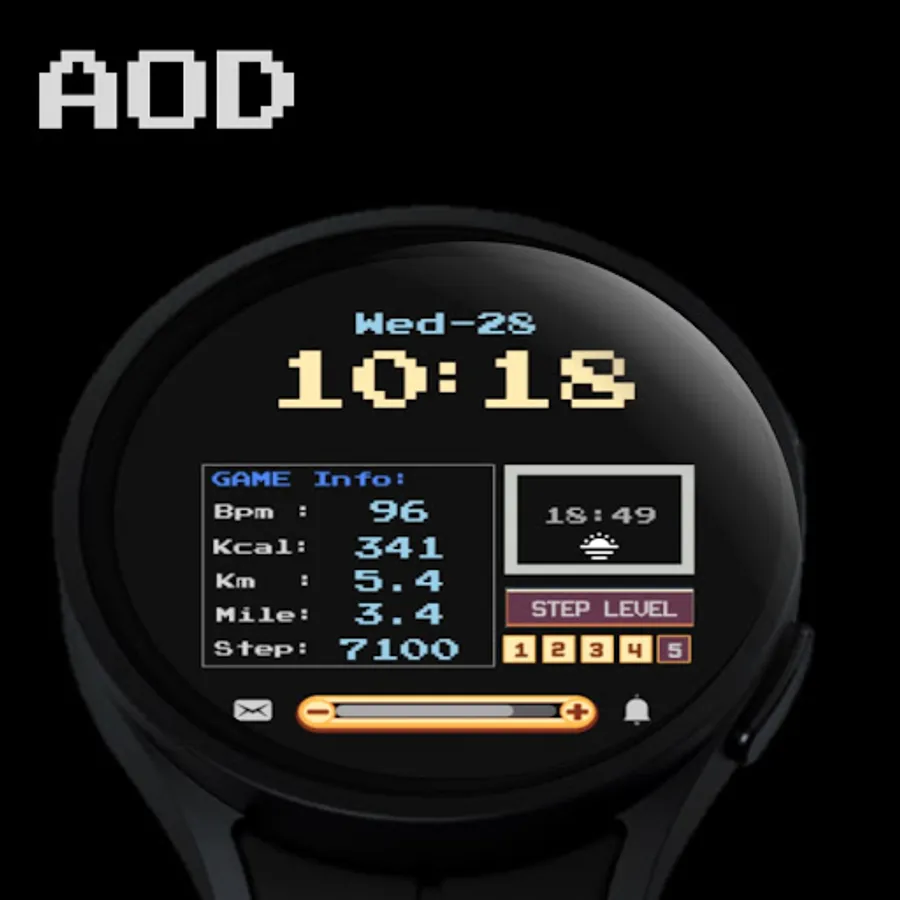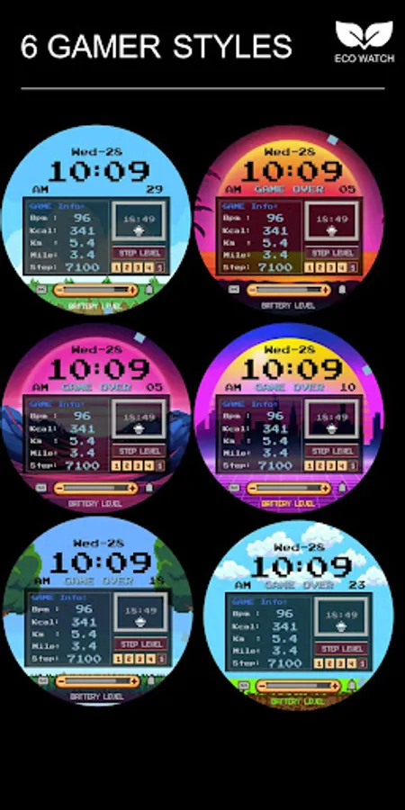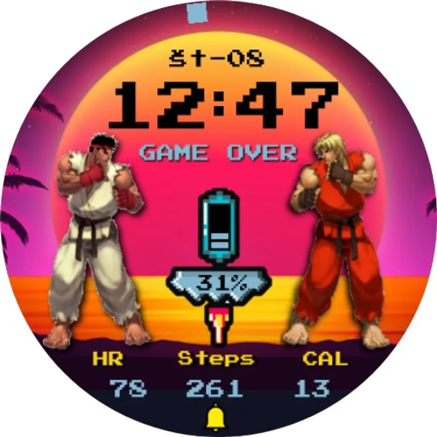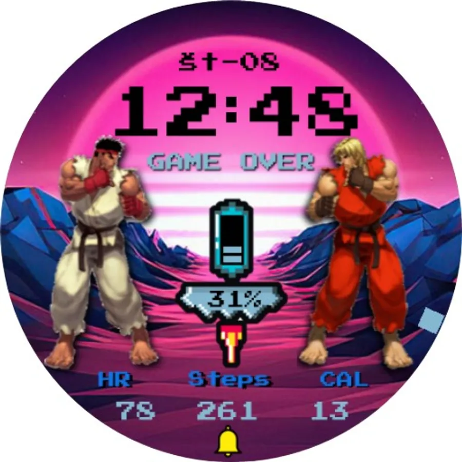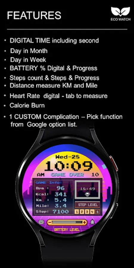 ⌚︎ This beautiful Game Themed animated watch-face contains 6 Retro Game backgrounds and all the information you need for daily use. Digital time, Date information & Health information (Battery, Heart rate, Calorie burn Distance measure in KM and Mile & Steps count.) plus 1 Custom Complication.