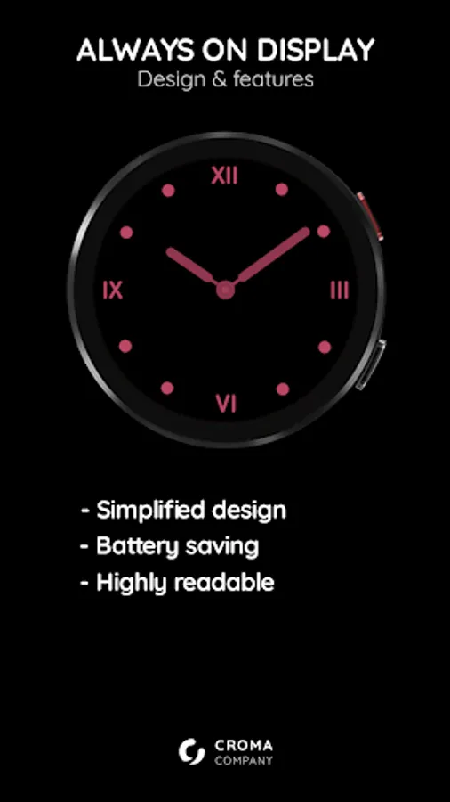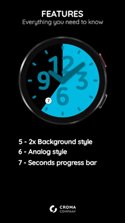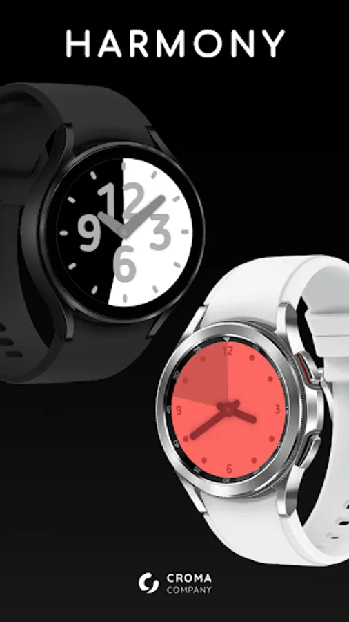 Harmony is a simple and highly customizable Wear OS Watch Face. In the background, a progress bar indicates the seconds. The hands and the color theme are editable in the settings. The background can be set in full black or in a dark shade of the color theme.