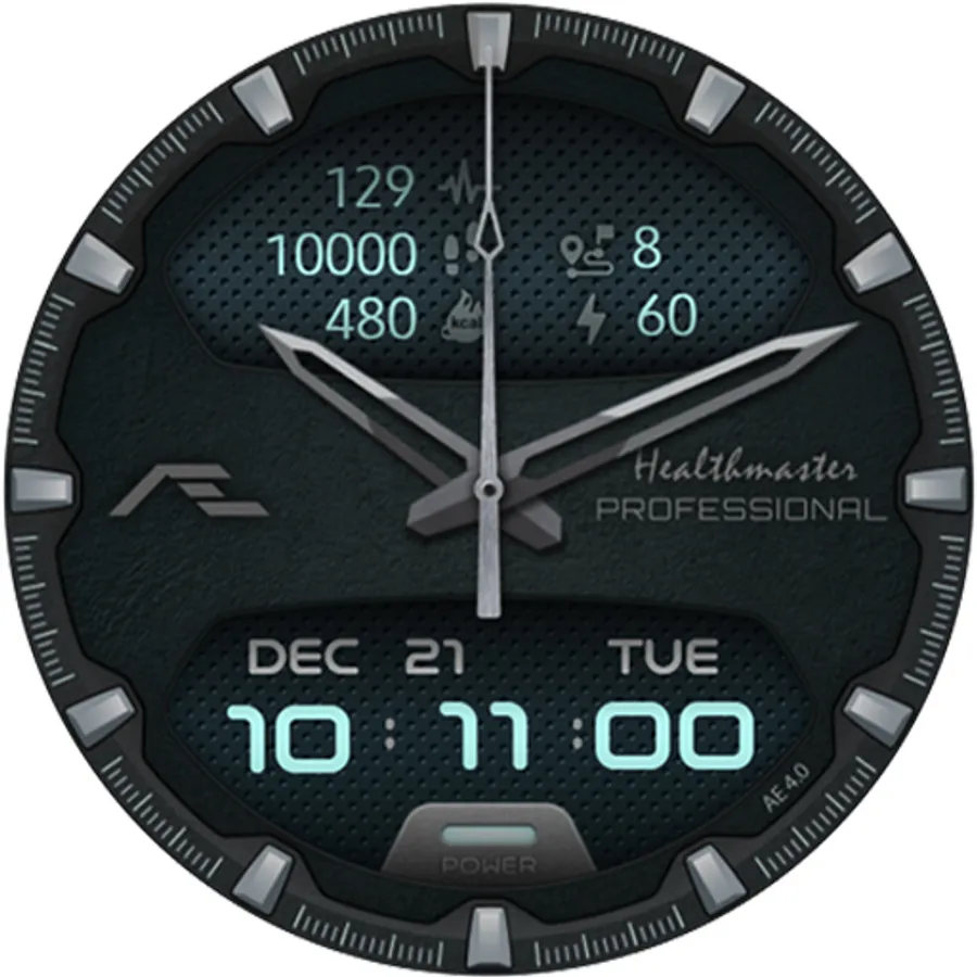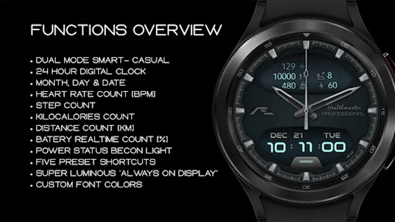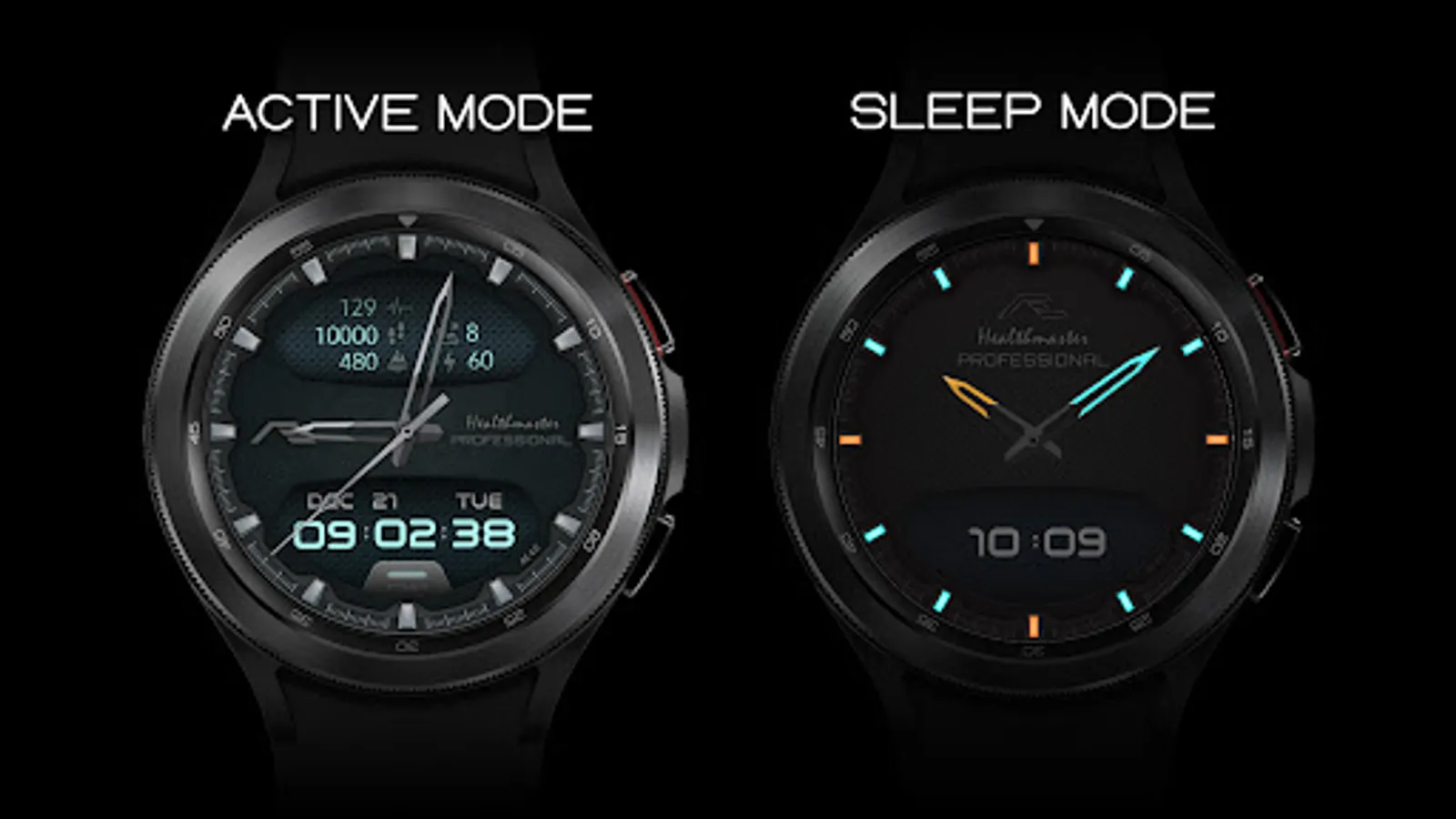 A dual mode health activity watch face. Made for professionals appreciating design intricacies, organized layout, legibility, and functional Smartwatch that radiates prestige.