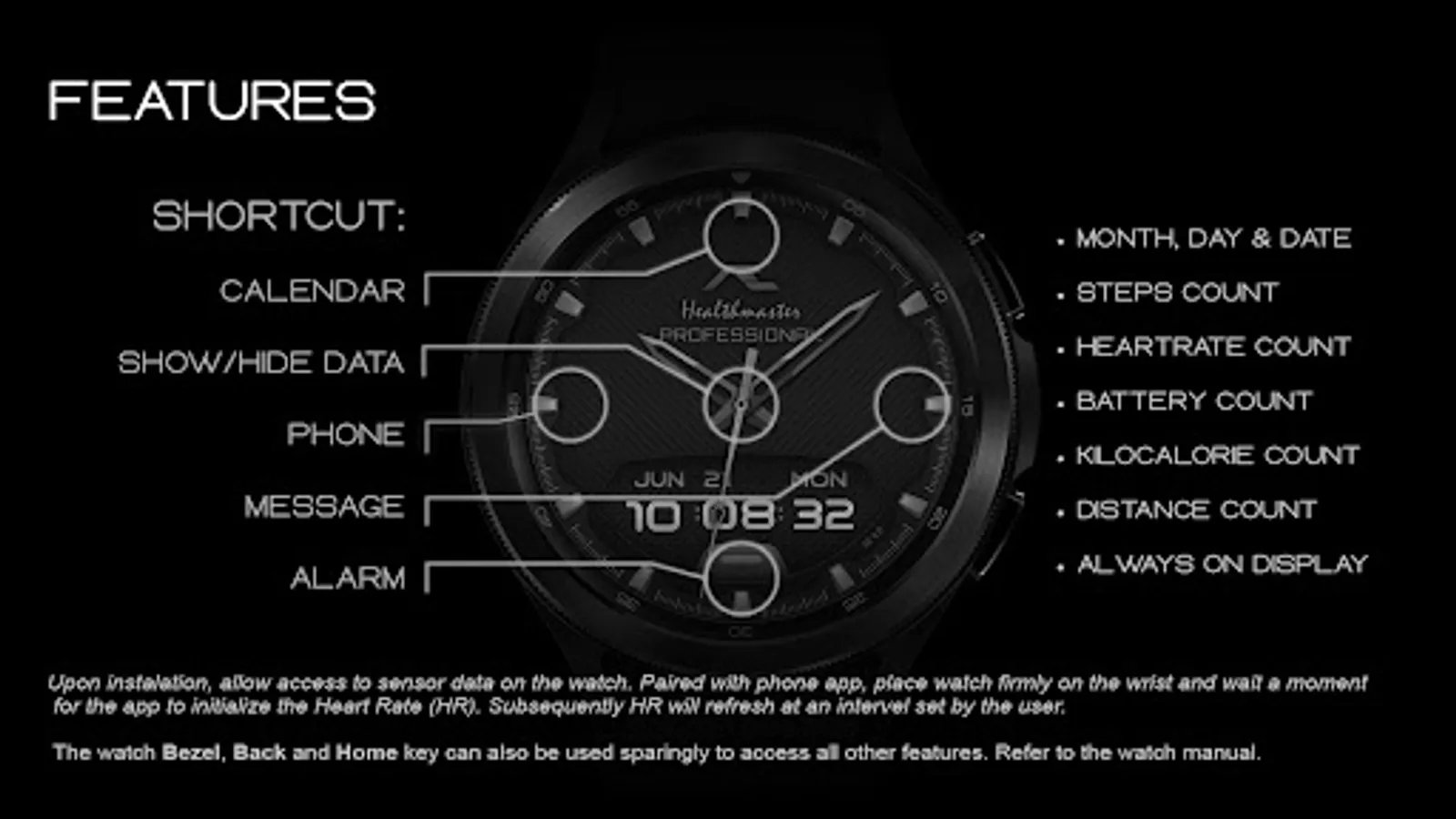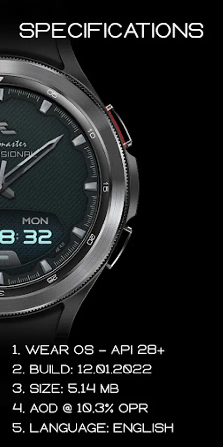 Build with Watch Face Studio powered by Samsung. Customizable data font colours via phone companion App. Tested on Samsung Watch 4 Classic and all features and functions worked as intended. The same may not apply with other Wear OS devices.