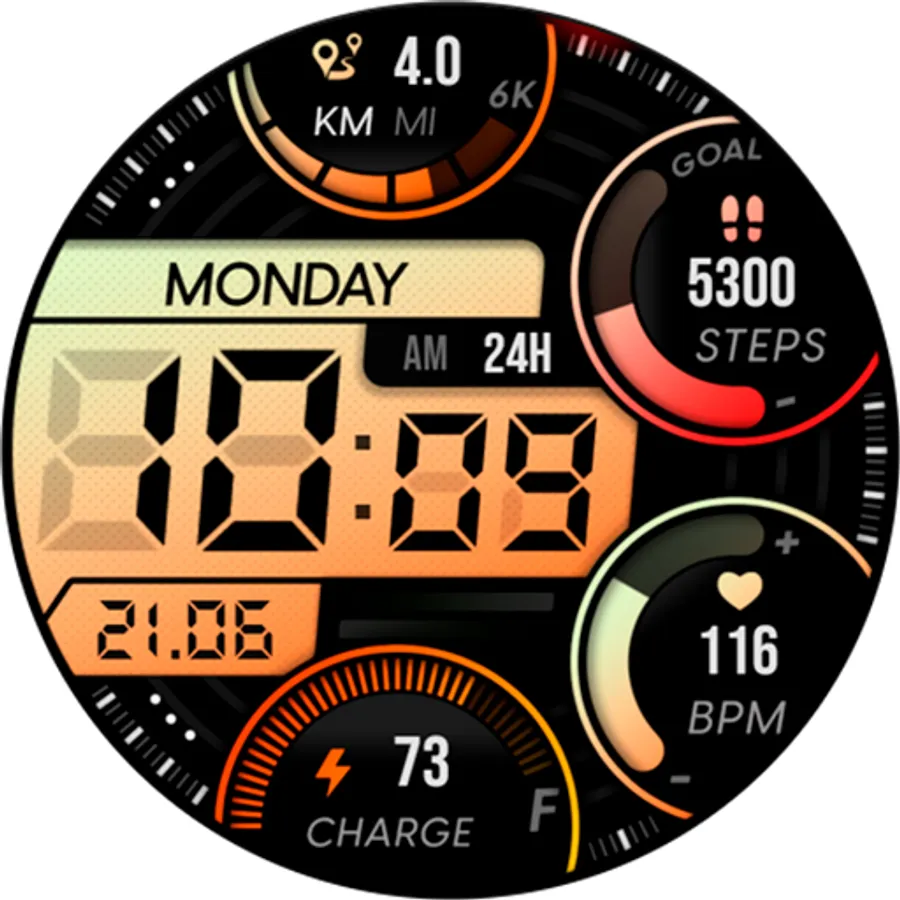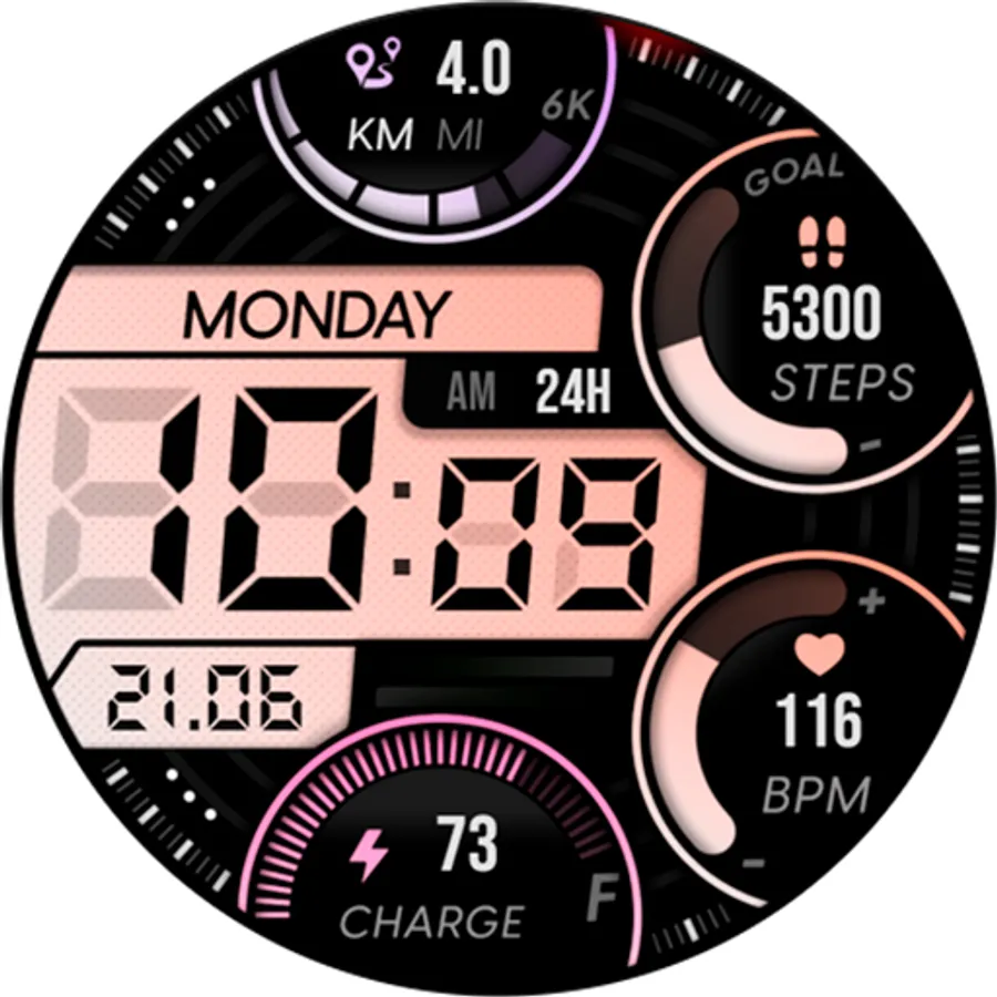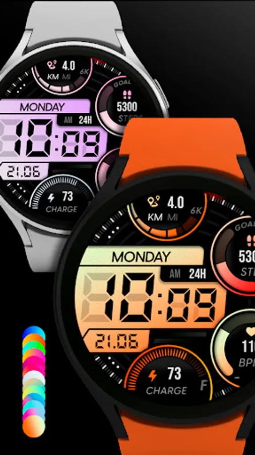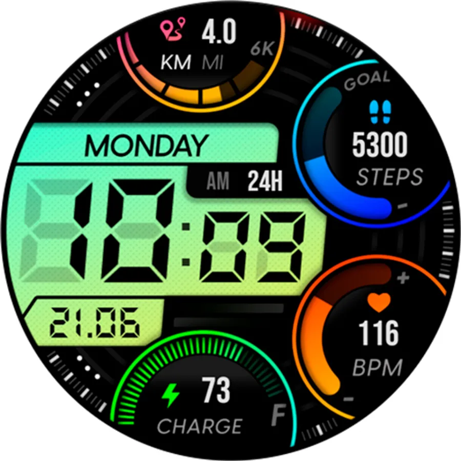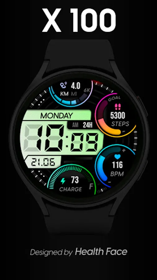 HEALTH FACE Nº100 is a digital watch face for your smart watch. Thanks to this design you can enjoy customization, shortcuts and great style on the wrist of your hand.