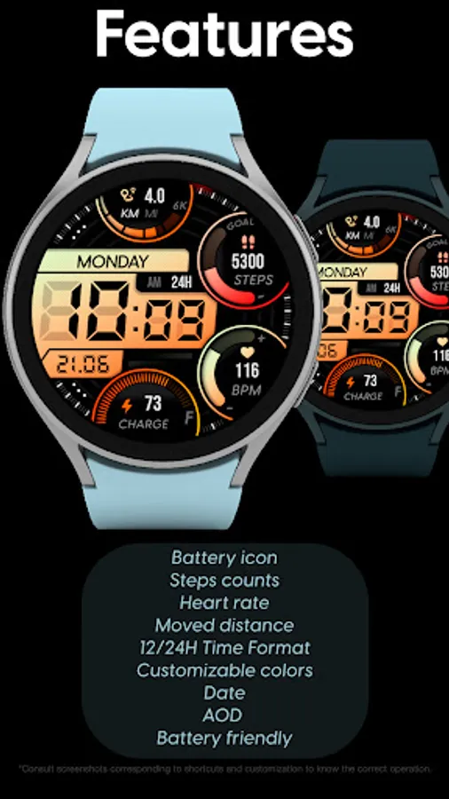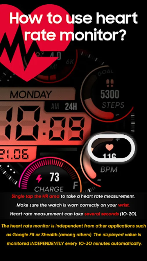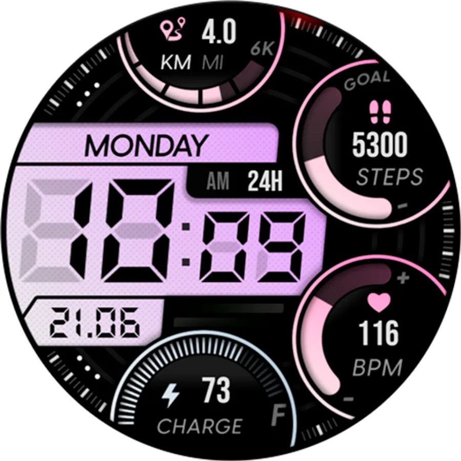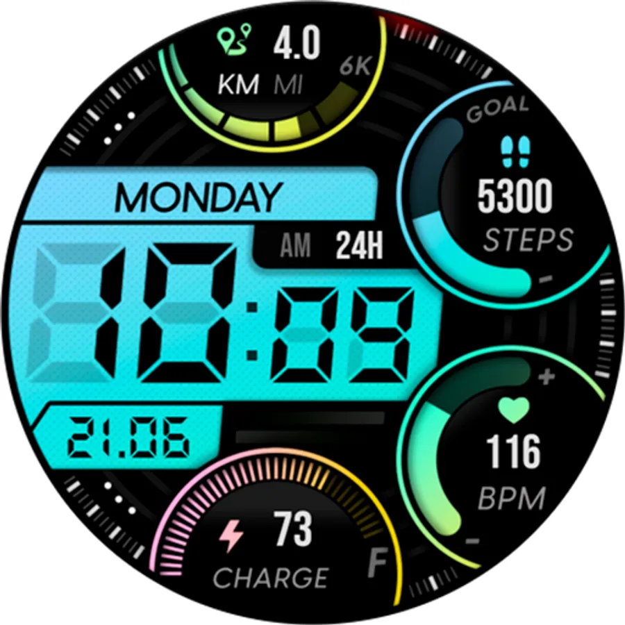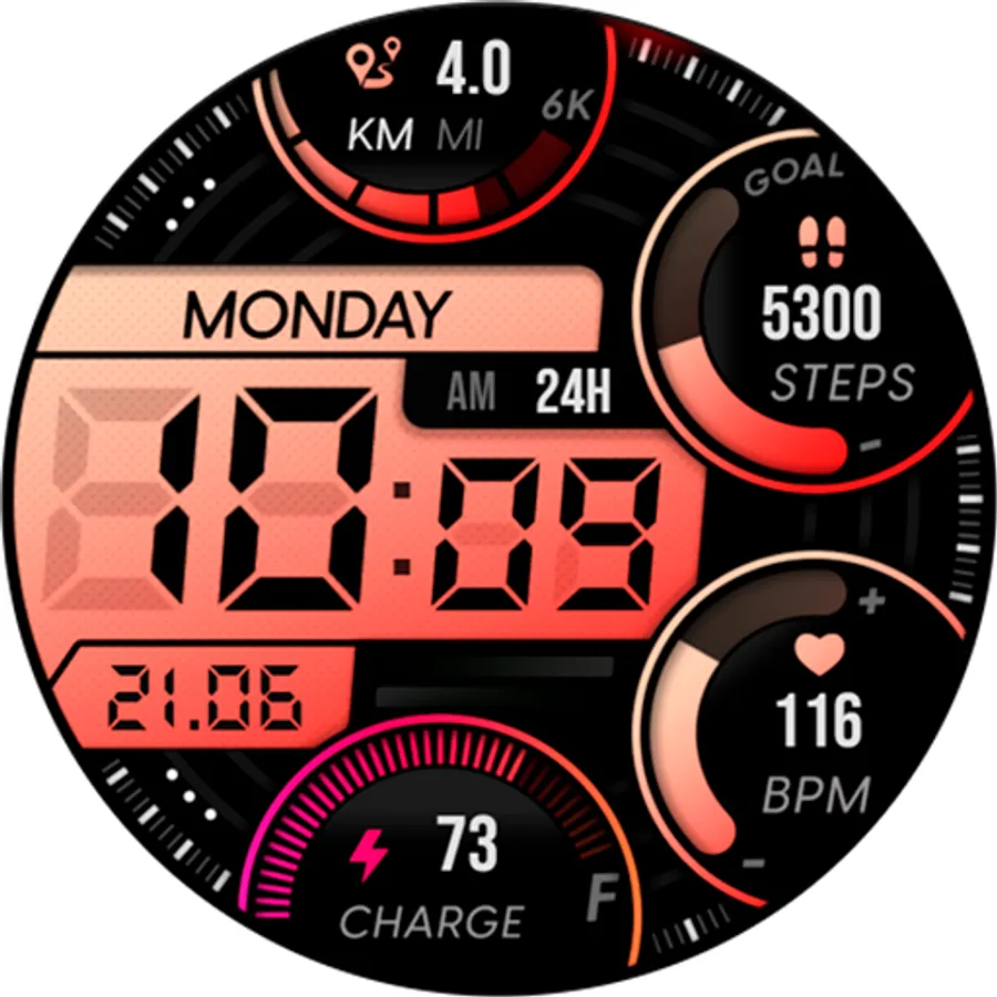 HEALTH FACE Nº100 is a digital watch face for your smart watch. Thanks to this design you can enjoy customization, shortcuts and great style on the wrist of your hand.
