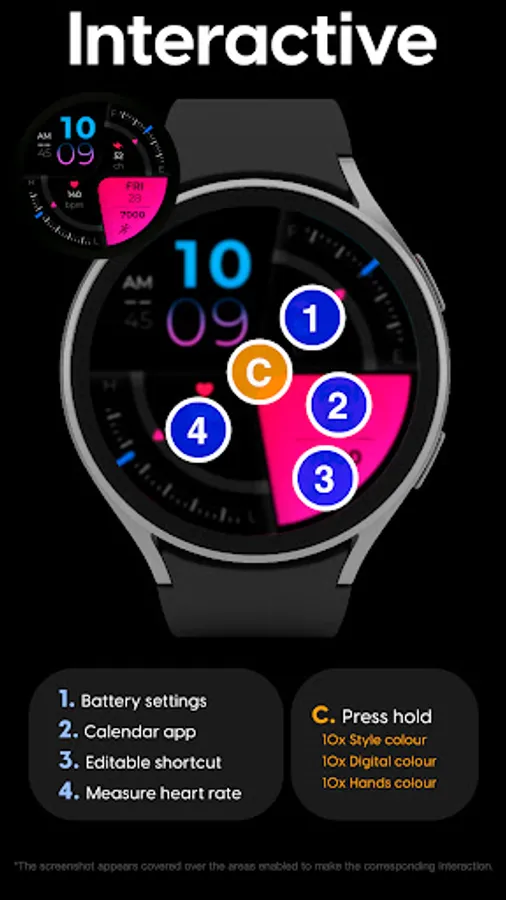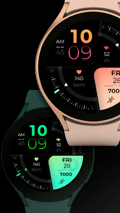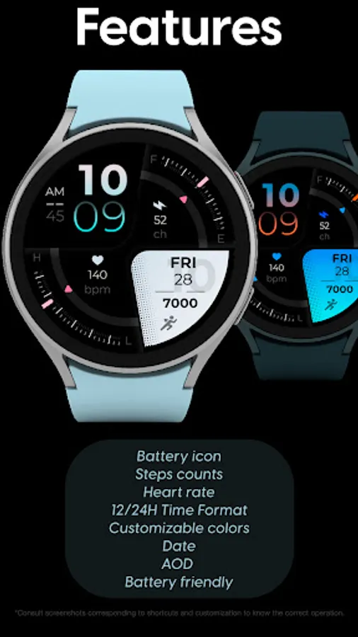 Customizable colors - Long press in the center of the watchface to change the styles. *See the screenshots*
