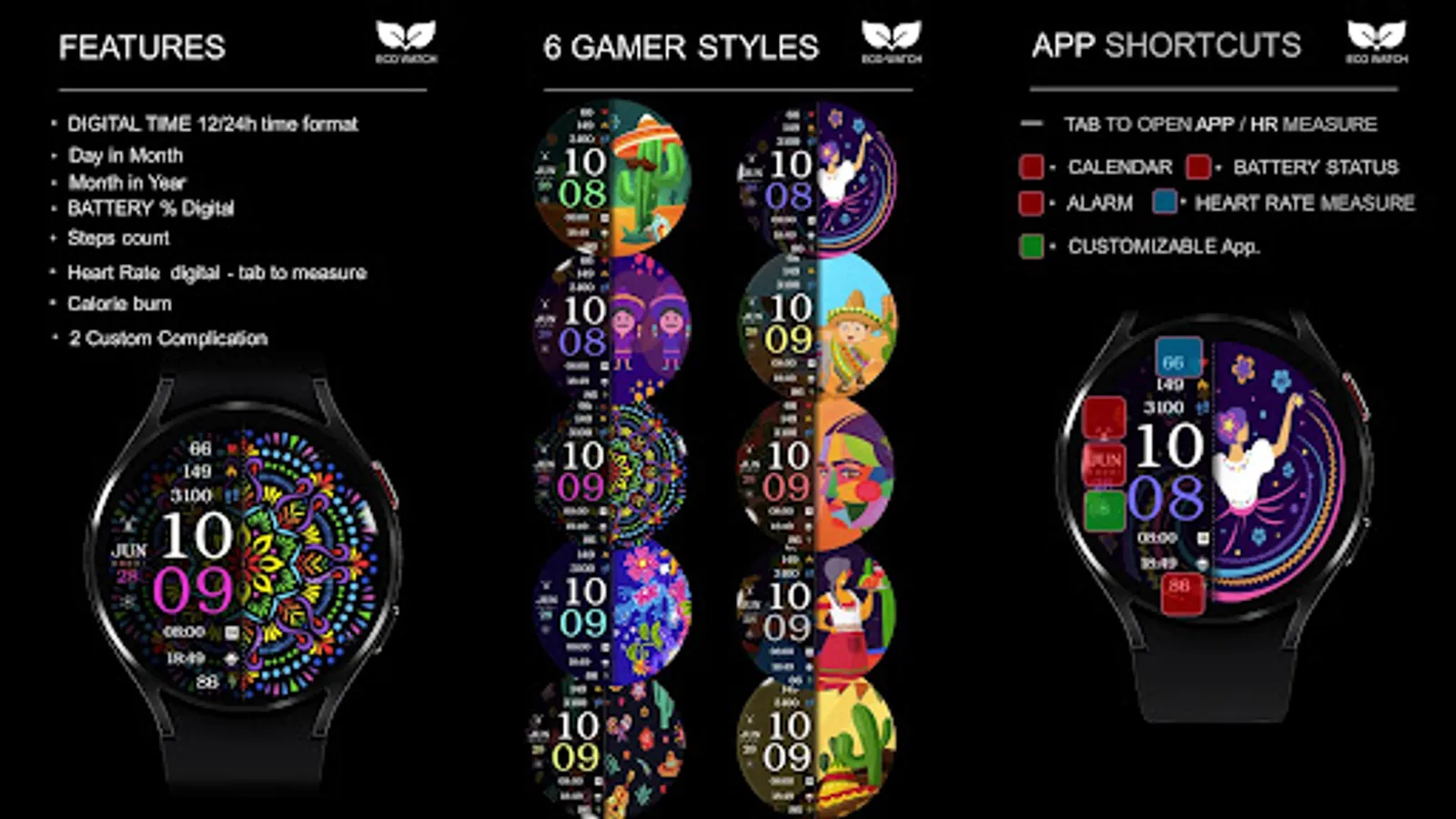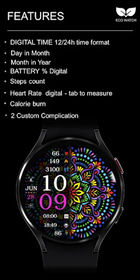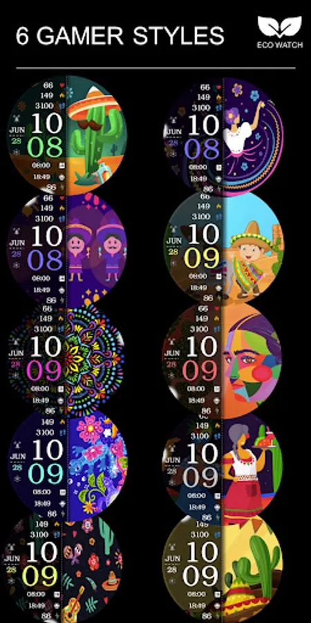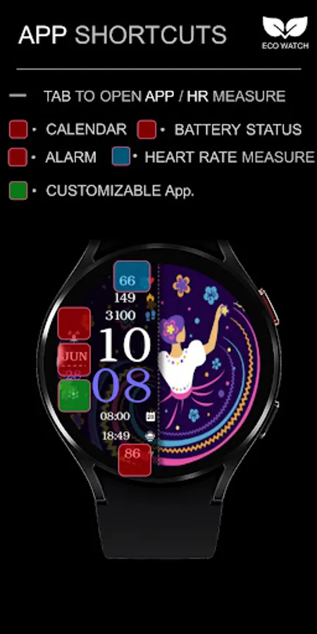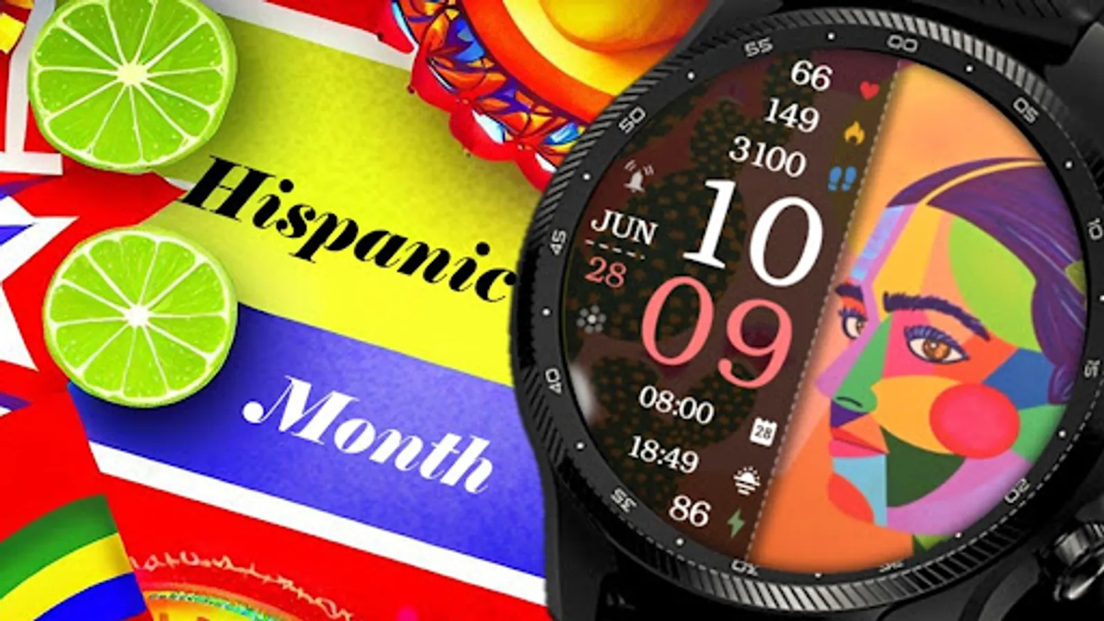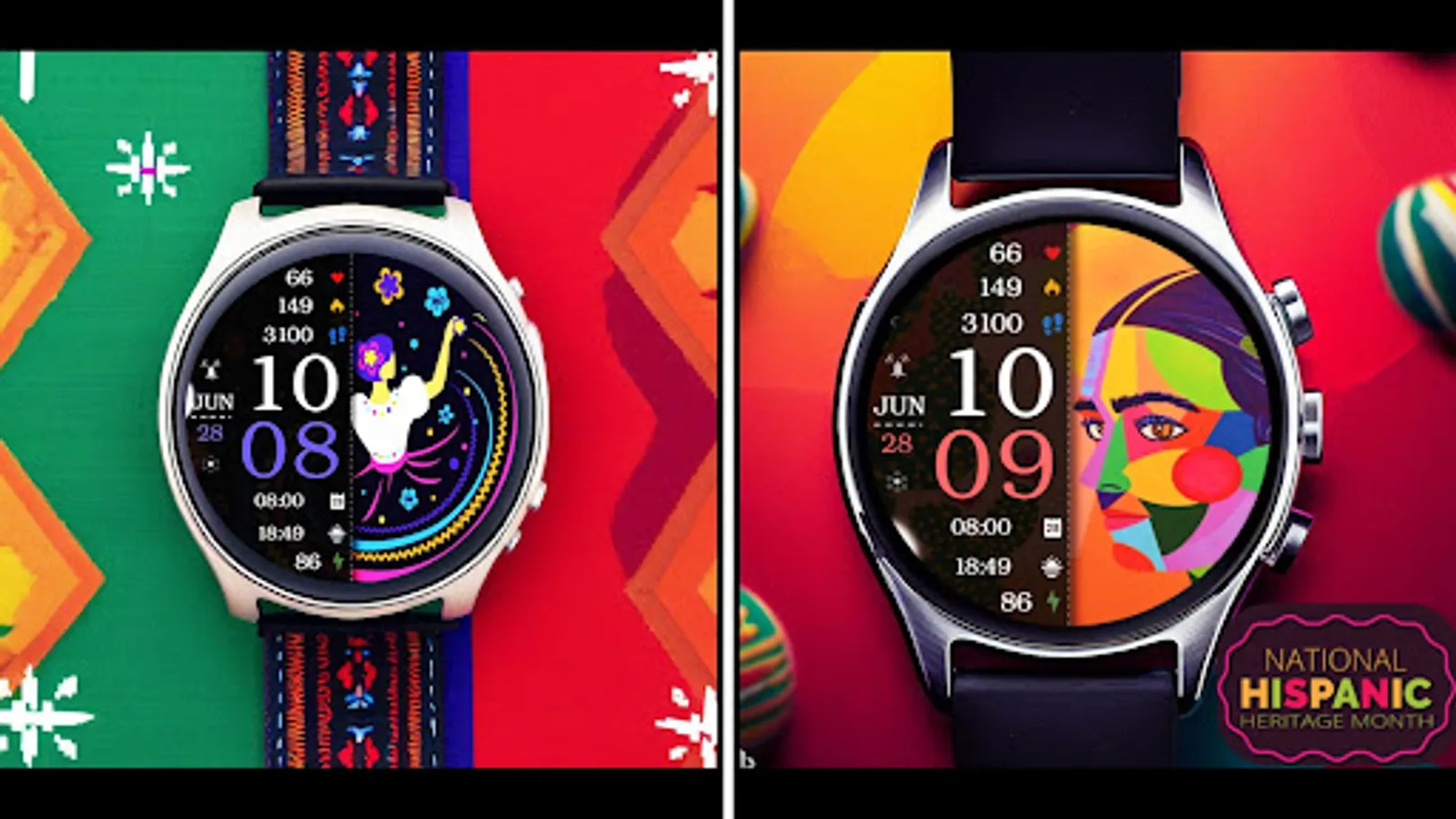 ⌚︎ On this beautiful Hispanic heritage themed watch-face you will see all important information like Digital time 12-24h time format, Date information, Battery percentage Steps and Heart rate, 2 custom complications