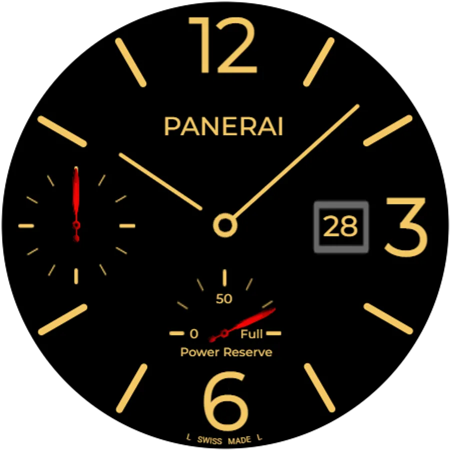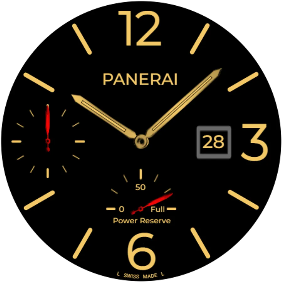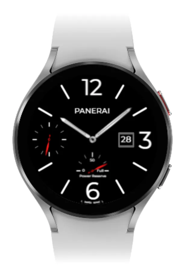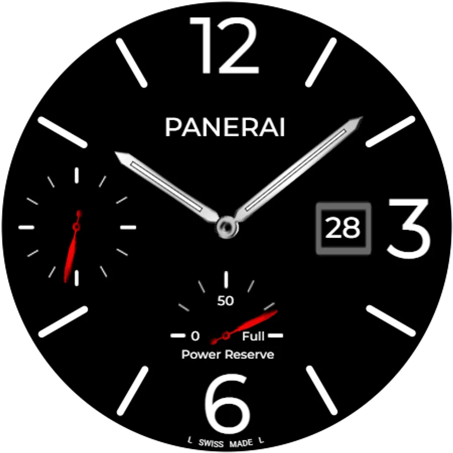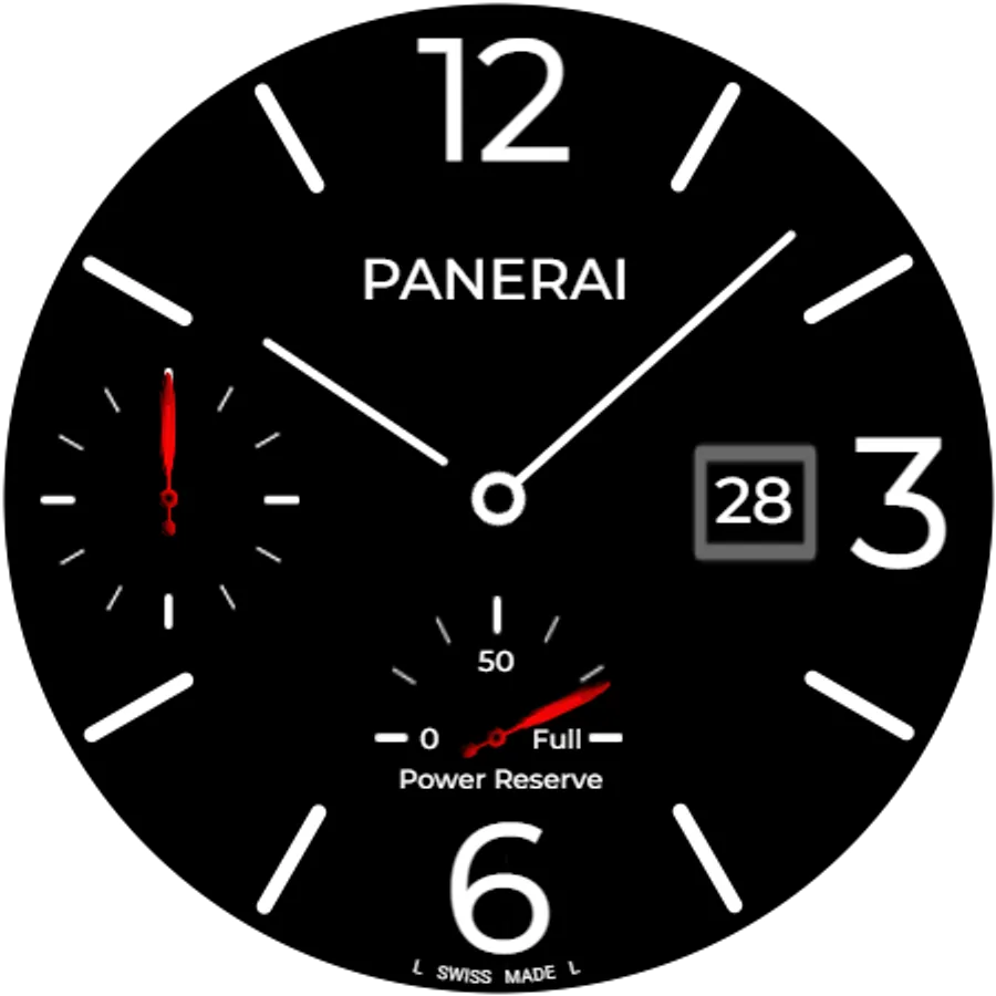 - Second hand at 9 o'clock, battery status indication at 6 o'clock.