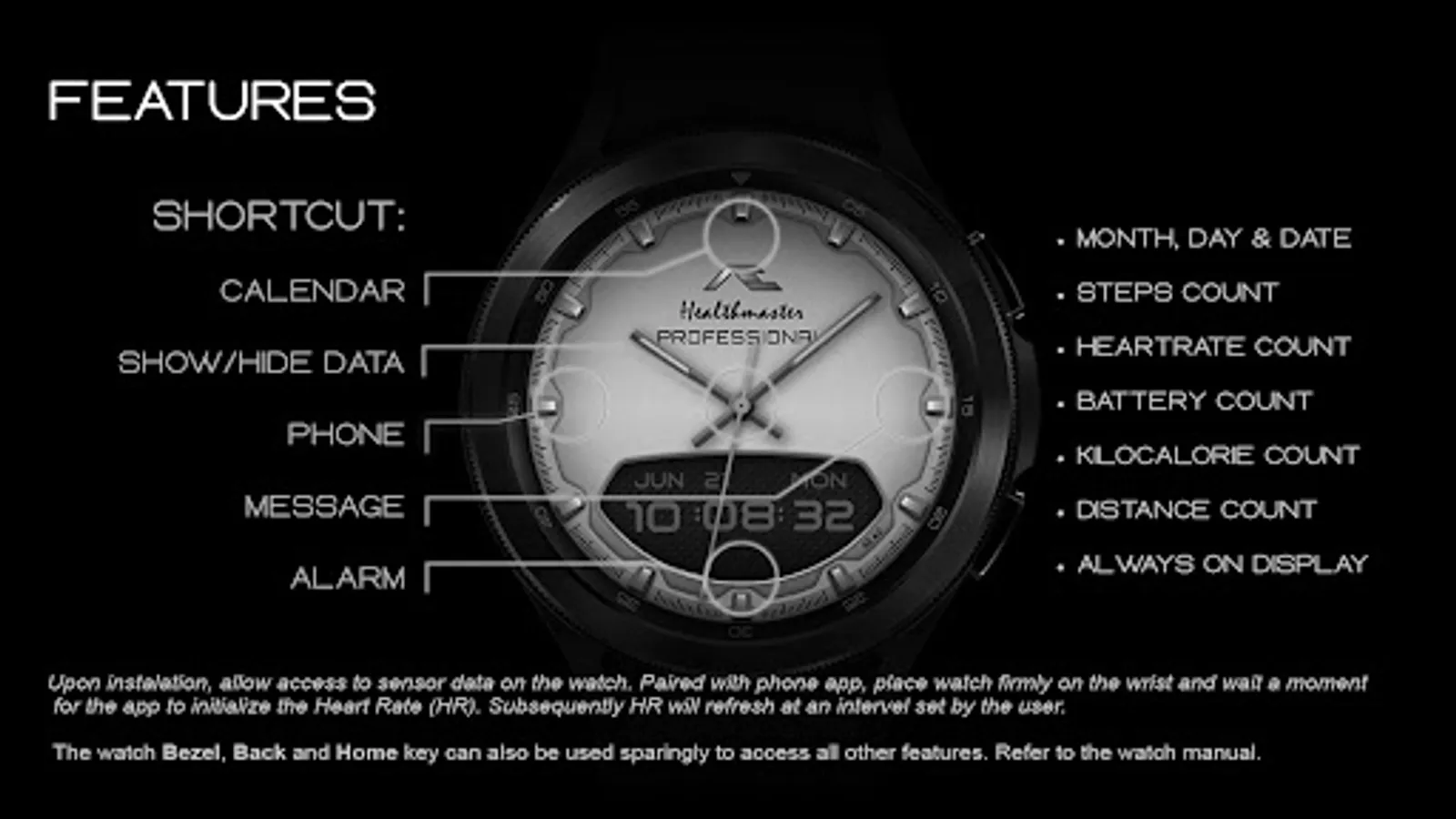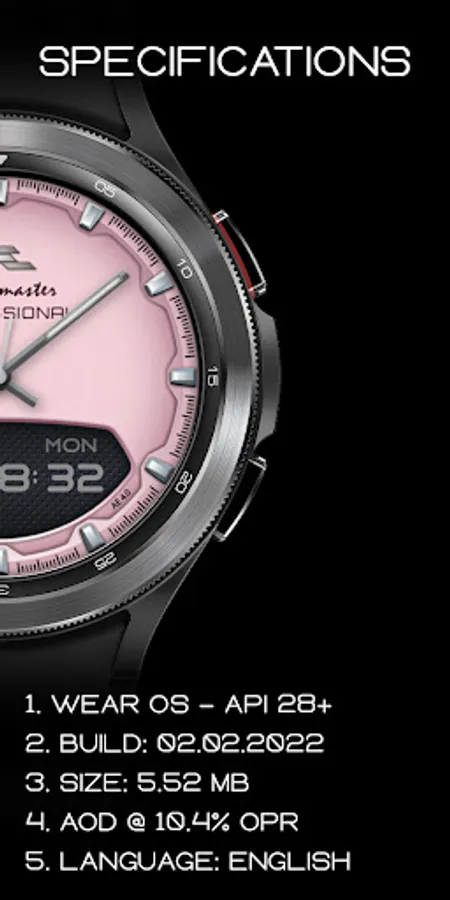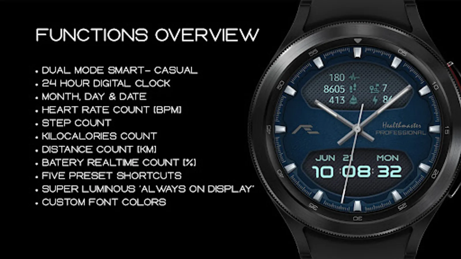 Build with Watch Face Studio powered by Samsung. Customizable data font colours via phone companion App. Tested on Samsung Watch 4 Classic and all features and functions worked as intended. The same may not apply with other Wear OS devices.