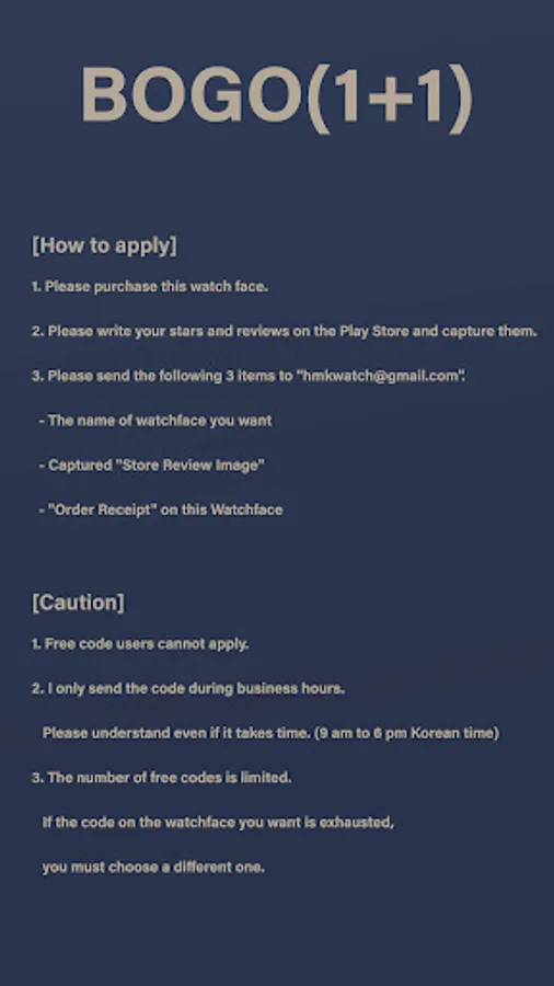 If you send me the following by e-mail, I will send you the free code of the watchface.