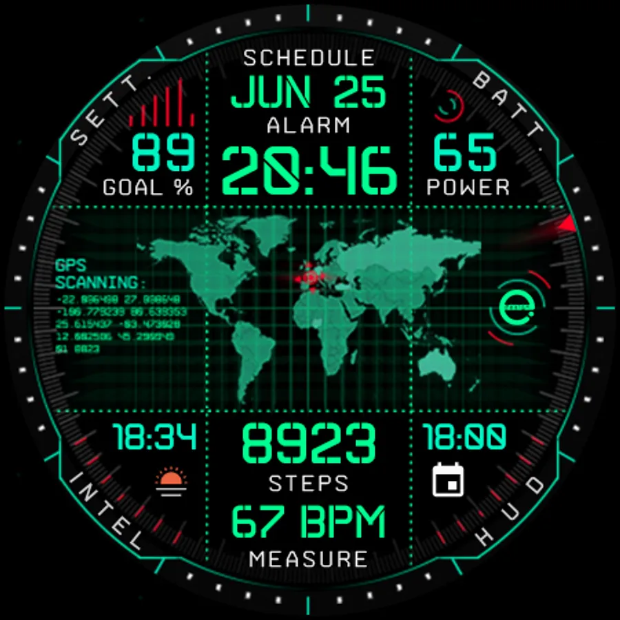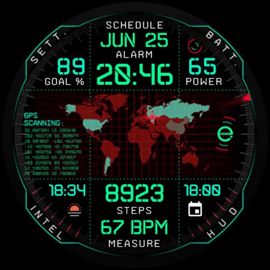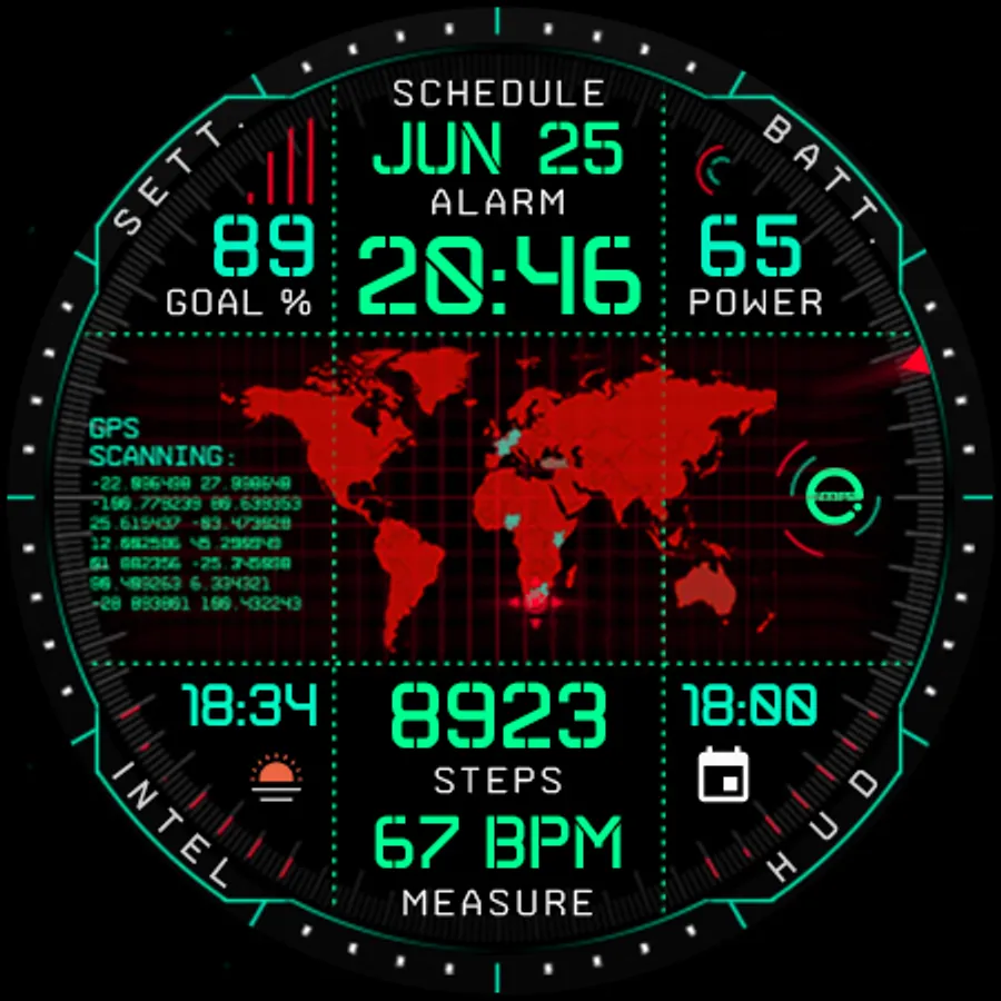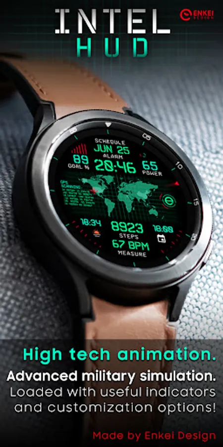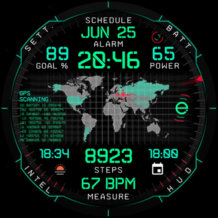 INTEL HUD is a modern digital watch face, featuring bleeding edge high tech animations with an incredible level of detail, simulating advanced military technology.