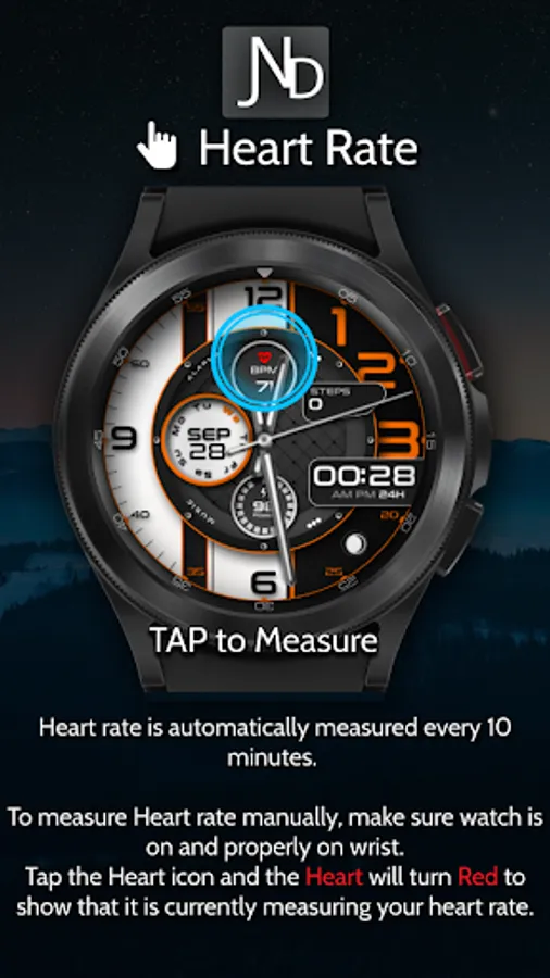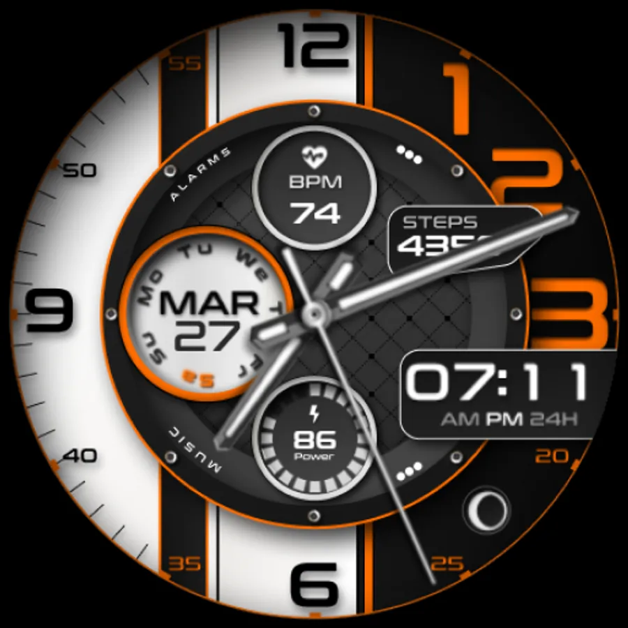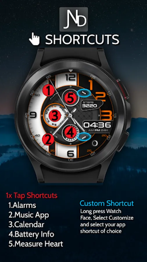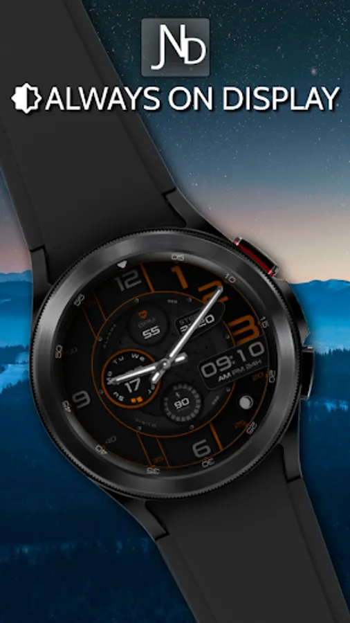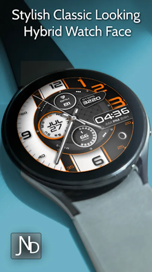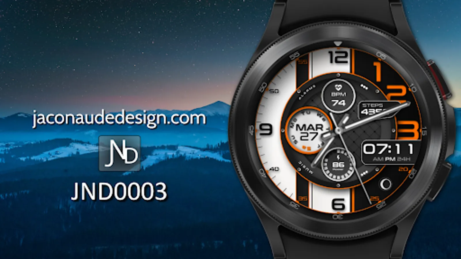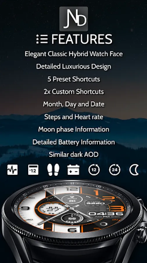 The JND0003 is a beautiful modern hybrid watch face with lots of information and a detailed design. Analog hands and Digital Time, Features include, 5 Shortcuts, 2 Customizable shortcuts, Battery, Date, Steps, Heart rate and Moon phase information. Support for 12 and 24 hours included. A similar dark mode AOD ensures great style and battery life. Thank you.