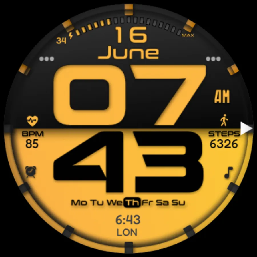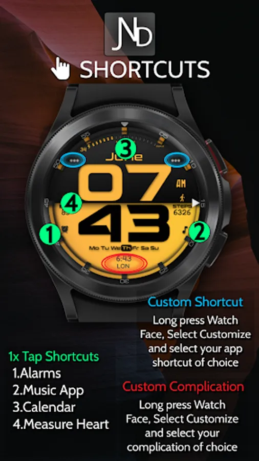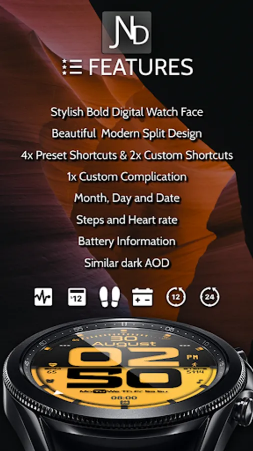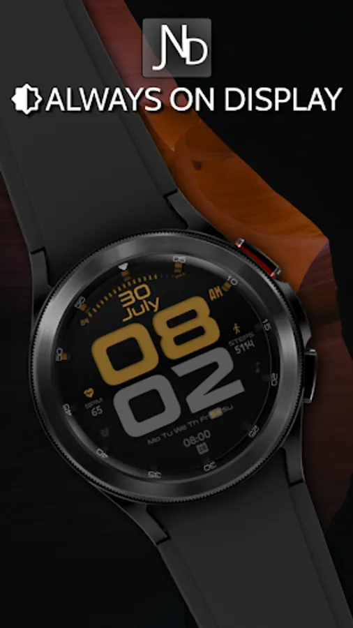 The JND0019 is a modern looking bold digital watch face with large bold digits and a stylish split design. Features include, 4 Shortcuts, 2 Customizable shortcuts, 1 Customizable complication, Battery, Date, Steps & Heart rate. A dark similar always on display ensures great style and battery life.