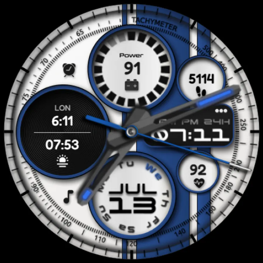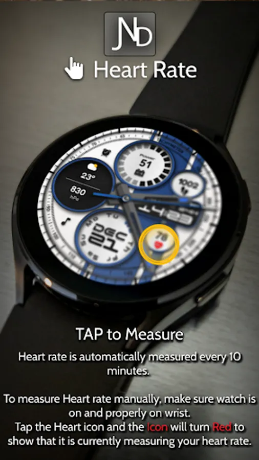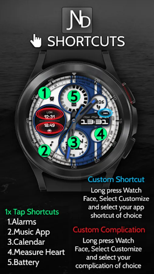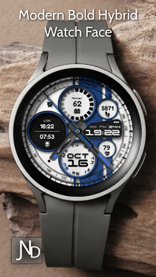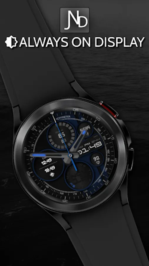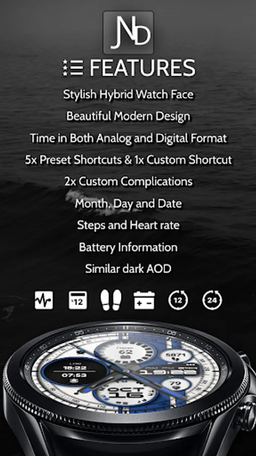 The JND0020 is a modern looking hybrid digital watch face with large bold analog hands, a detailed back and time in digital format as well. Features include, 5 Shortcuts, 1 Customizable shortcut, 2 Customizable complications, Battery, Date, Steps & Heart rate. A dark similar always on display ensures great style and battery life.