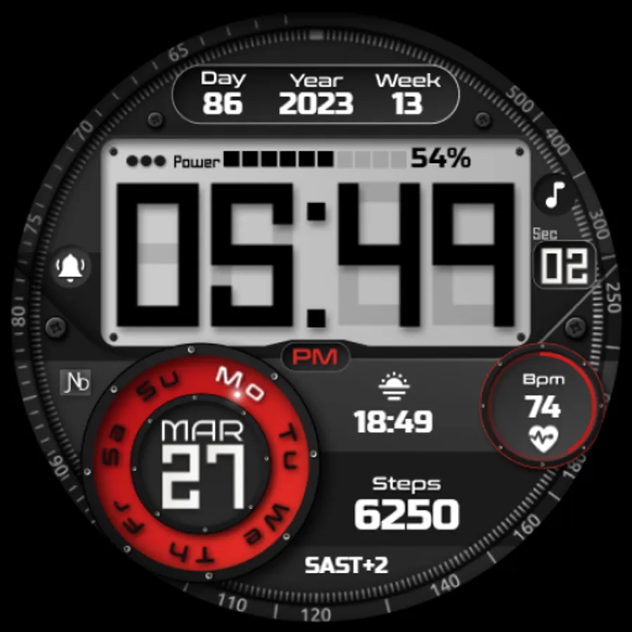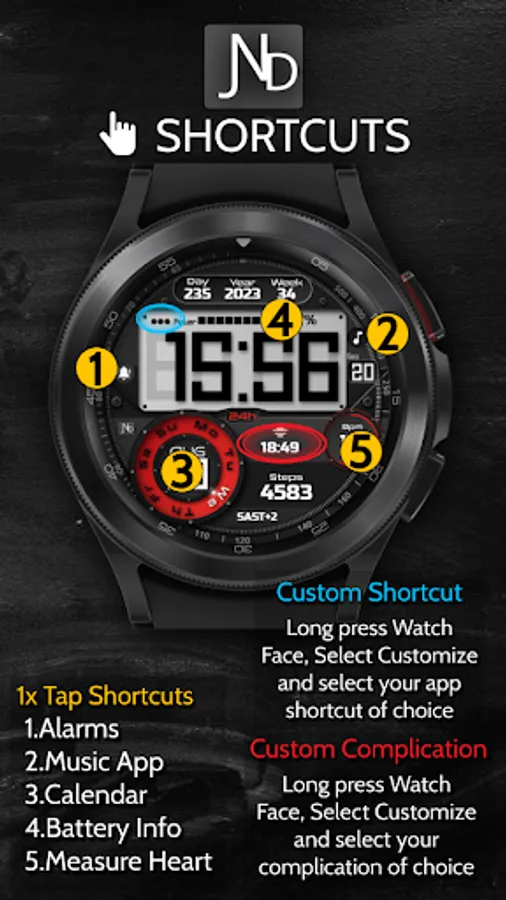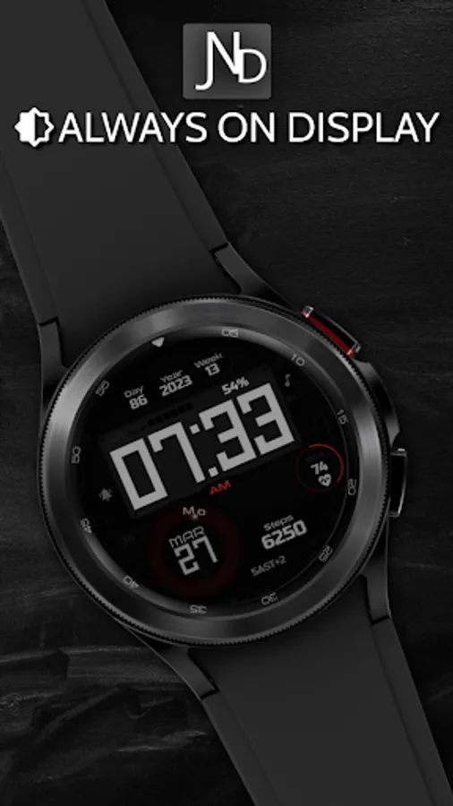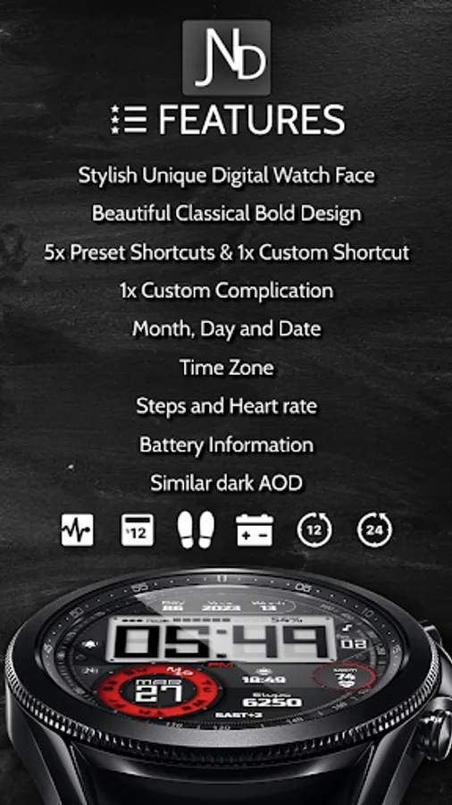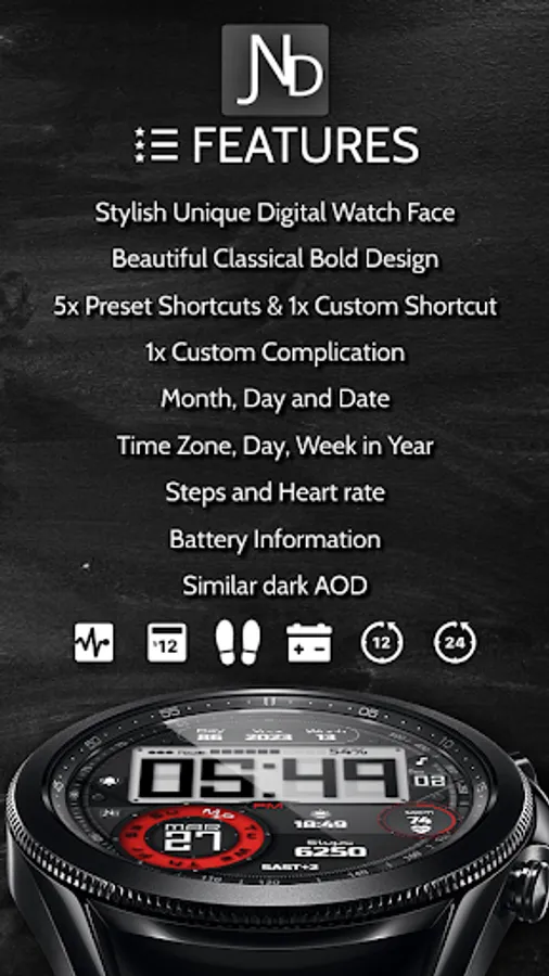 The JND0024 is a beautiful digital watch face with lots of information and a detailed luxurious design in a classic looking package. Large bold easy to read digits. Features include, 5x Shortcuts, 1x Customizable shortcut, 1x Customizable Complication, Battery info, Date, Time Zone, Day and Week in Year, Steps, Heart rate and Moon phase information. The face includes 12 & 24Hr versions. A dark always on display ensures great style and battery life. Thank you.