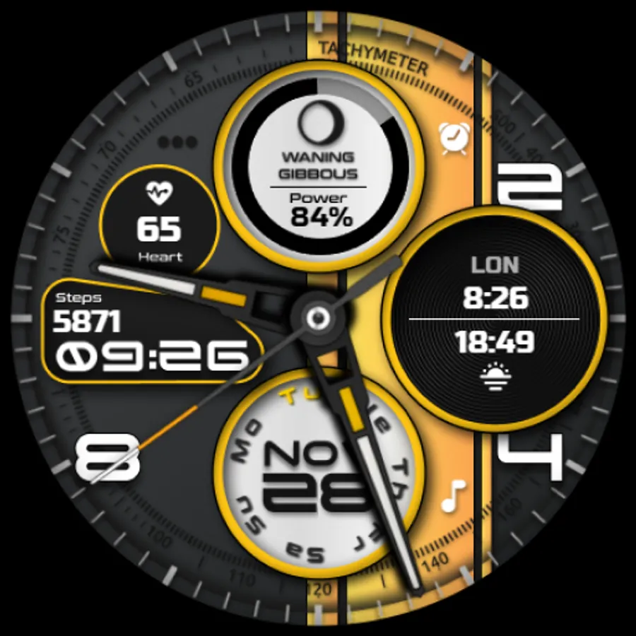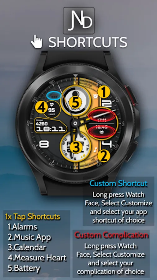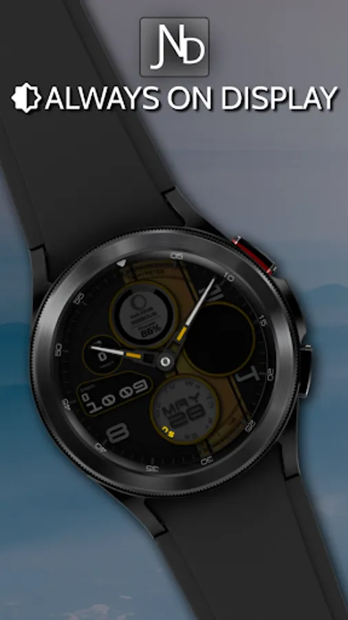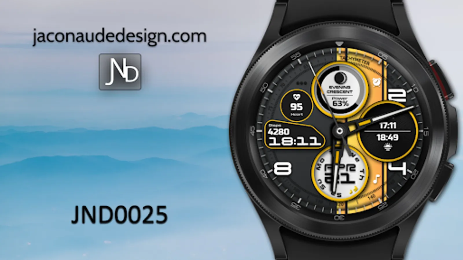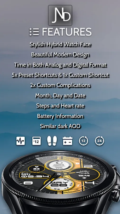 The JND0025 is a modern looking hybrid digital watch face with large bold analog hands, a detailed back and time in digital format as well. Features include, 5 Shortcuts, 1 Customizable shortcut, 2 Customizable complications, Battery, Date, Steps & Heart rate. A dark similar always on display ensures great style and battery life.