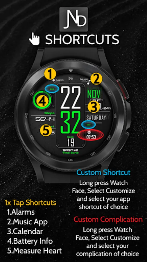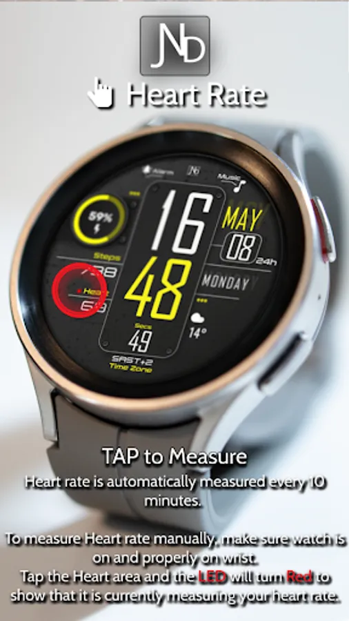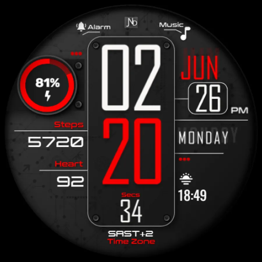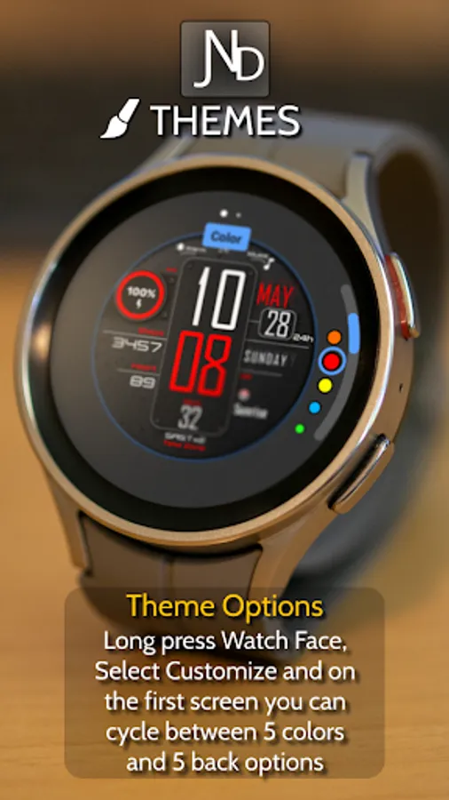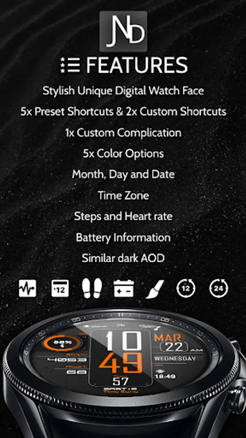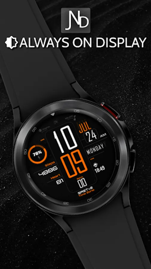 The JND0027 is a modern looking digital watch face with large bold digits and a minimalistic look. Great design and an everyday watch face for every occasion. Features include, 5 Shortcuts, 2 Customizable shortcuts, 1 Customizable Complication, 5 color options, Battery, Date, Time Zone, Steps & Heart rate. A similar always on display ensures great style all day long.