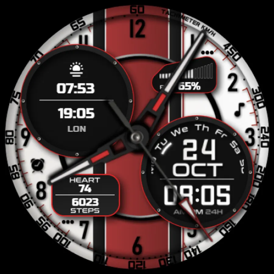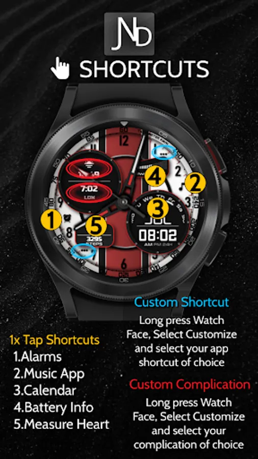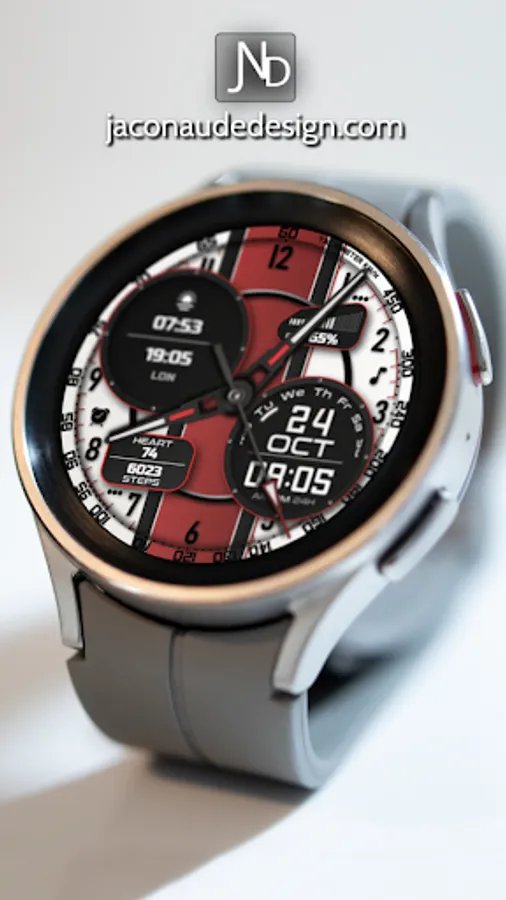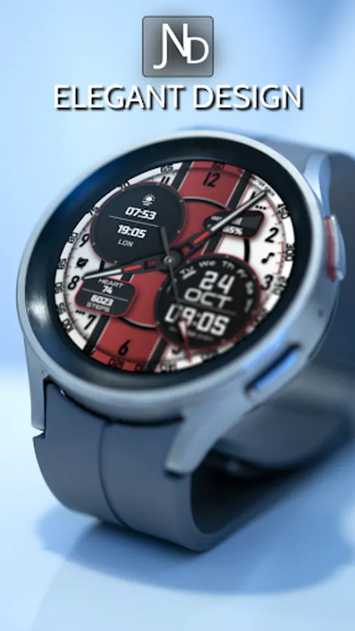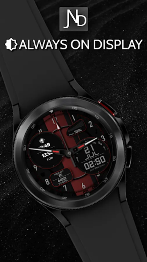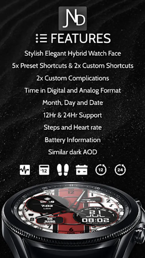 The JND0031 is a great looking modern hybrid watch face with both analog and digital format and a detailed design. Stylish and elegant looking watch face. Features include, 5 Shortcuts, 2 Customizable shortcuts, 2 Customizable Complications, Battery, Date, Steps & Heart rate, 12 &24 Hour Support. A similar always on display ensures great style all day long.