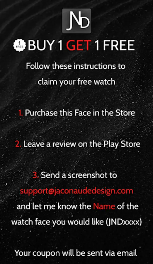 If you stuck at payment loop, or if the face does not show on the watch, DO NOT WORRY, only one charge will be made even if you are asked to pay a second time. Wait 5 minutes or restart your watch and try again. You can also connect to Wi-Fi on your watch and search for JND0031 and install it from the watch, you will also not be charged again this way.