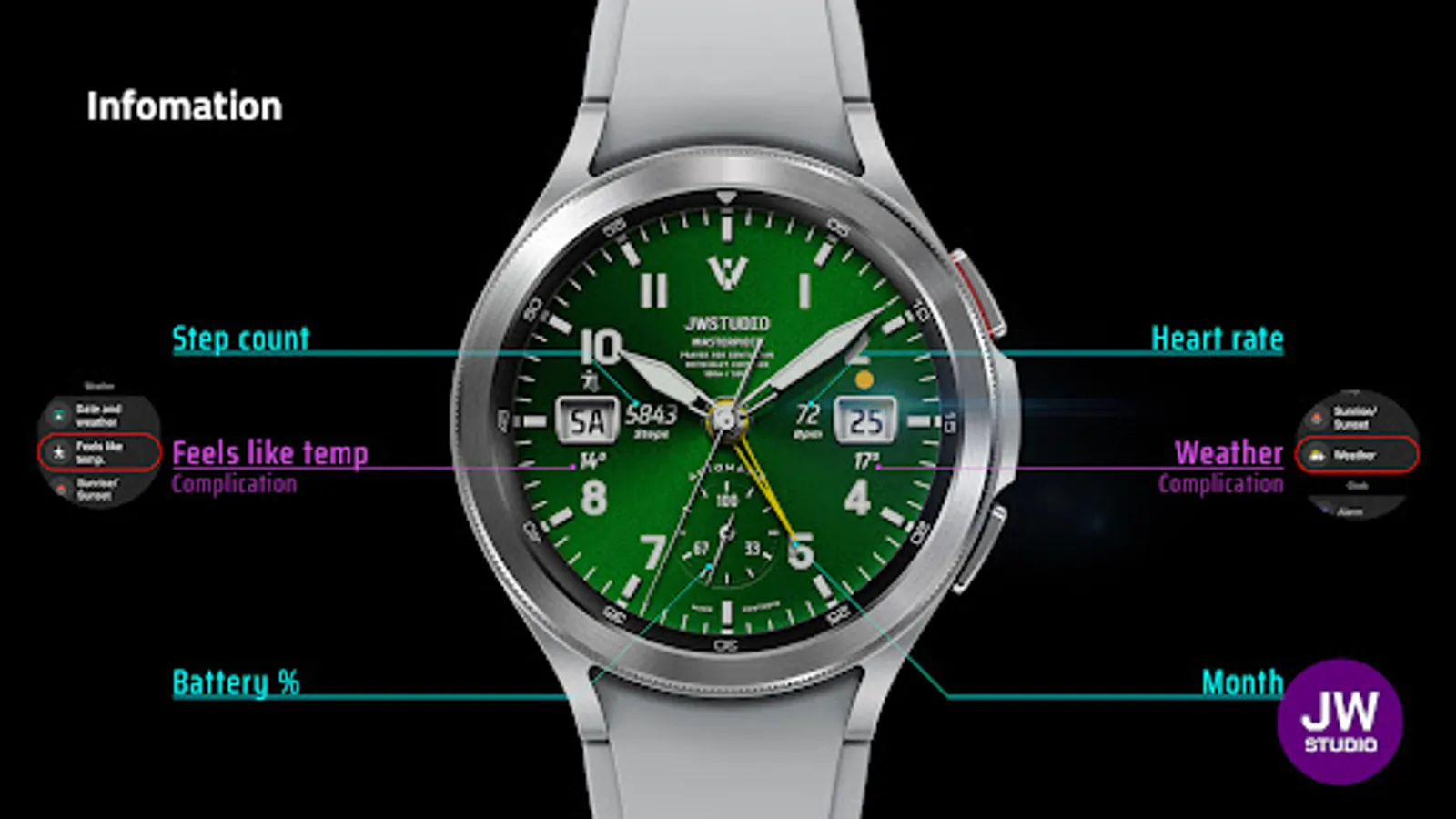 * 이 시계 모드는 Samsung Galaxy Watch 4와 같은 새로운 Wear Os Google / One UI Samsung 운영 체제 기반 장치용 Samsung의 새로운 "Watch Face Studio" 도구로 개발되었습니다.