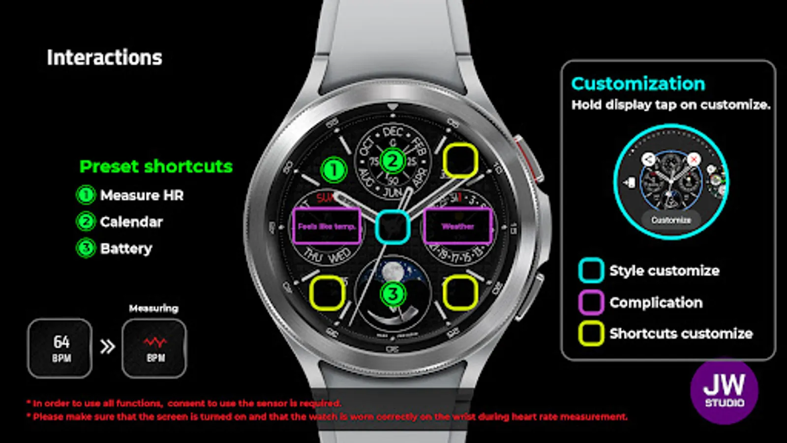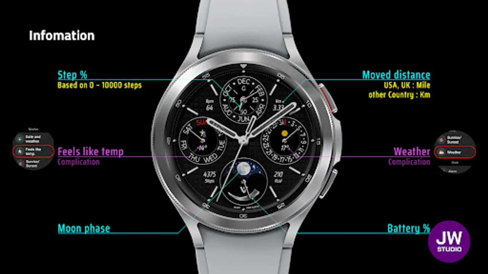 * 이 시계 모드는 Samsung Galaxy Watch 4와 같은 새로운 Wear Os Google / One UI Samsung 운영 체제 기반 장치용 Samsung의 새로운 "Watch Face Studio" 도구로 개발되었습니다.