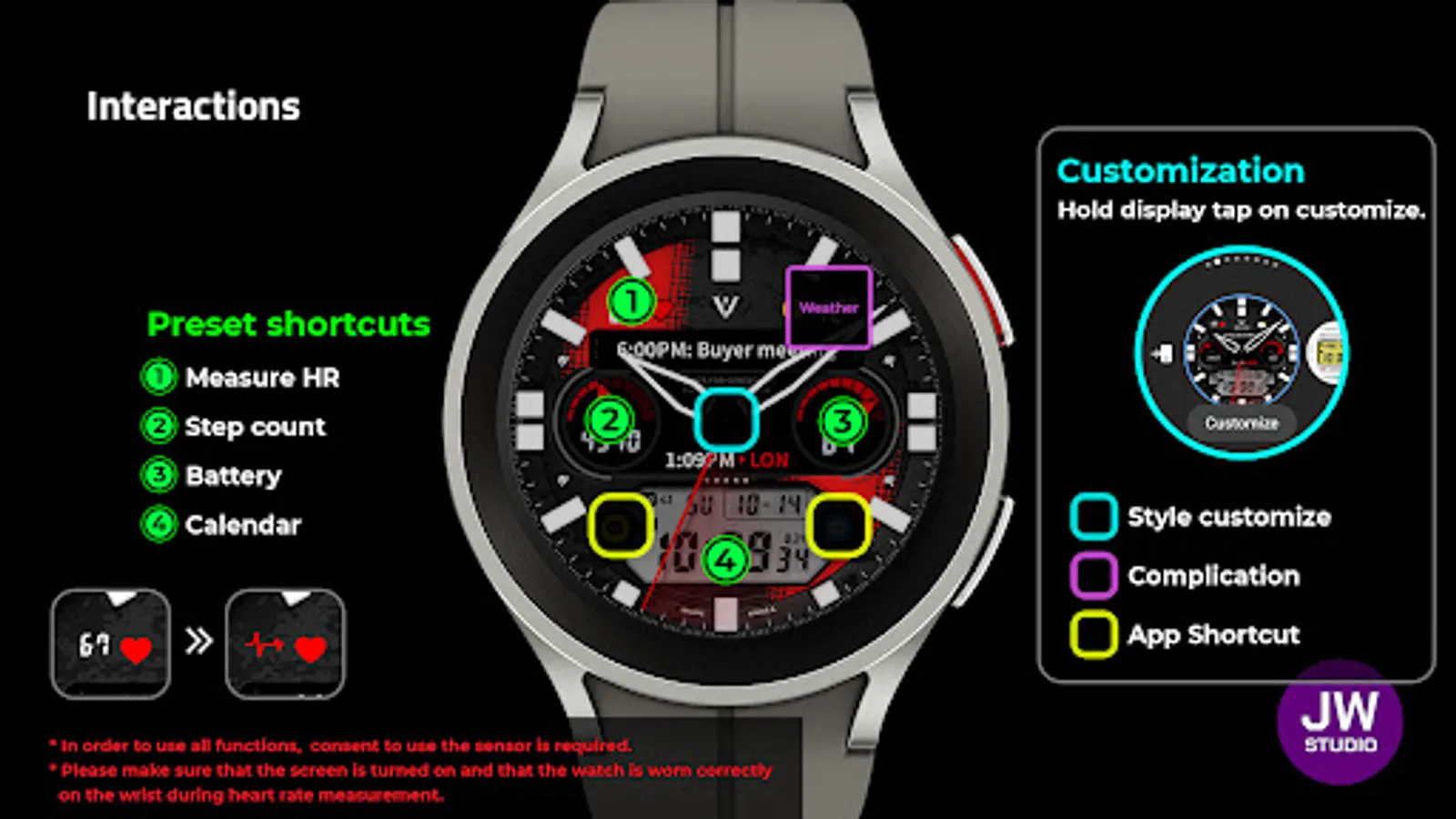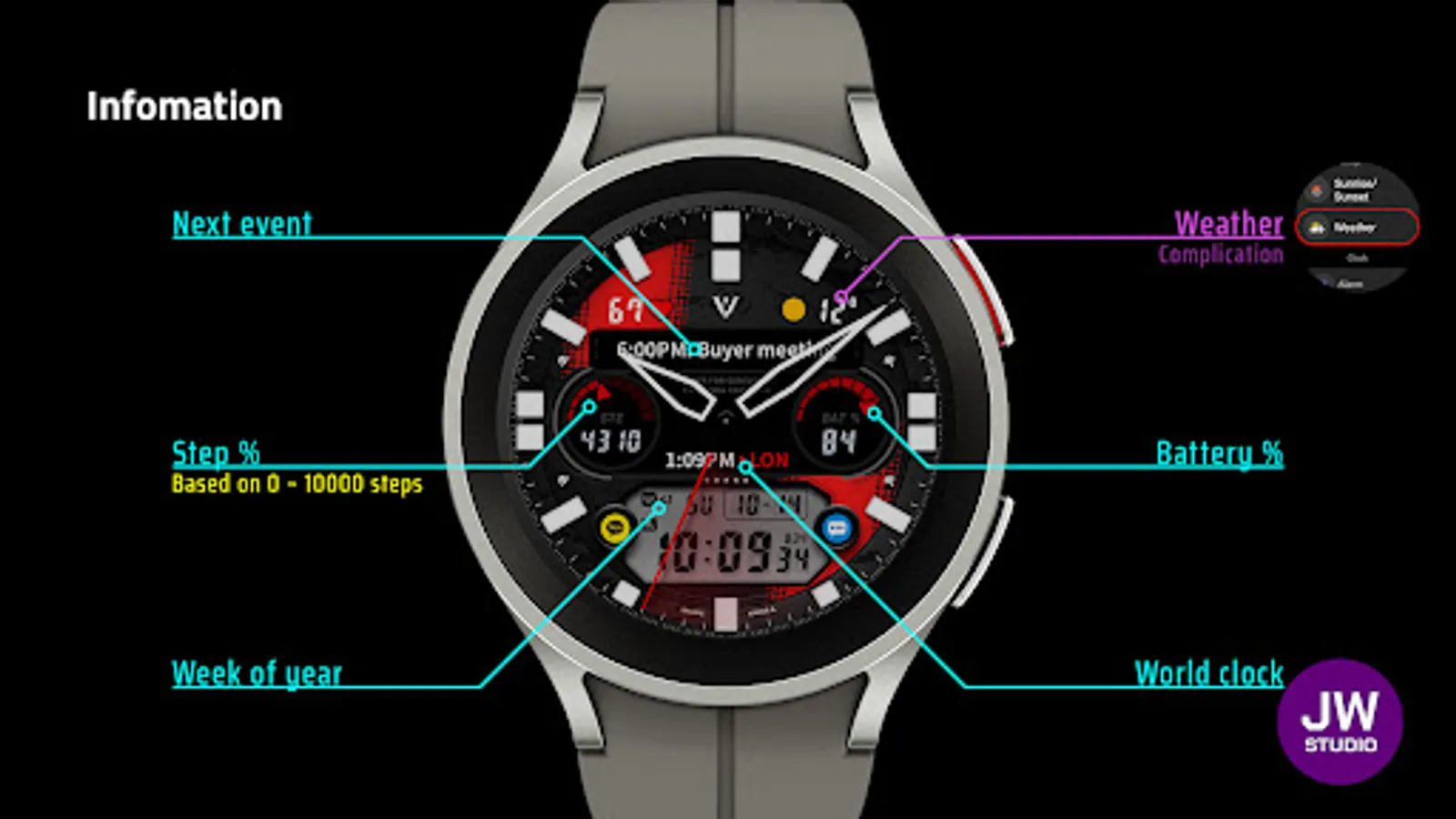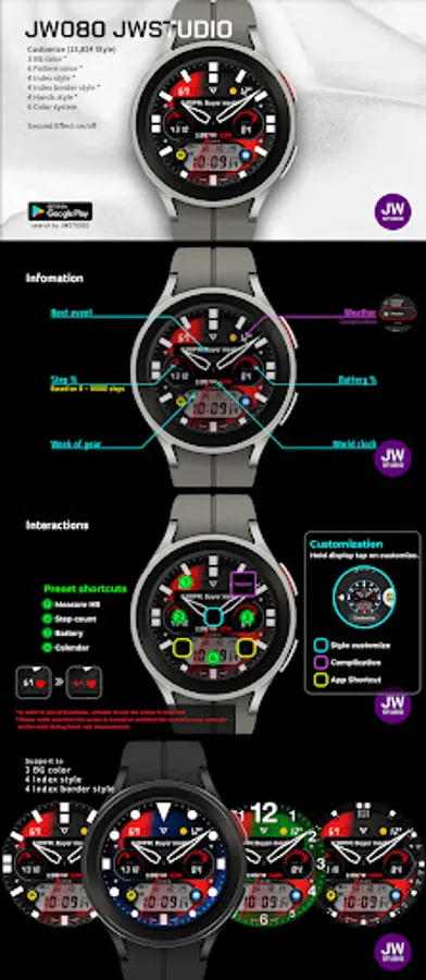 * 이 시계 모드는 Samsung Galaxy Watch 4와 같은 새로운 Wear Os Google / One UI Samsung 운영 체제 기반 장치용 Samsung의 새로운 "Watch Face Studio" 도구로 개발되었습니다.