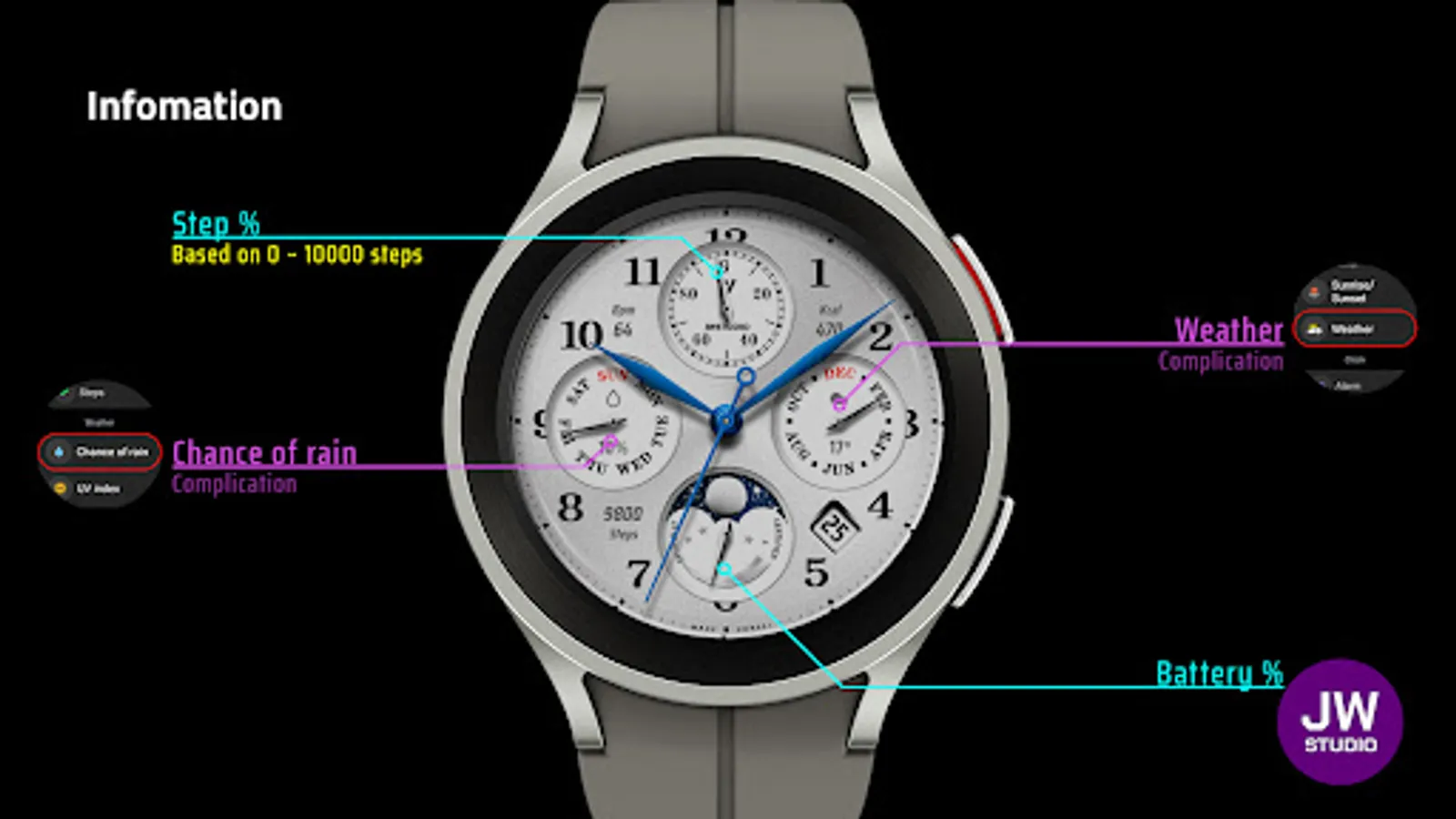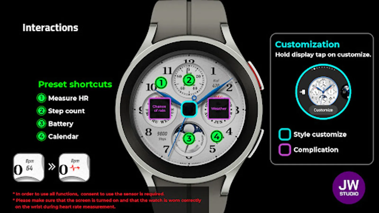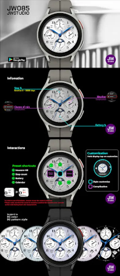 * 이 시계 모드는 Samsung Galaxy Watch 4와 같은 새로운 Wear Os Google / One UI Samsung 운영 체제 기반 장치용 Samsung의 새로운 "Watch Face Studio" 도구로 개발되었습니다.