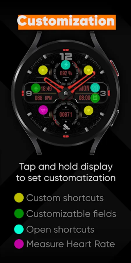 - Hybrid WF with customizable shortcuts, fixed shortcuts for calendar, favorite contacts and energy consumption information. The heart rate is measured by clicking on the label.