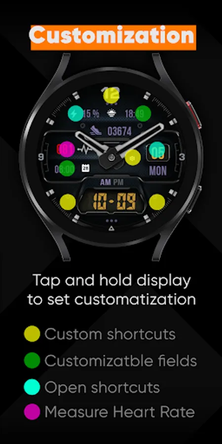 - Hybrid WF with multiple customizable shortcuts, two fixed calendar shortcuts and energy consumption information. The heart rate is measured by clicking on the label.