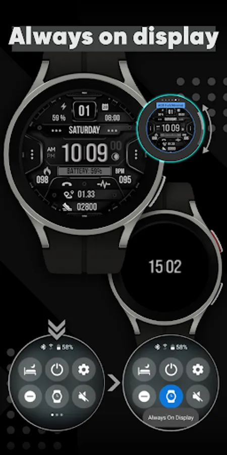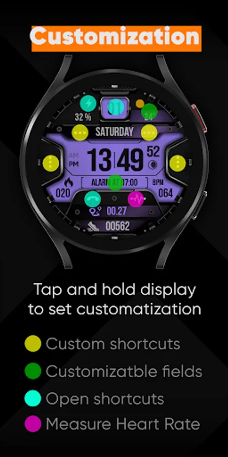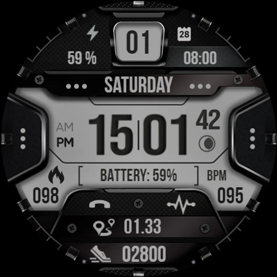 - WF with multiple customizable shortcuts, 3 fixed calendar shortcuts, energy consumption information and favorite contacts. The heart rate is measured only by clicking on the label.