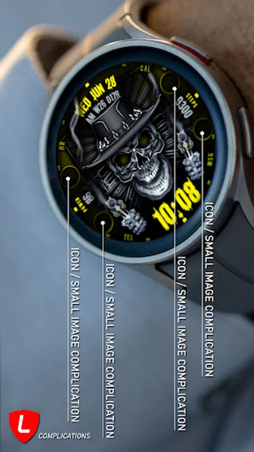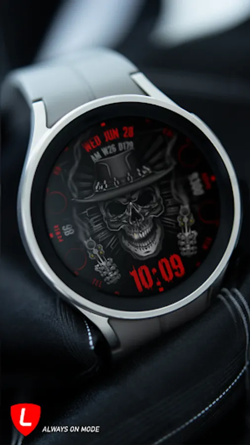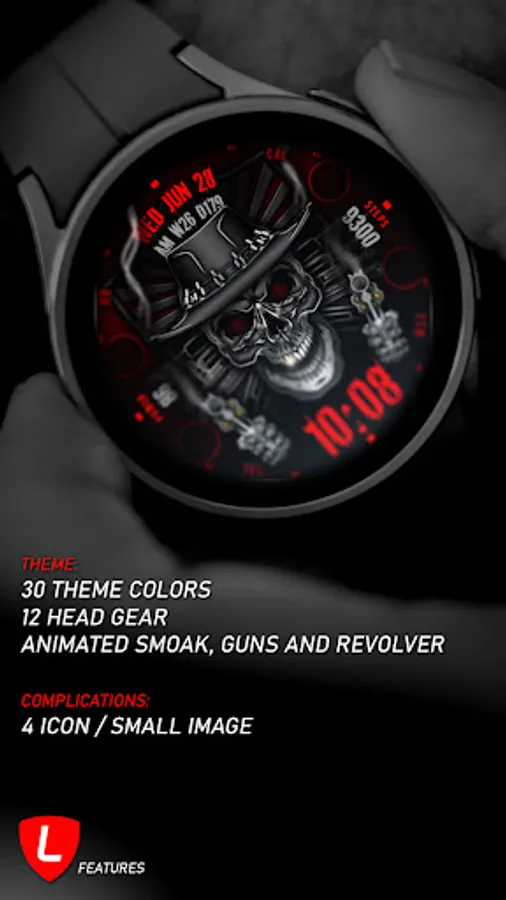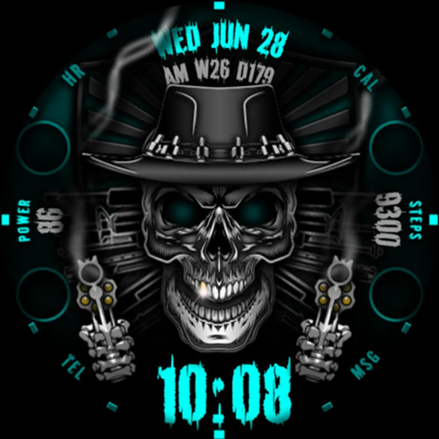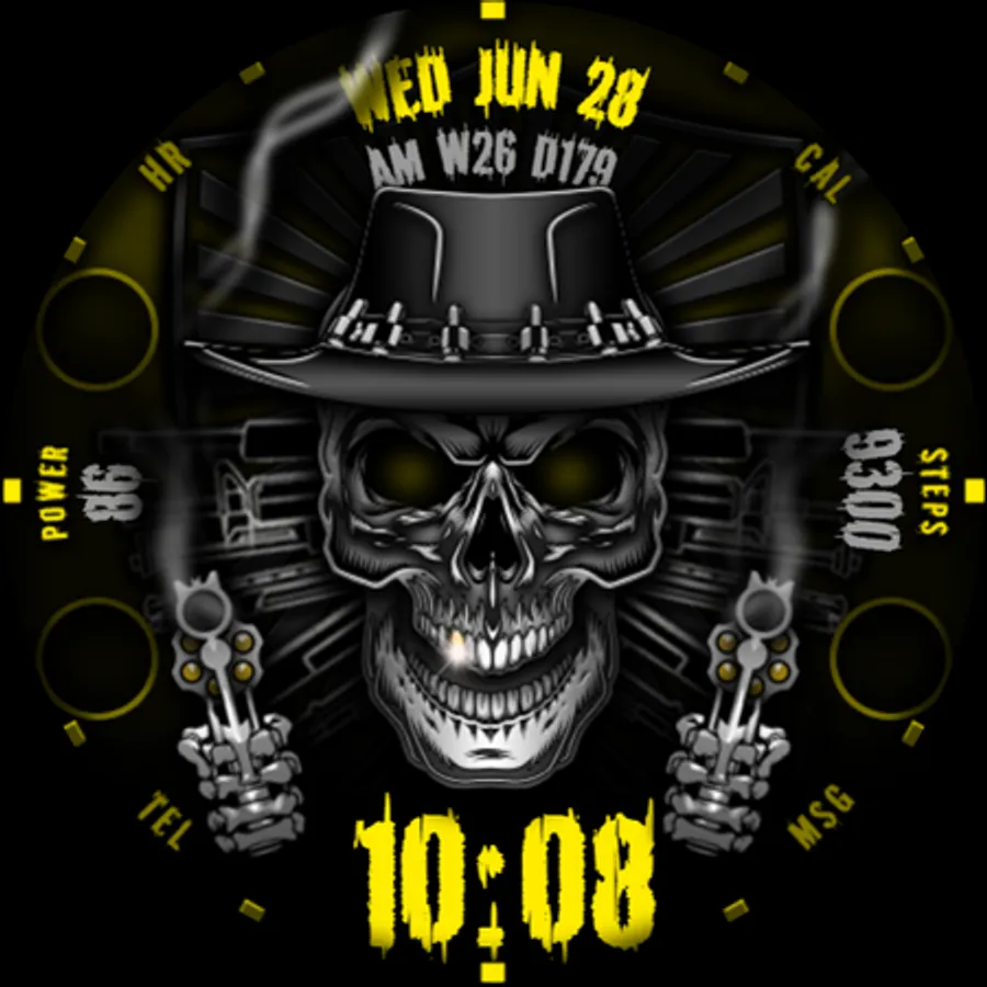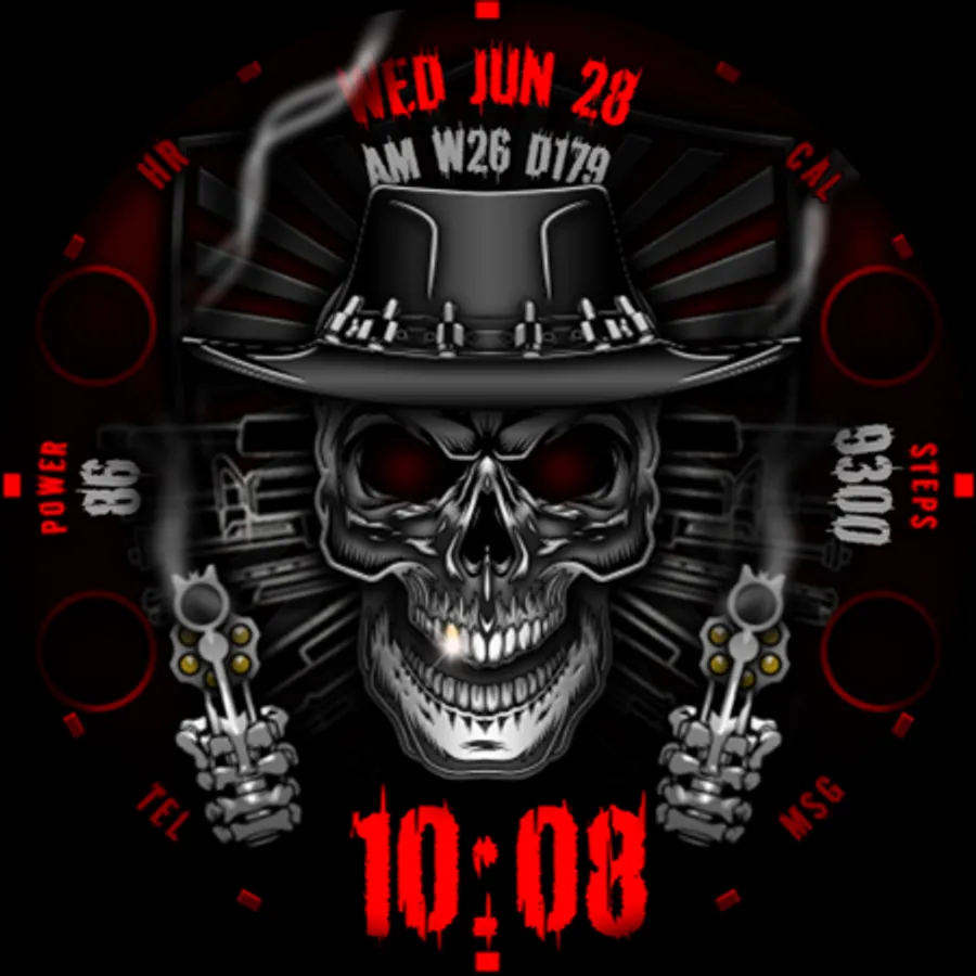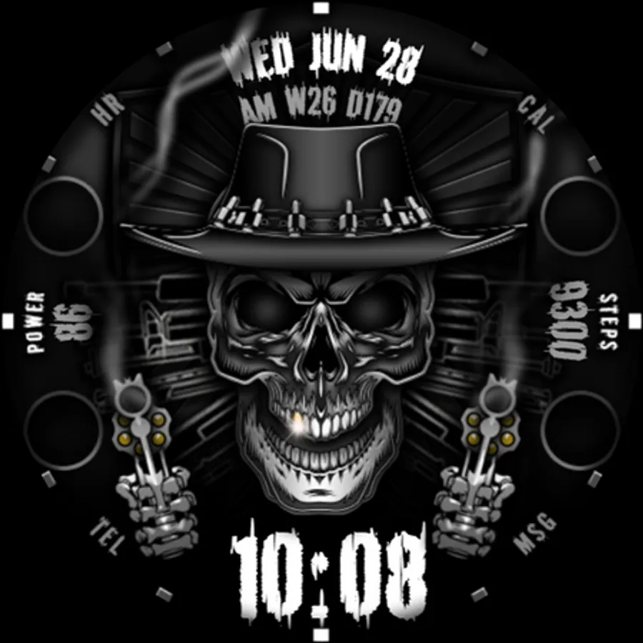 Handcrafted animated Skull & Guns watch face is full of animated graphics. It looks horrifying and dreadful.
